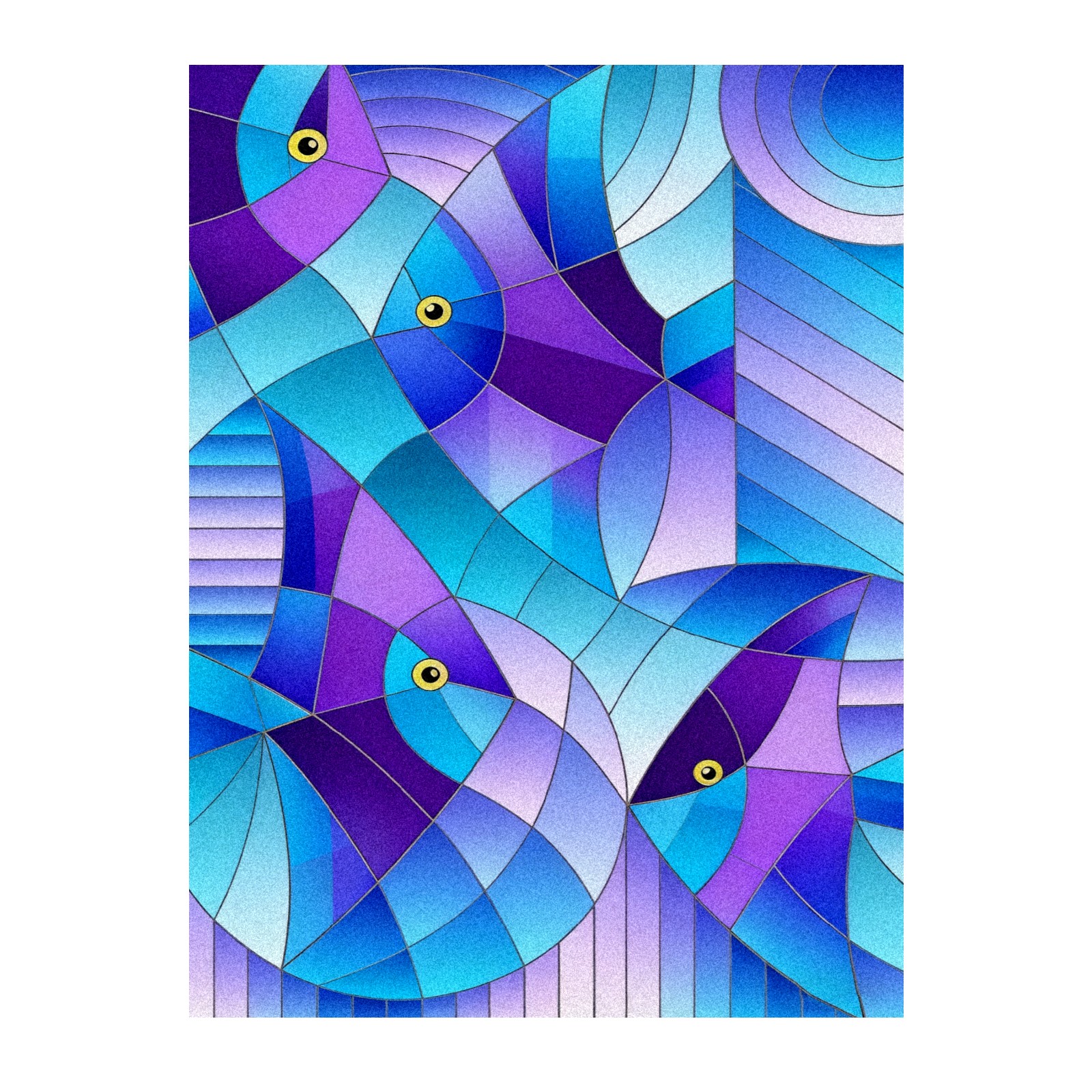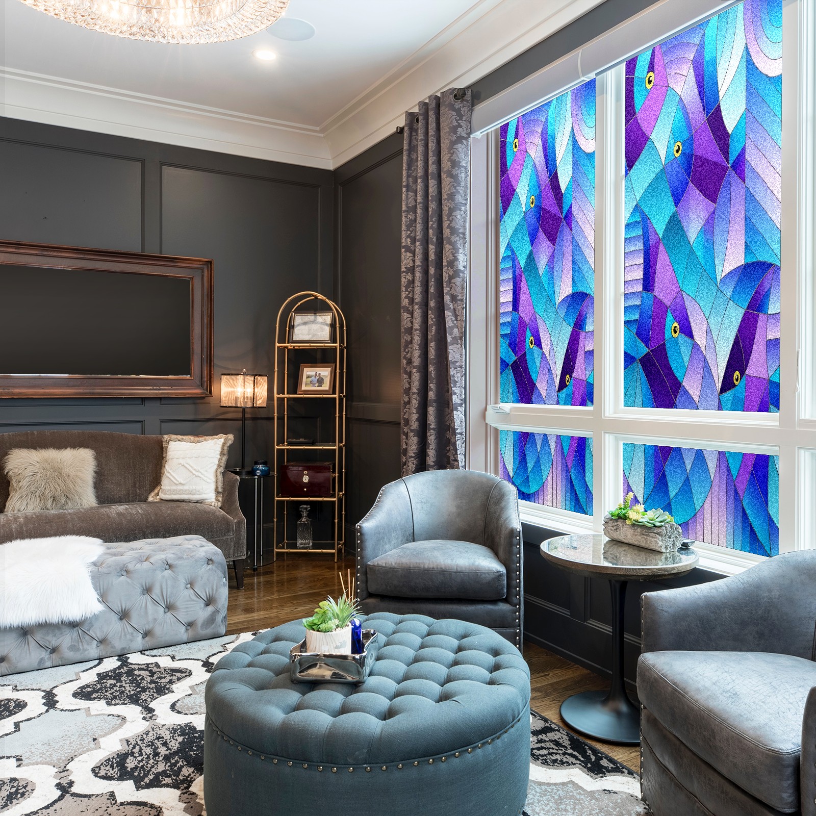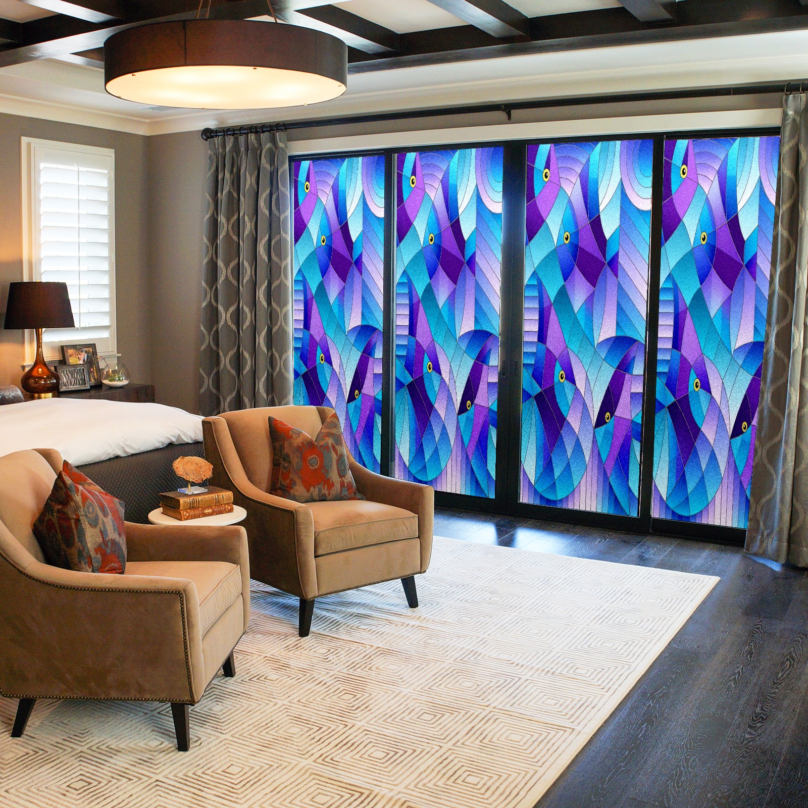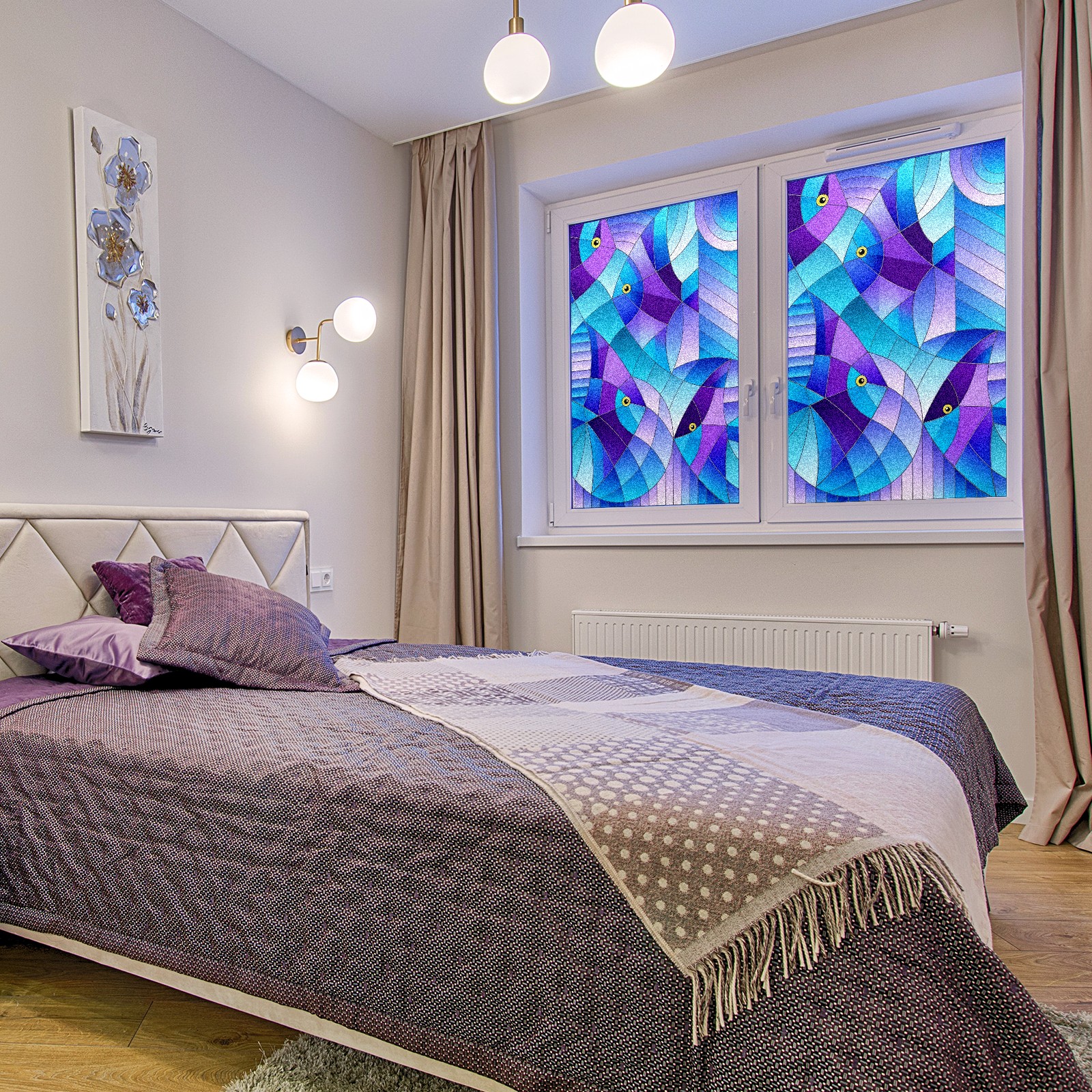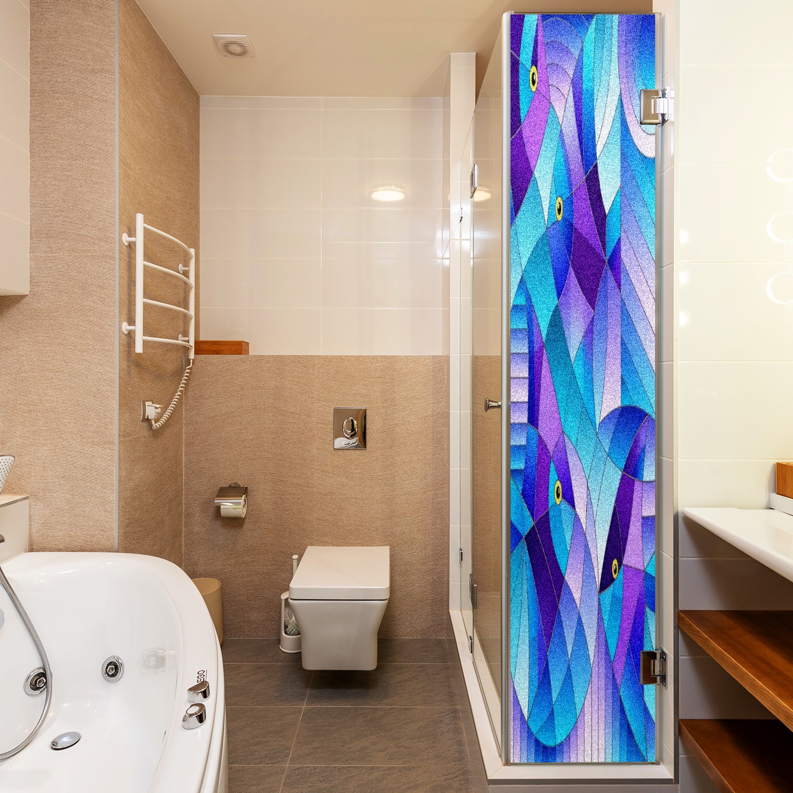 Counullo Frosted Glass Privacy Window Film, Blue Geometry Fish Non Adhesive Static Cling, Reusable PET Window Sticker for Bathroom Shower Door Bedroom Office Living Room (17.7x23.6in)