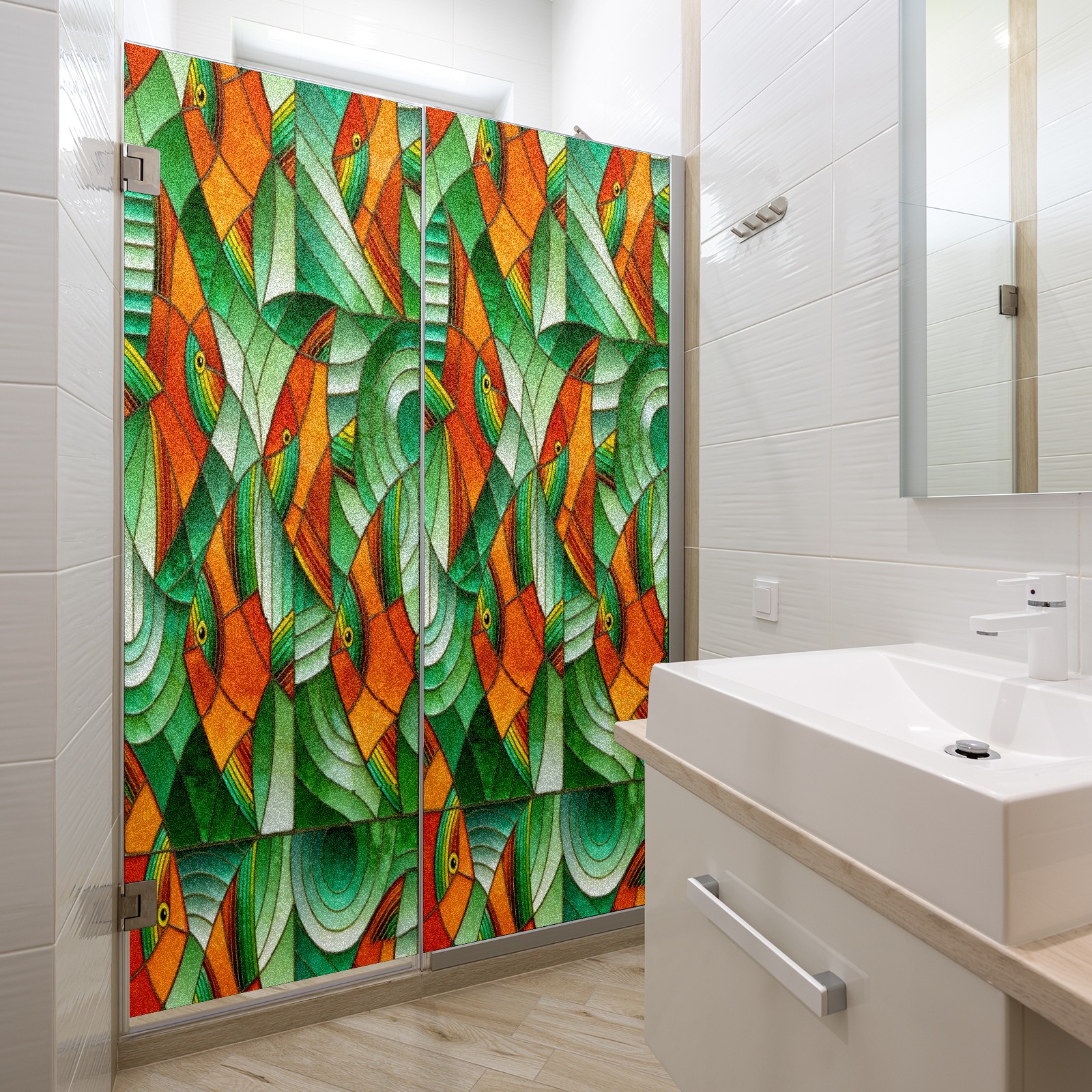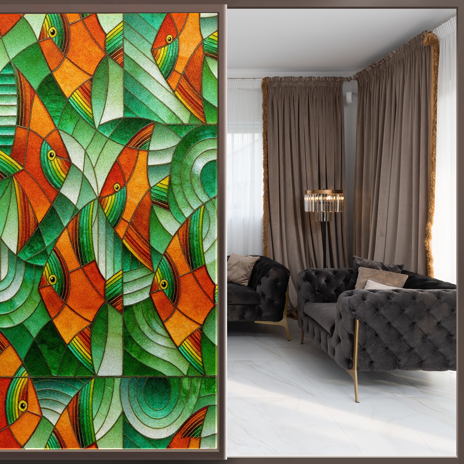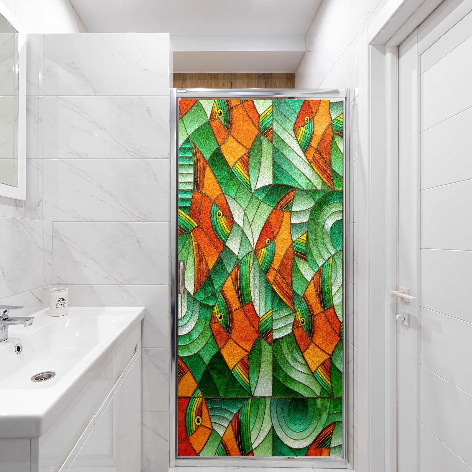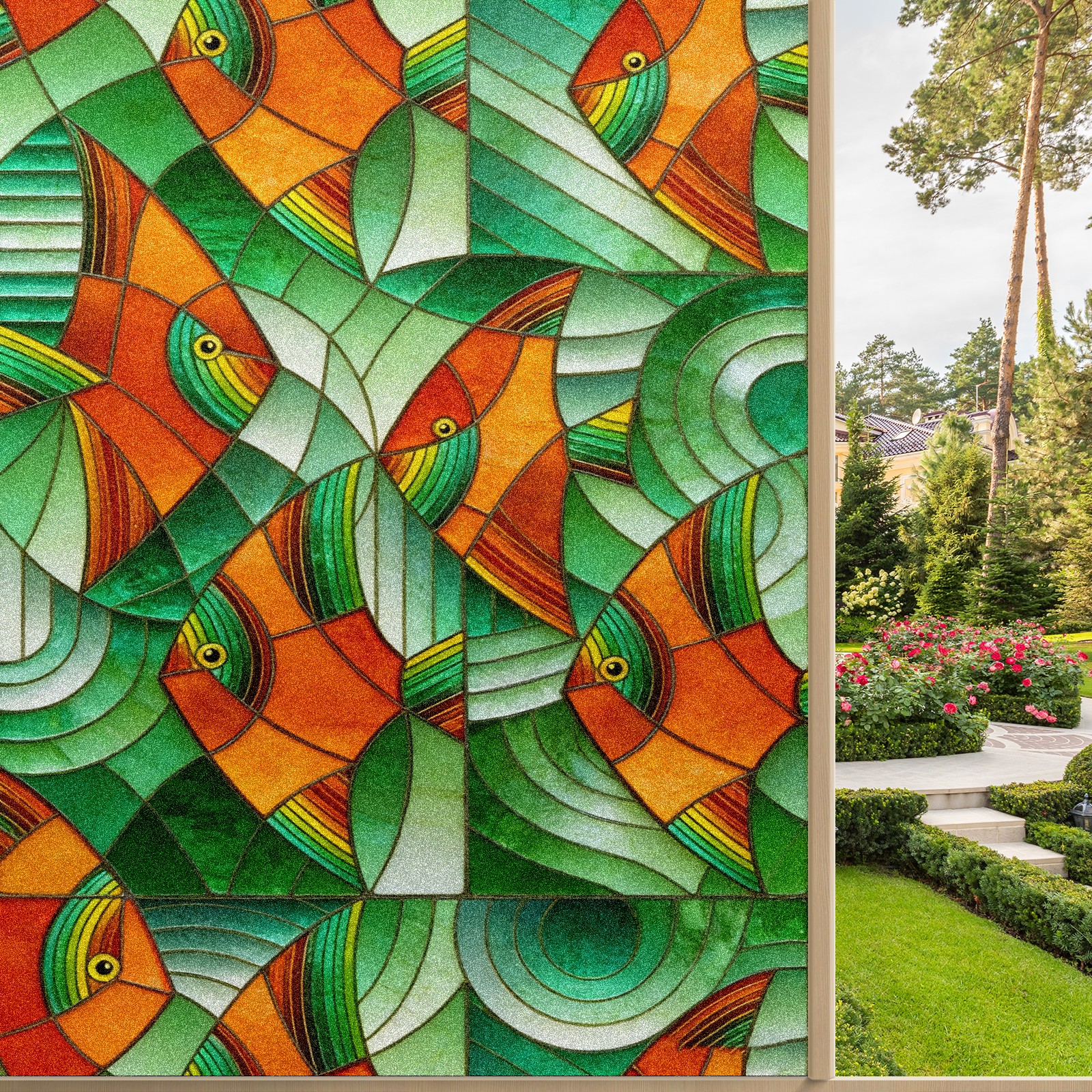 Counullo Frosted Glass Privacy Window Film, Green Geometry Fish Non Adhesive Static Cling, Reusable PET Window Sticker for Bathroom Shower Door Bedroom Office Living Room (17.7x23.6in)