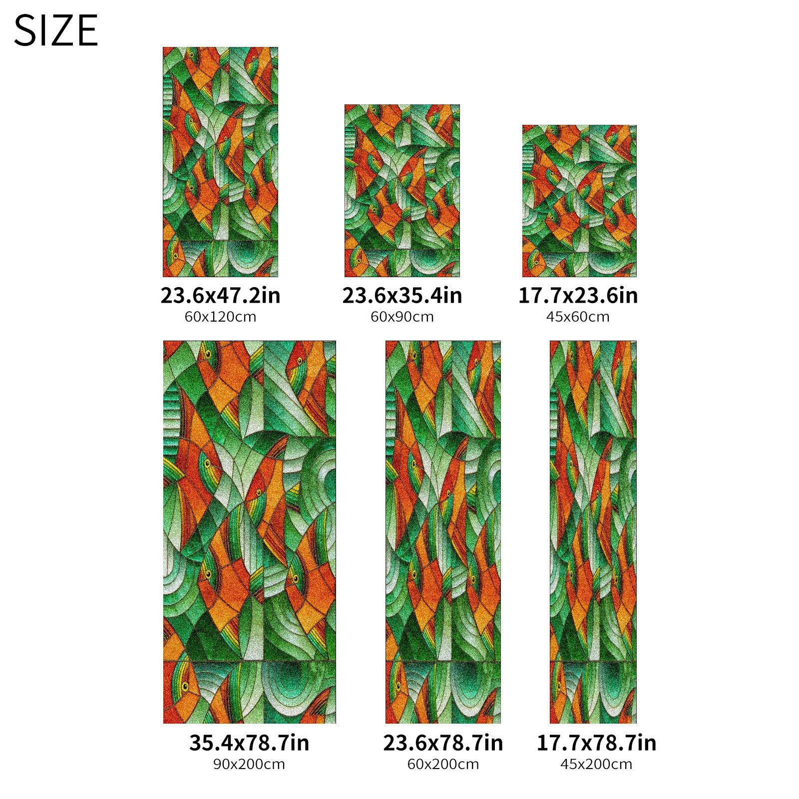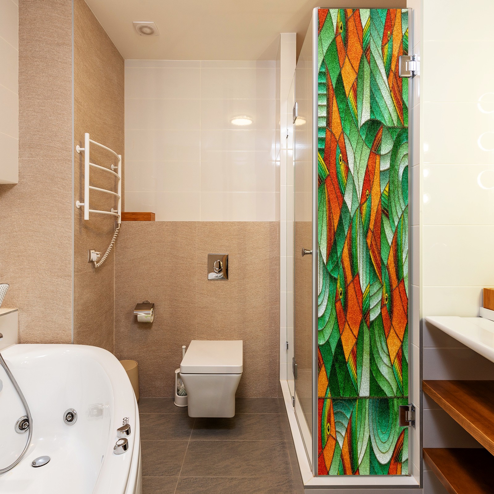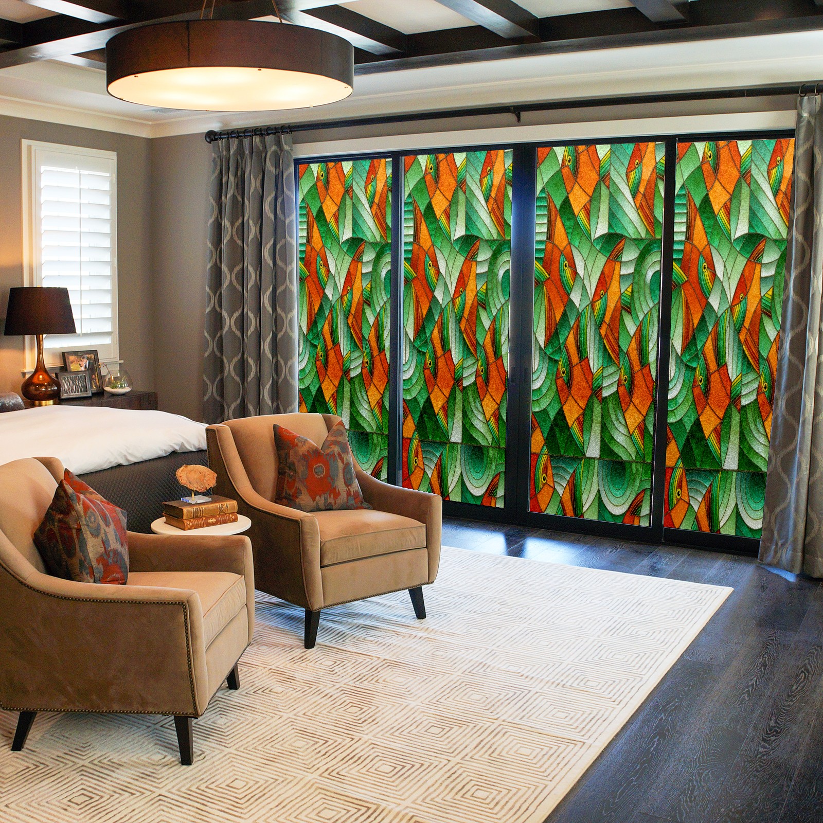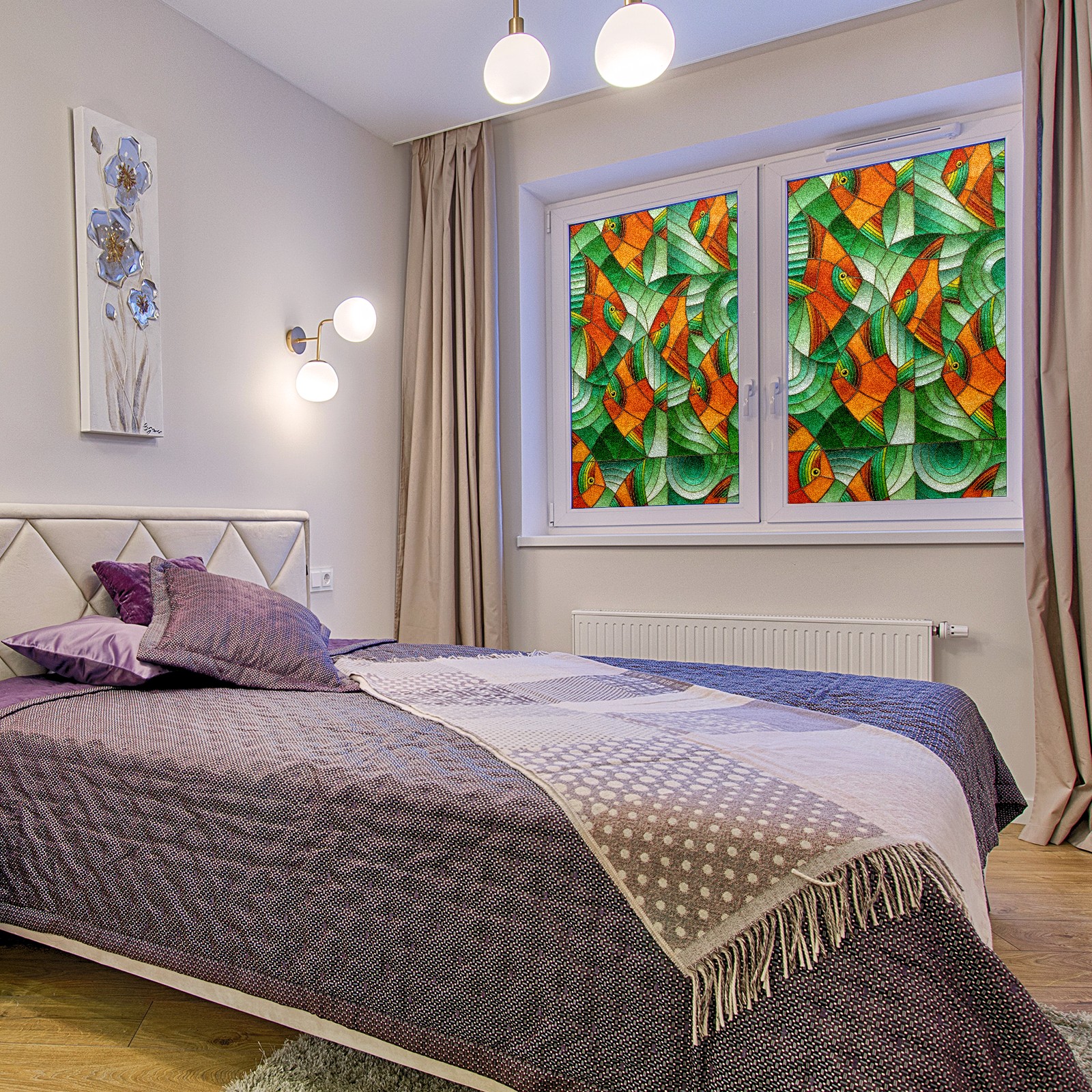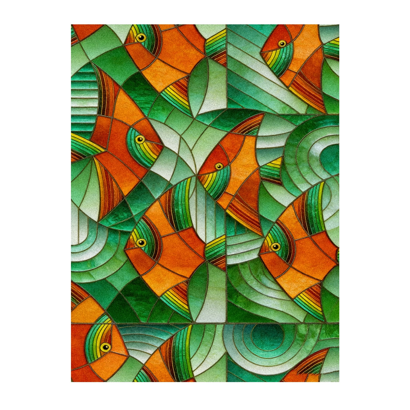 Counullo Frosted Glass Privacy Window Film, Green Geometry Fish Non Adhesive Static Cling, Reusable PET Window Sticker for Bathroom Shower Door Bedroom Office Living Room (17.7x23.6in)