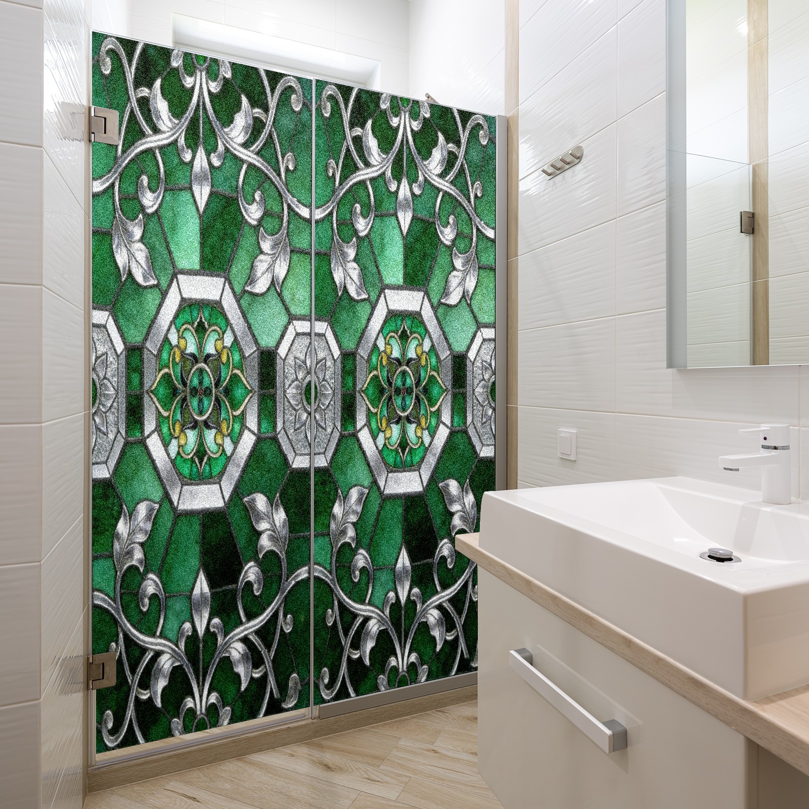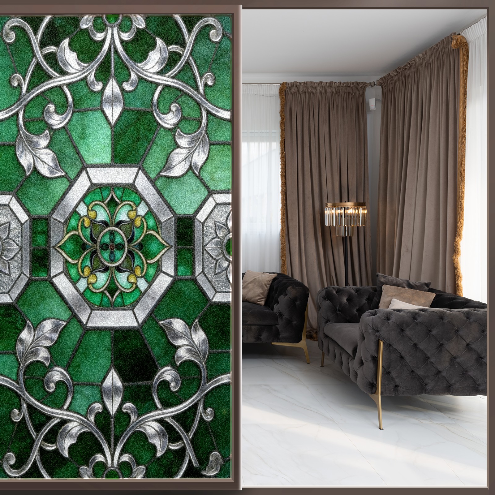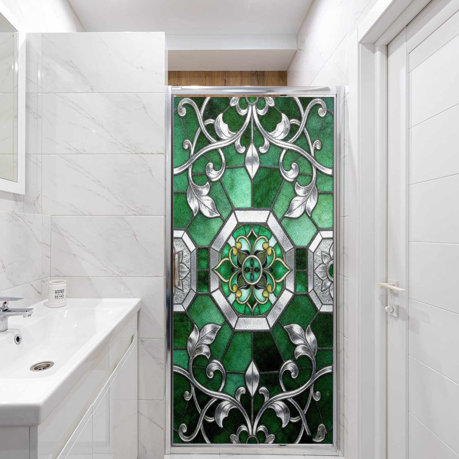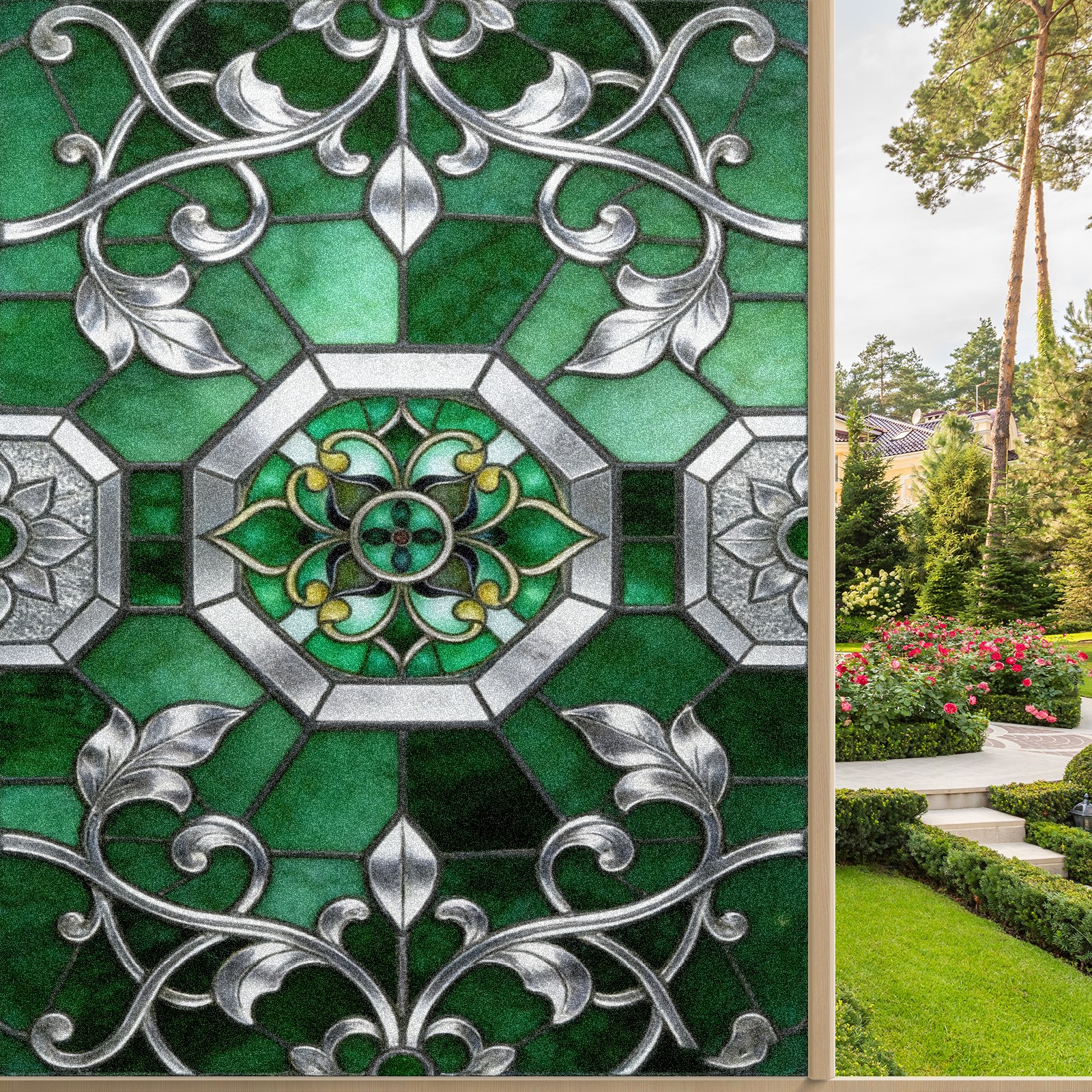 Counullo Frosted Glass Privacy Window Film, Quiet Floral Green Non Adhesive Static Cling, Reusable PET Window Sticker for Bathroom Shower Door Bedroom Office Living Room (17.7x23.6in)