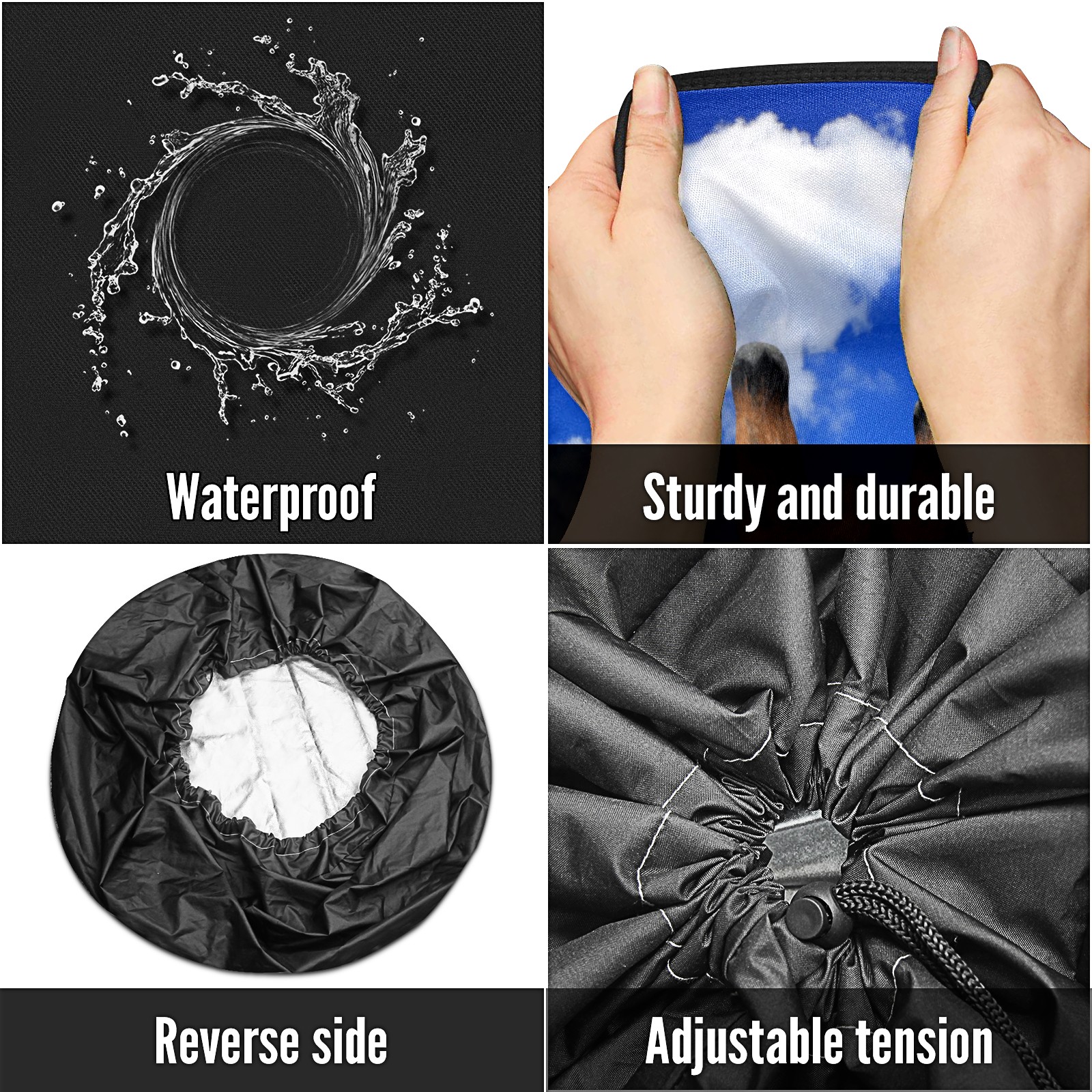 • Улучшите внешний вид вашего автомобиля и защитите шины с помощью этих универсальных водонепроницаемых чехлов для шин. Изготовленные из прочного полиэстера, они имеют водоотталкивающее покрытие, которое сохраняет шины чистыми и сухими в любых погодных условиях. Регулируемый нейлоновый шнурок обеспечивает плотное прилегание на различных размерах колес, делая установку быстрой и легкой. Односторонняя печать добавляет стильный акцент, а черные боковые панели предлагают элегантный, универсальный дизайн, который подходит для любого автомобиля. Идеально подходит для автомобилей, джипов, RVs, SUVs и многое другое, эти чехлы идеальны как для повседневного использования, так и для хранения. Лёгкие и складные, они легко хранятся, когда не нужны. Держите запасные шины в отличном состоянии и улучшите внешний вид вашего автомобиля с этими практичными и стильными чехлами. защитные колпаки для колес.