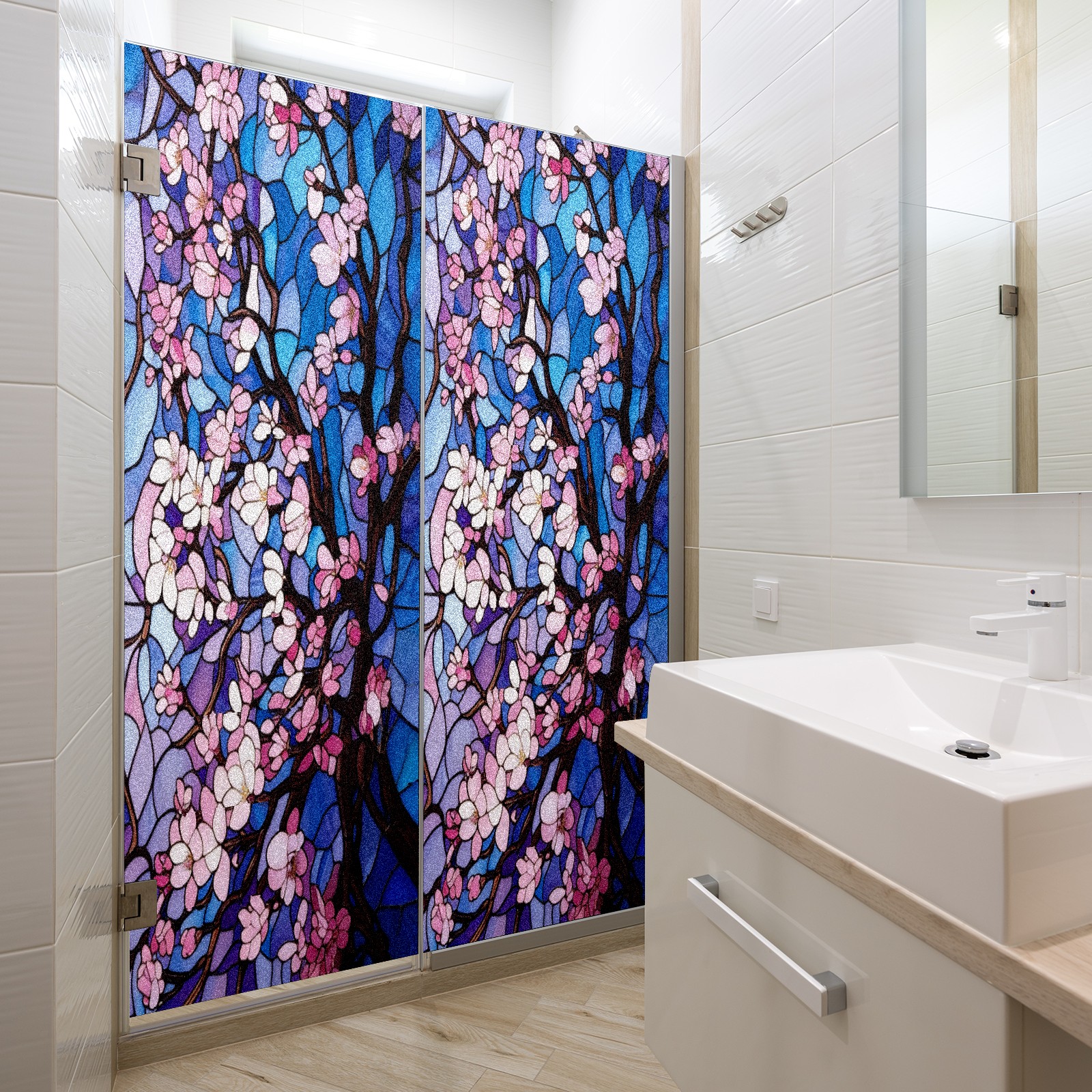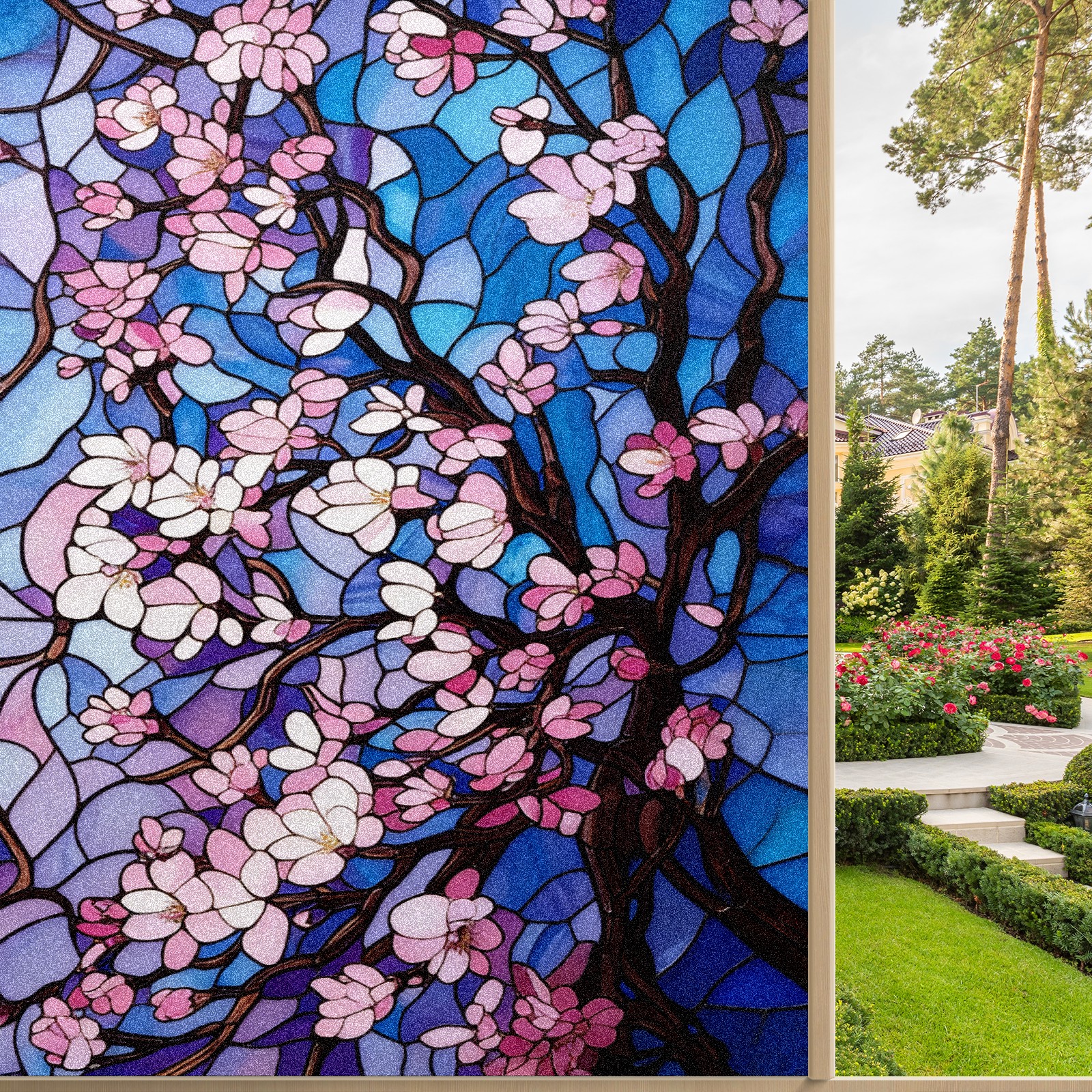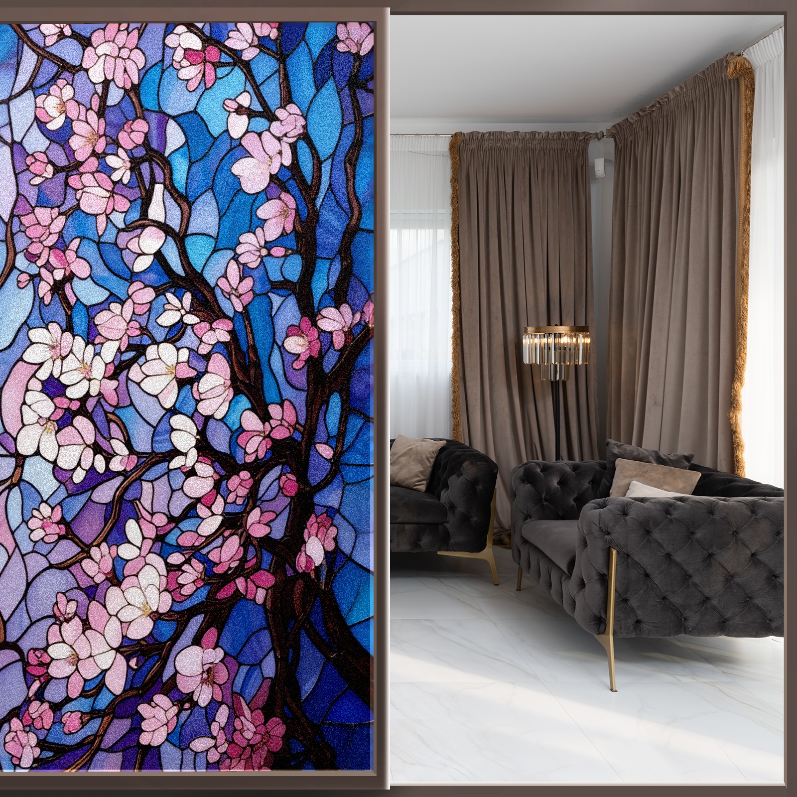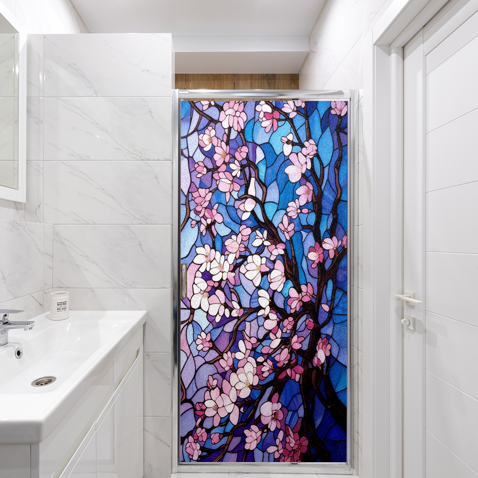 Counullo Frosted Glass Privacy Window Film, Cherry Blossom Blue Non Adhesive Static Cling, Reusable PET Window Sticker for Bathroom Shower Door Bedroom Office Living Room (17.7x23.6in)