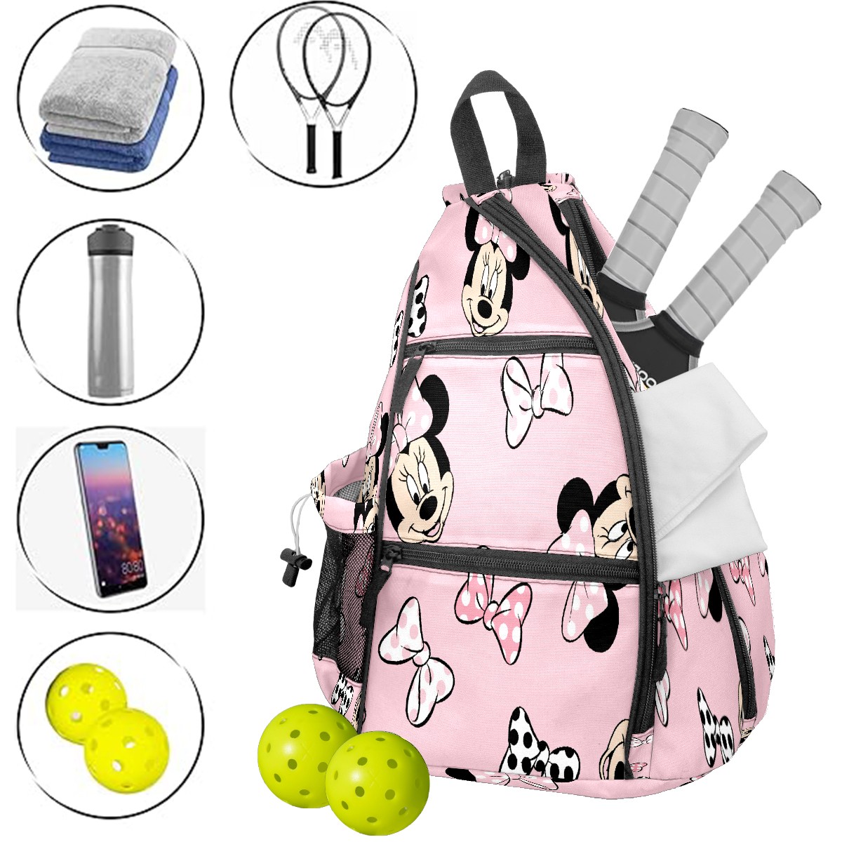 Multifunctional Pickleball Bag,Large Capacity Sports Pickleball Racket Bag, Water Bottle Holder and Fence Hook,Suitable for Both Men Women -Pink Mouse Bows