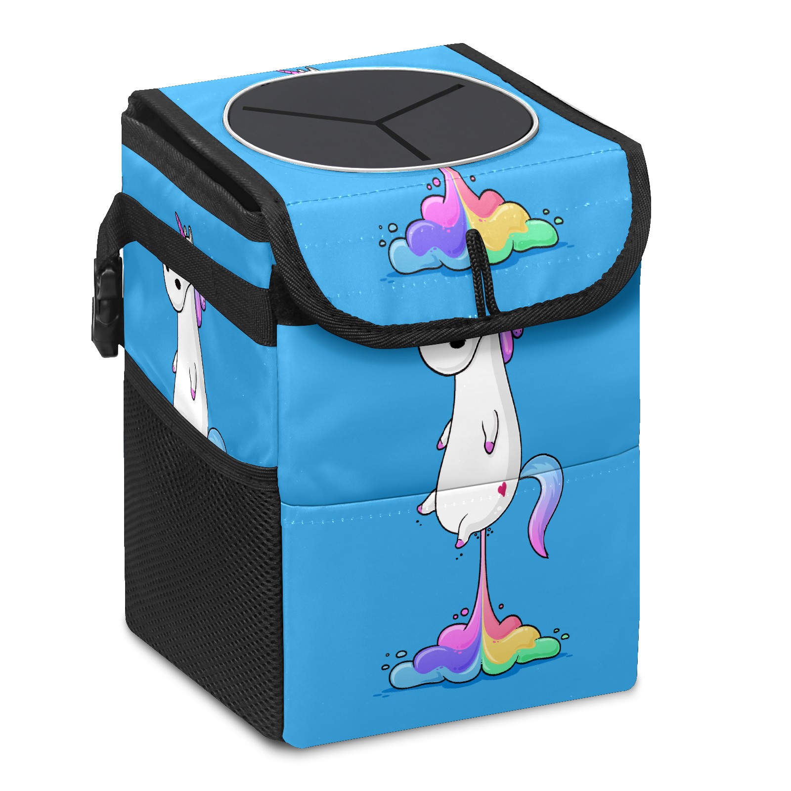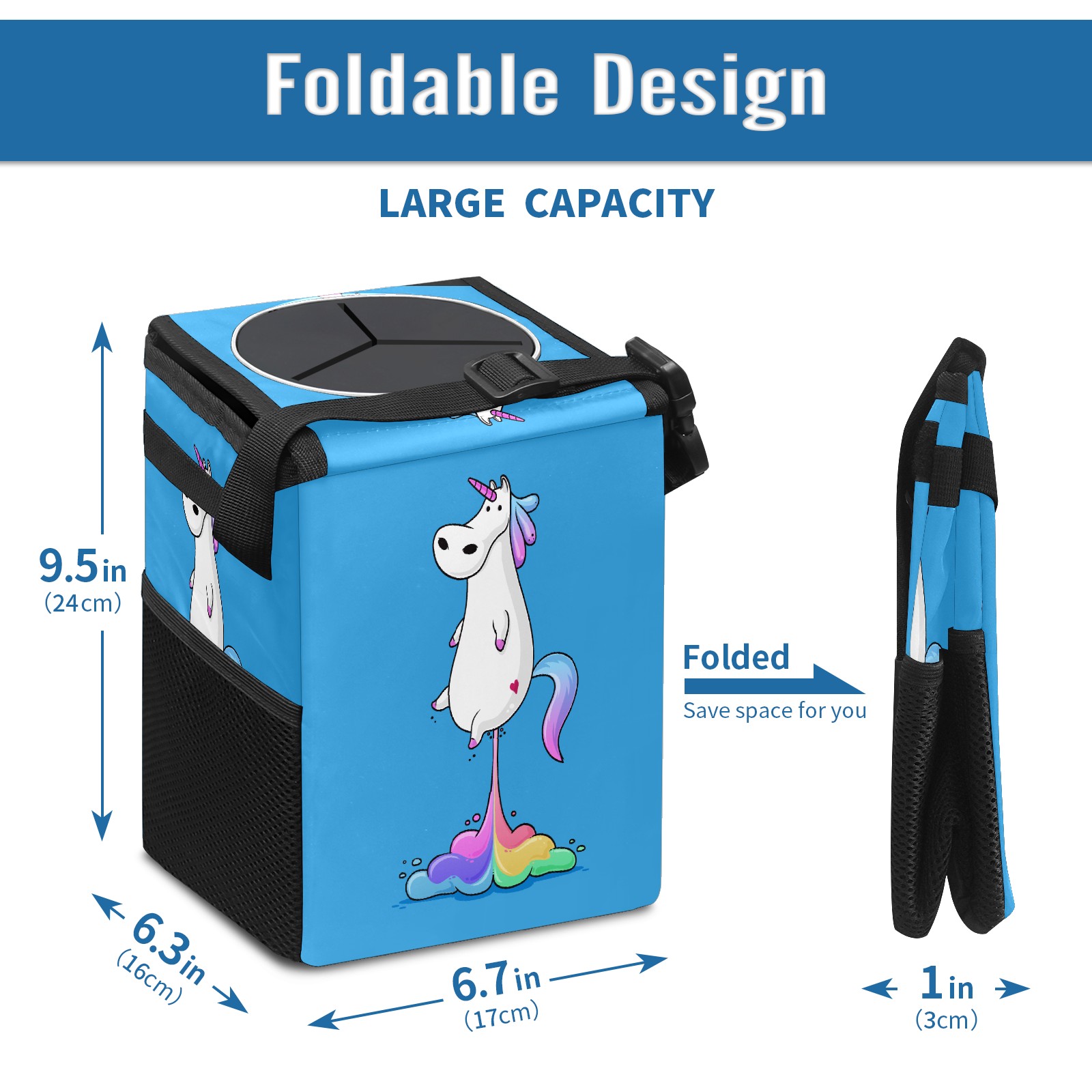 FOLDABLE & SPACE-SAVING Compact 9.5"×6.7"×6.3" size fits perfectly in any vehicle space Instantly folds flat when not in use - stores effortlessly under seats or in door pockets MULTI-FUNCTION ORGANIZER Large main compartment holds bottles, wrappers and tissues Additional pockets for wet wipes, masks or small accessories WATERPROOF & LEAKPROOF Made with premium leak-proof polyester material Contains messy spills from drinks, snacks, and food Wipe-clean surface resists stains and eliminates odors Package Includes 1× Car Trash Can