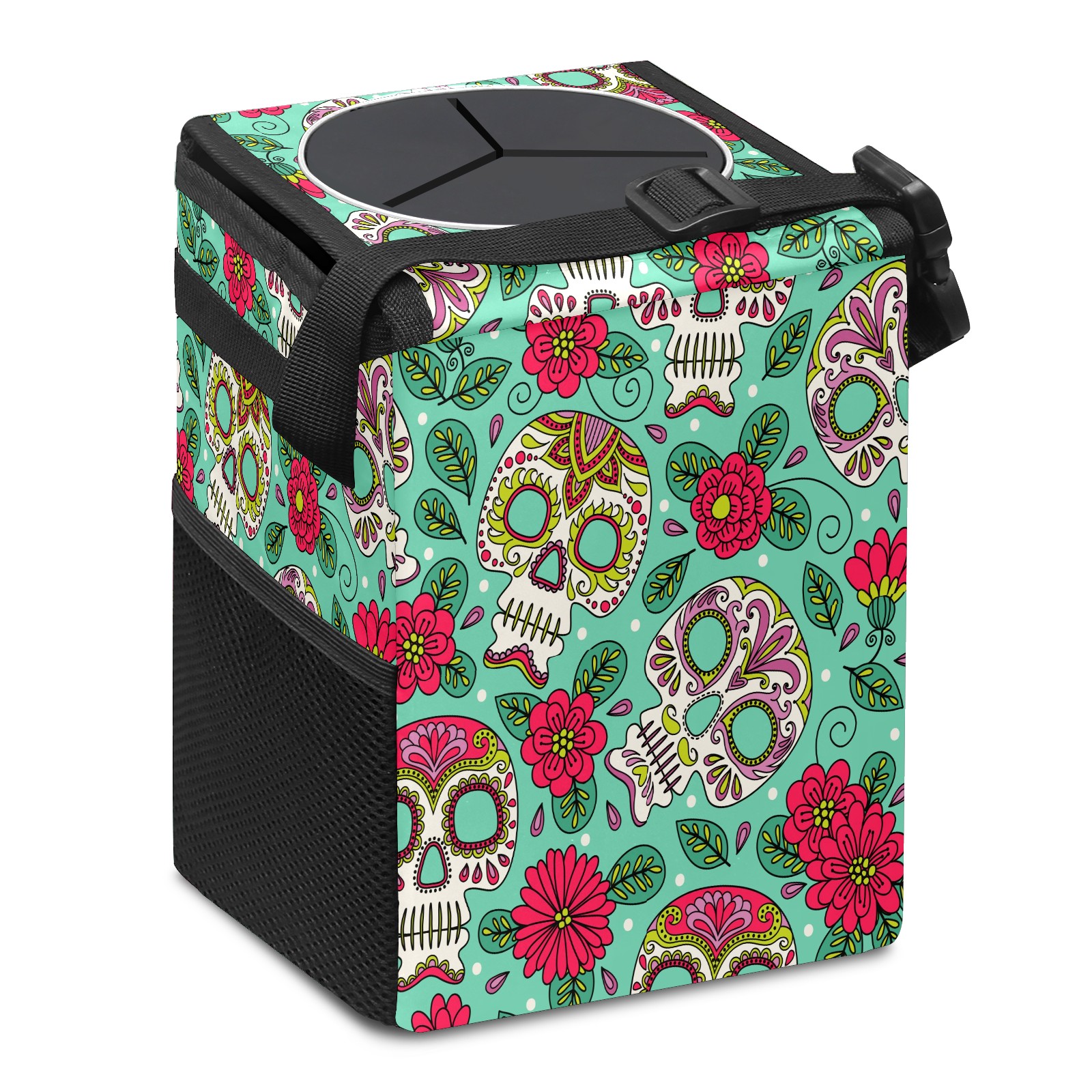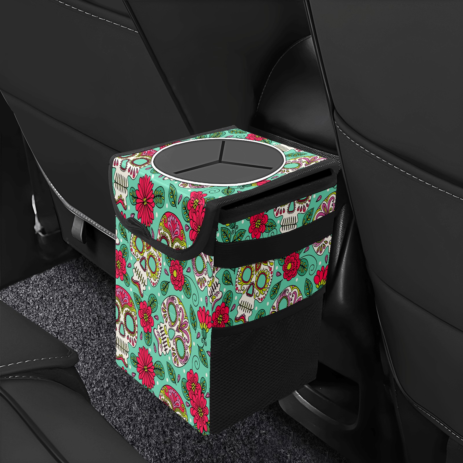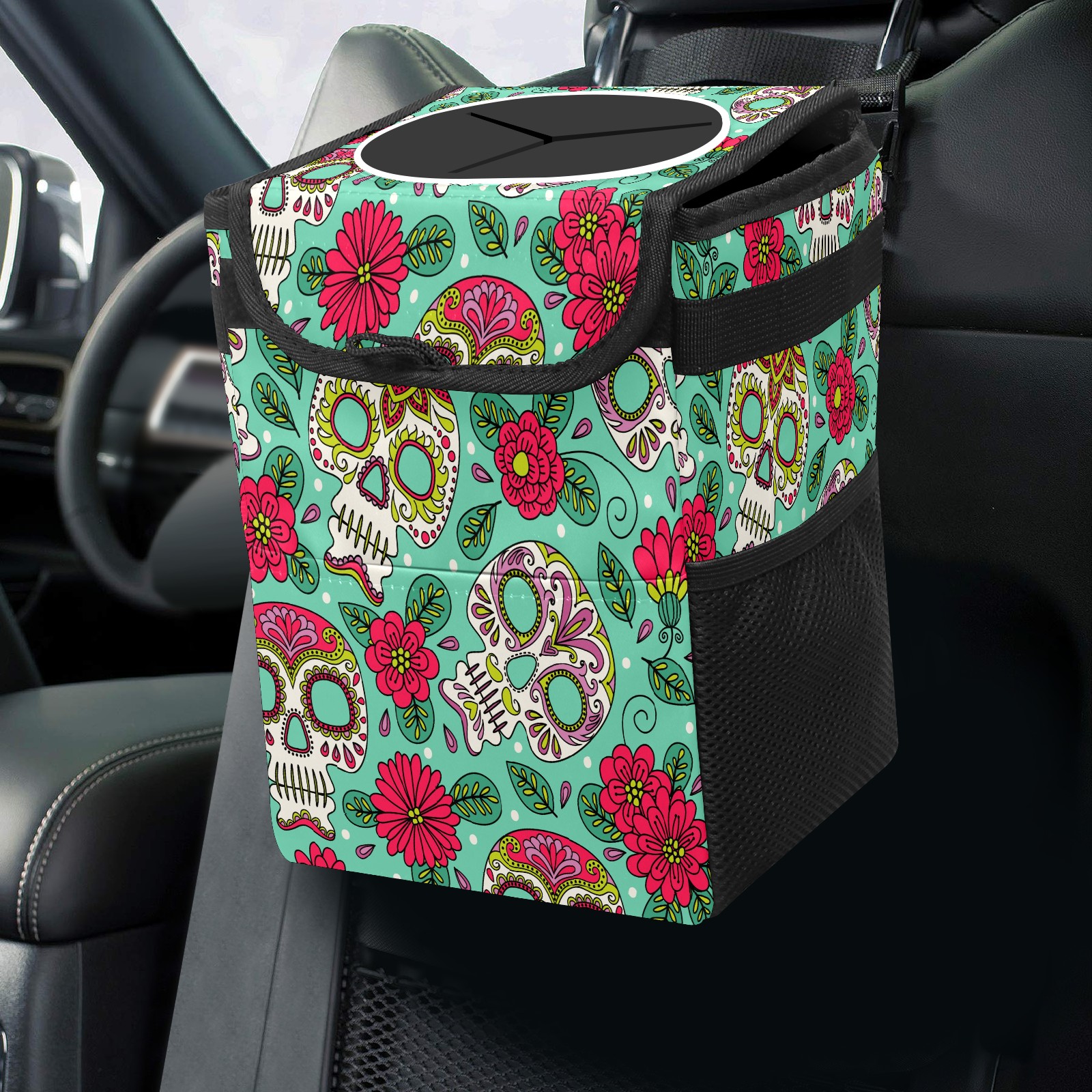 Car Trash Bin with Lid Auto Garbage Bag Hanging for Back Seat - Leakproof Trash Can for Cars SUVs Trucks Vehicle Car Accessories (Punk Gothic Skull Floral Green)