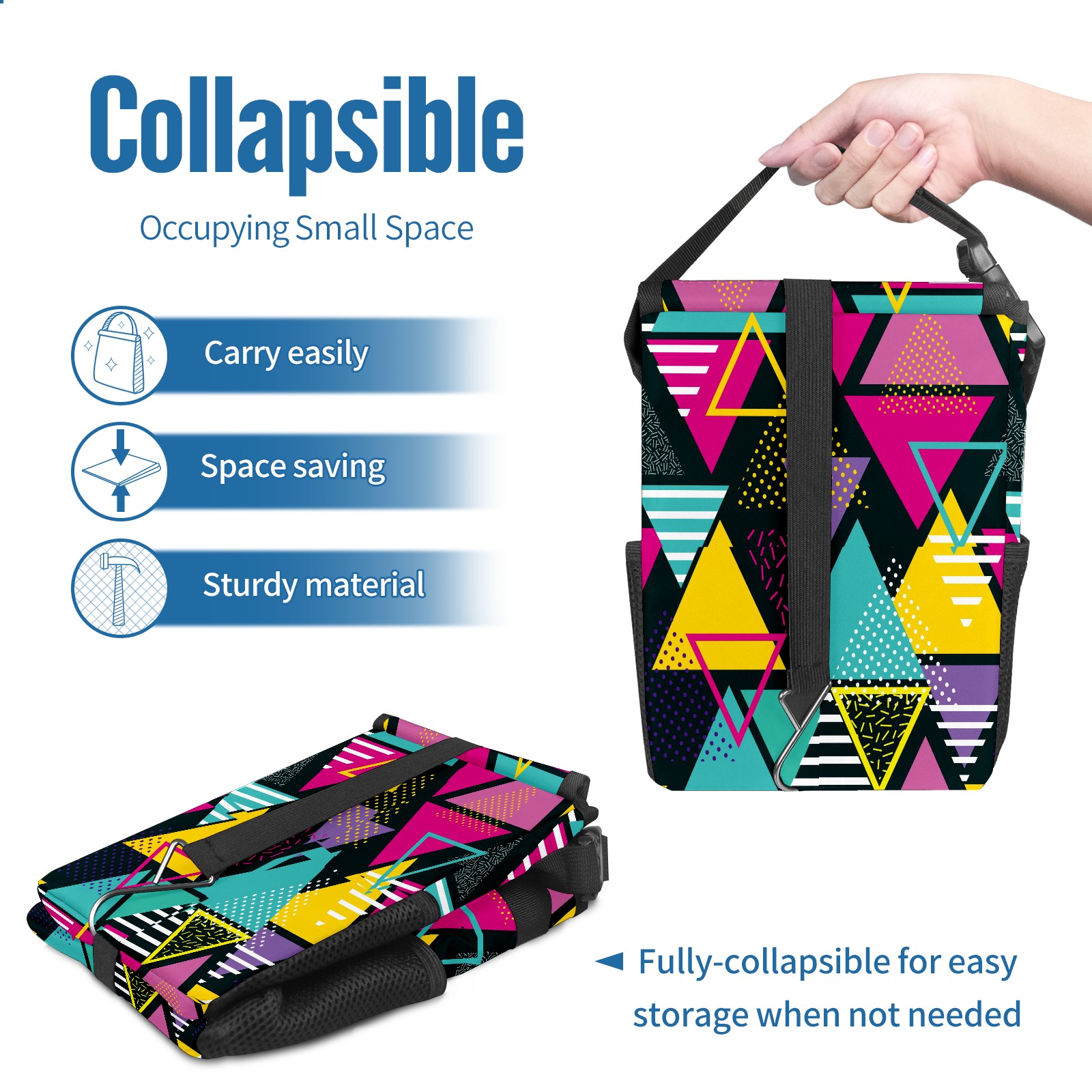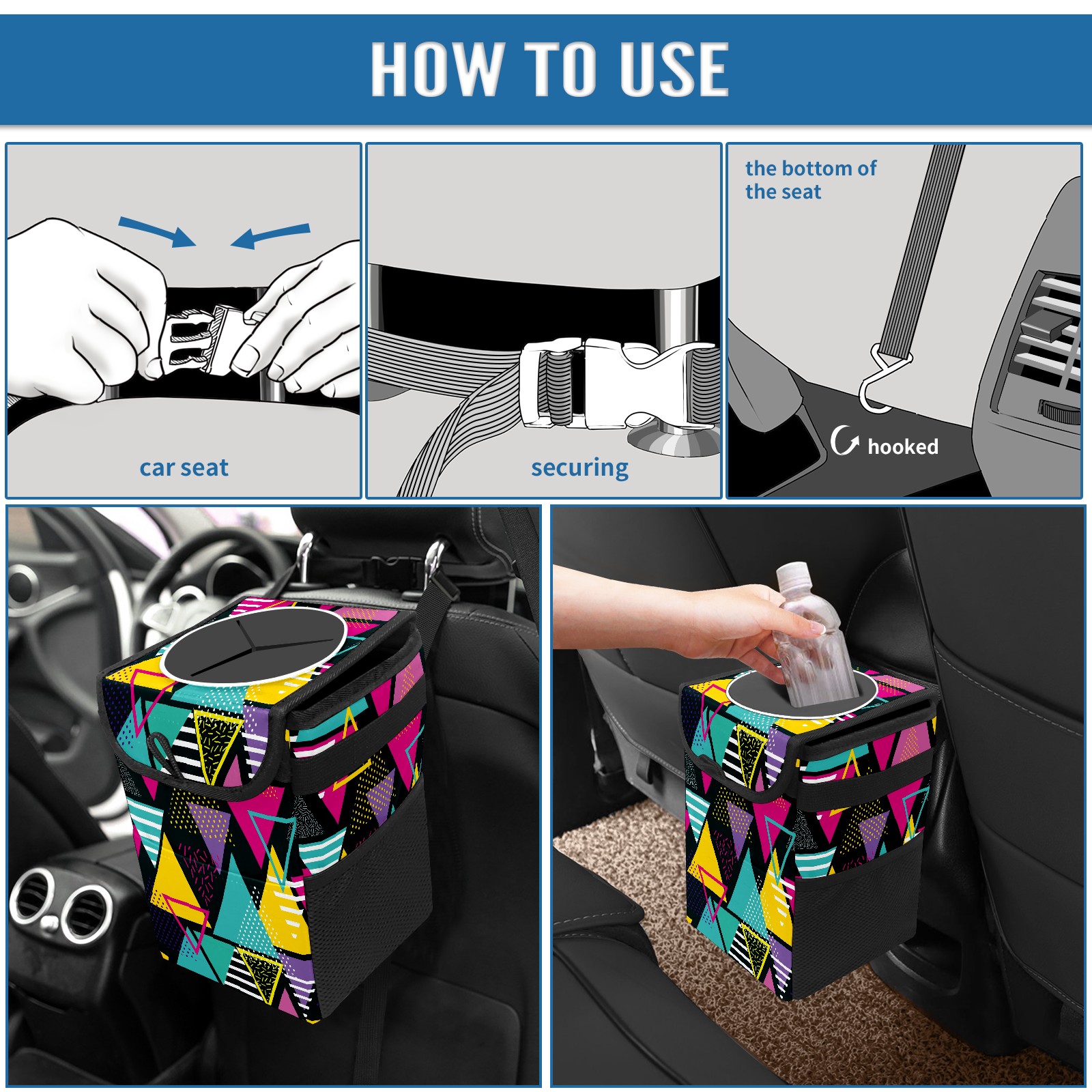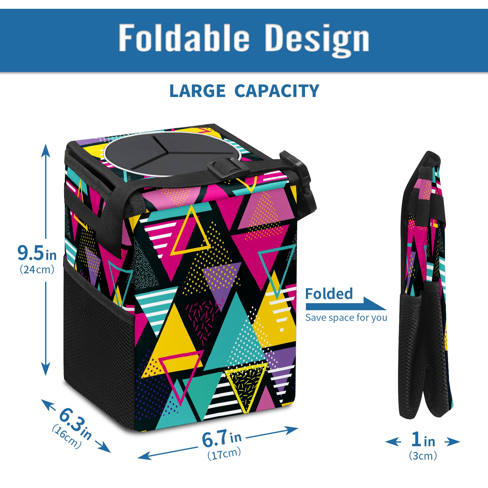 FOLDABLE & SPACE-SAVING Compact 9.5"×6.7"×6.3" size fits perfectly in any vehicle space Instantly folds flat when not in use - stores effortlessly under seats or in door pockets MULTI-FUNCTION ORGANIZER Large main compartment holds bottles, wrappers and tissues Additional pockets for wet wipes, masks or small accessories WATERPROOF & LEAKPROOF Made with premium leak-proof polyester material Contains messy spills from drinks, snacks, and food Wipe-clean surface resists stains and eliminates odors Package Includes 1× Car Trash Can
