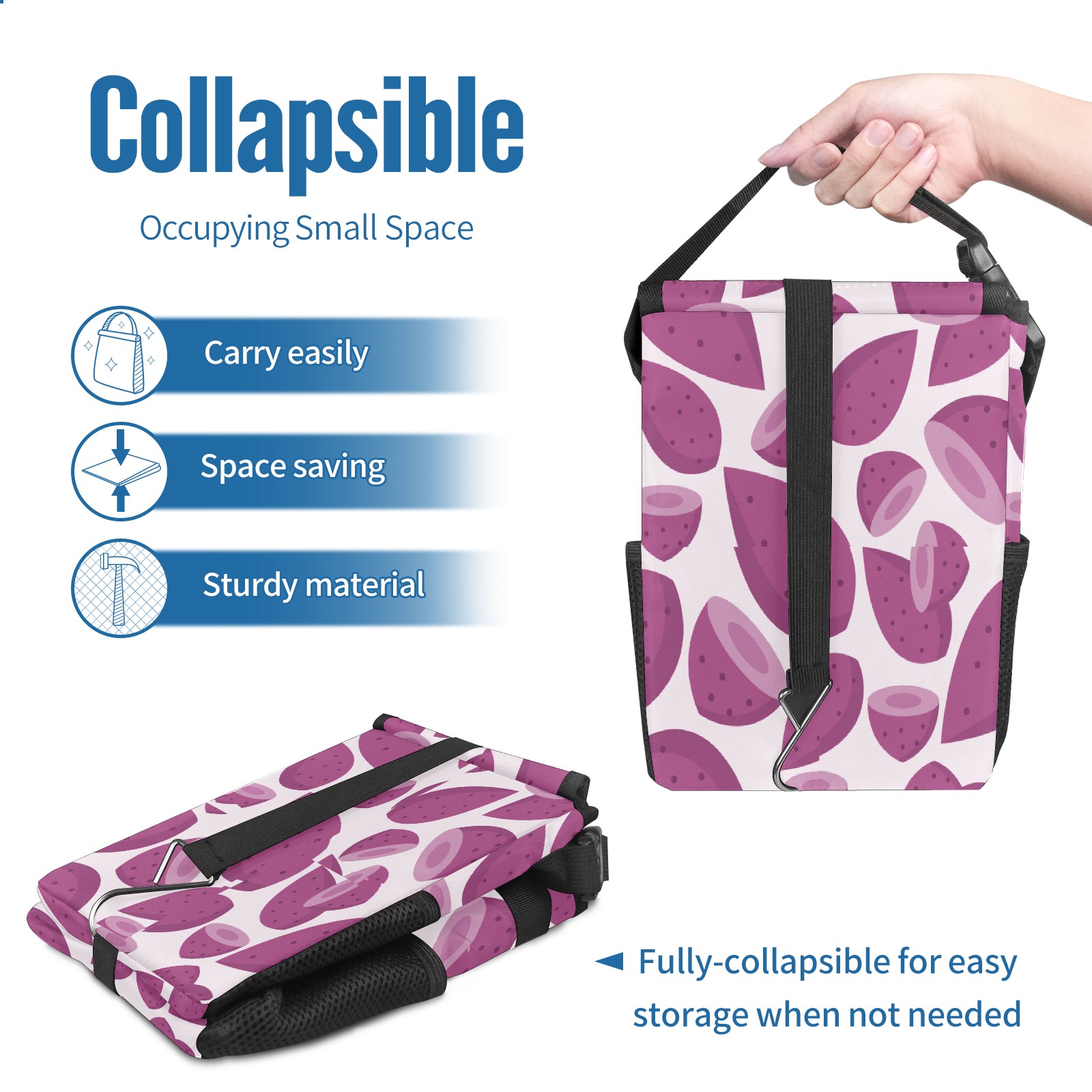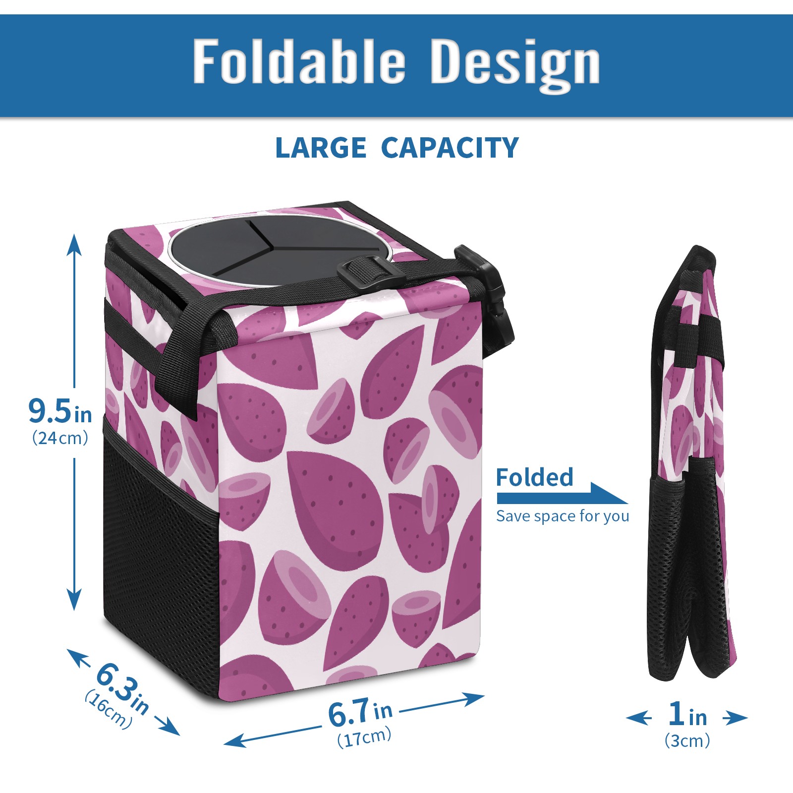 FOLDABLE & SPACE-SAVING Compact 9.5"×6.7"×6.3" size fits perfectly in any vehicle space Instantly folds flat when not in use - stores effortlessly under seats or in door pockets MULTI-FUNCTION ORGANIZER Large main compartment holds bottles, wrappers and tissues Additional pockets for wet wipes, masks or small accessories WATERPROOF & LEAKPROOF Made with premium leak-proof polyester material Contains messy spills from drinks, snacks, and food Wipe-clean surface resists stains and eliminates odors Package Includes 1× Car Trash Can