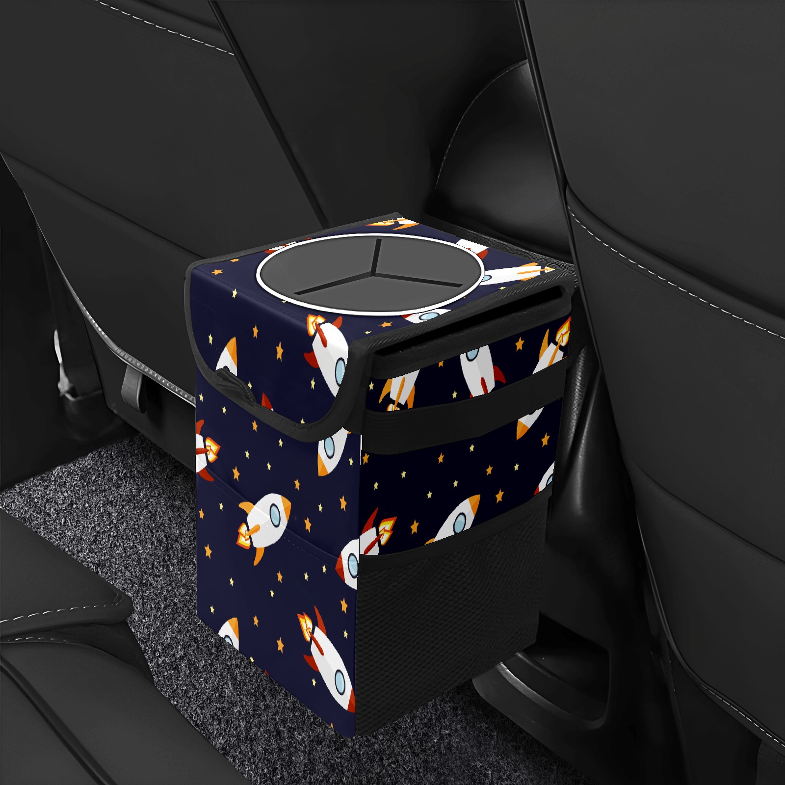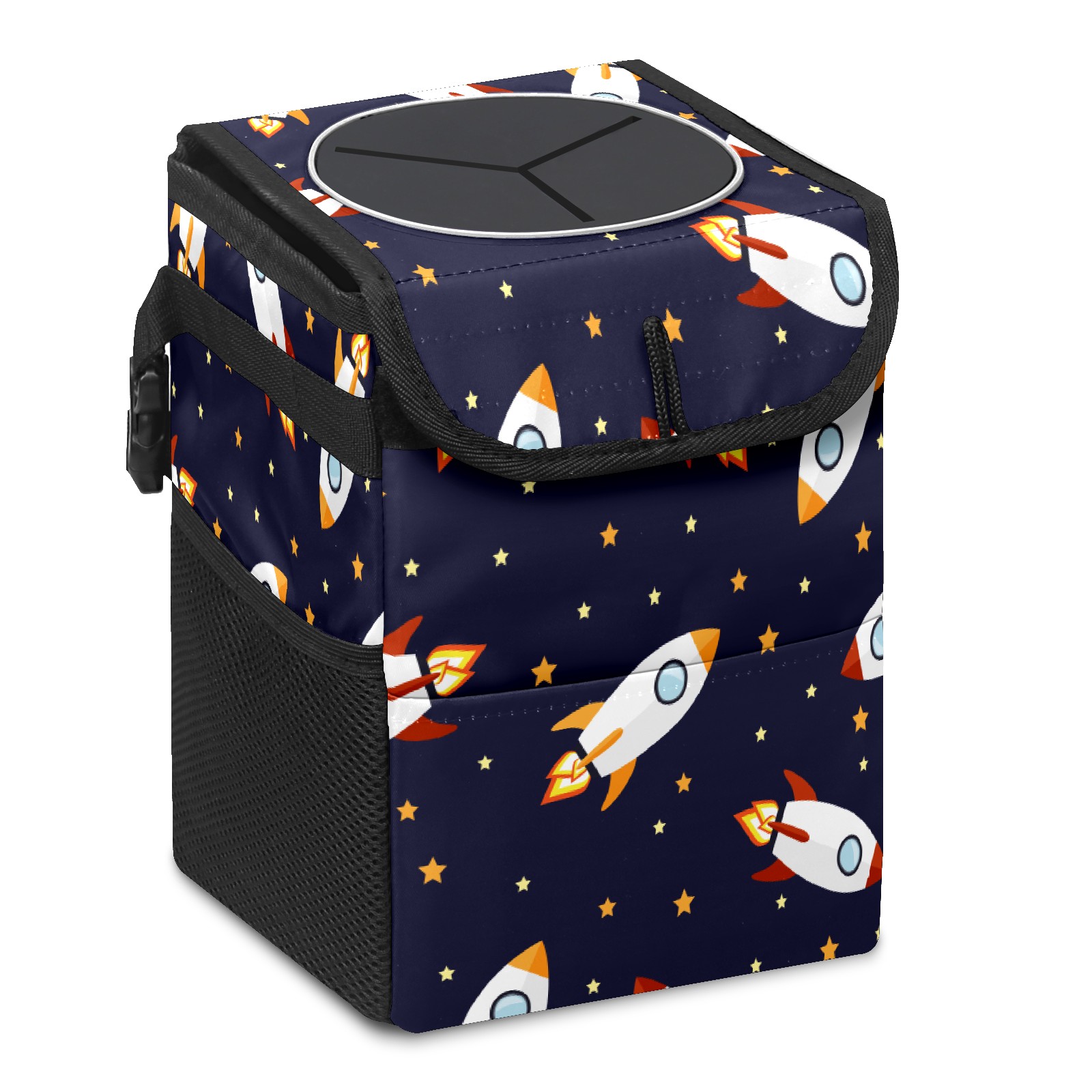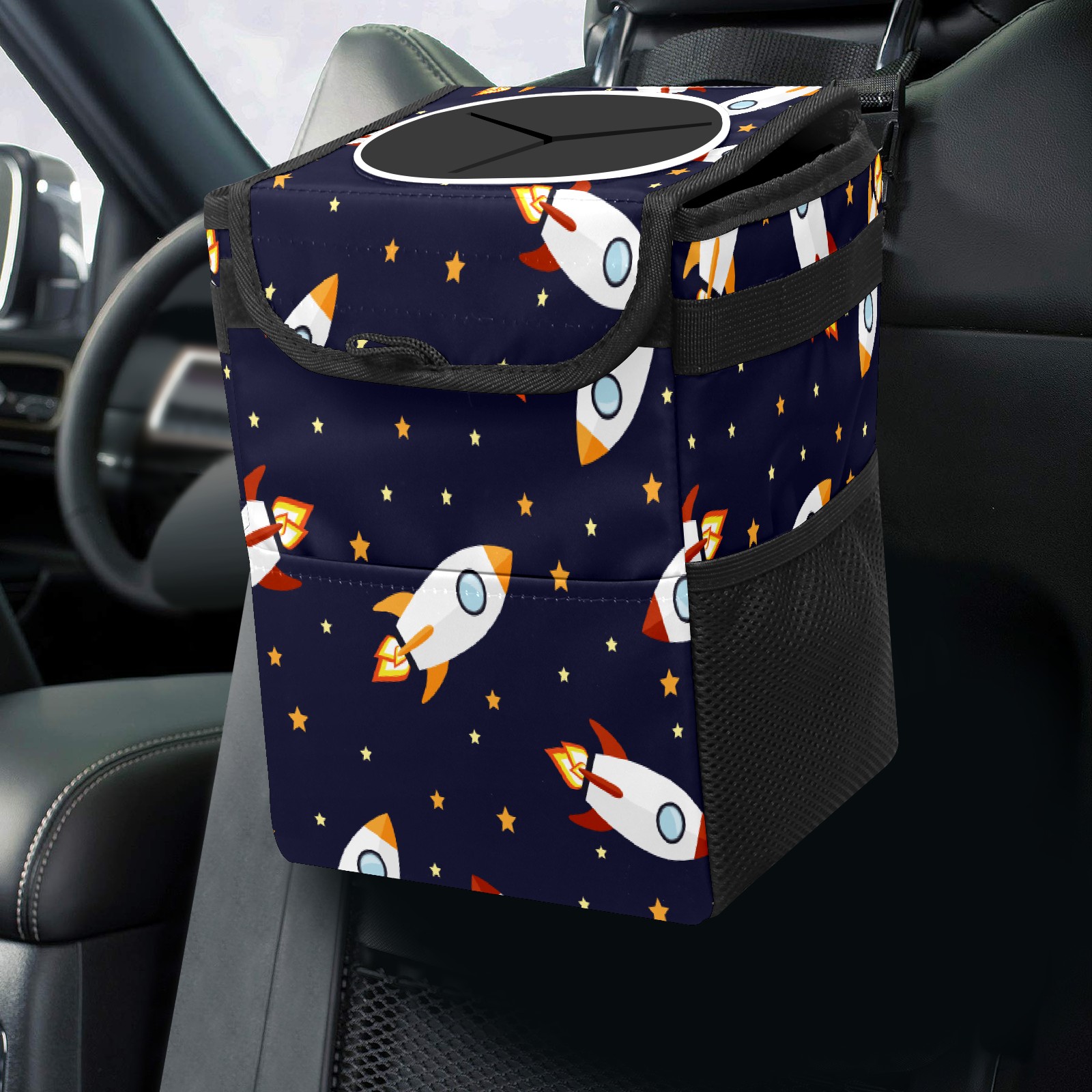 Car Trash Bin with Lid Auto Garbage Bag Hanging for Back Seat - Leakproof Trash Can for Cars SUVs Trucks Vehicle Car Accessories (Dark Blue Cartoon Rockets Pattern)