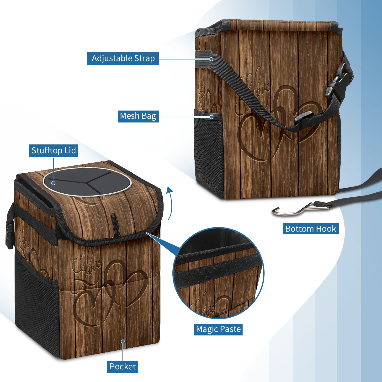FOLDABLE & SPACE-SAVING Compact 9.5"×6.7"×6.3" size fits perfectly in any vehicle space Instantly folds flat when not in use - stores effortlessly under seats or in door pockets MULTI-FUNCTION ORGANIZER Large main compartment holds bottles, wrappers and tissues Additional pockets for wet wipes, masks or small accessories WATERPROOF & LEAKPROOF Made with premium leak-proof polyester material Contains messy spills from drinks, snacks, and food Wipe-clean surface resists stains and eliminates odors Package Includes 1× Car Trash Can