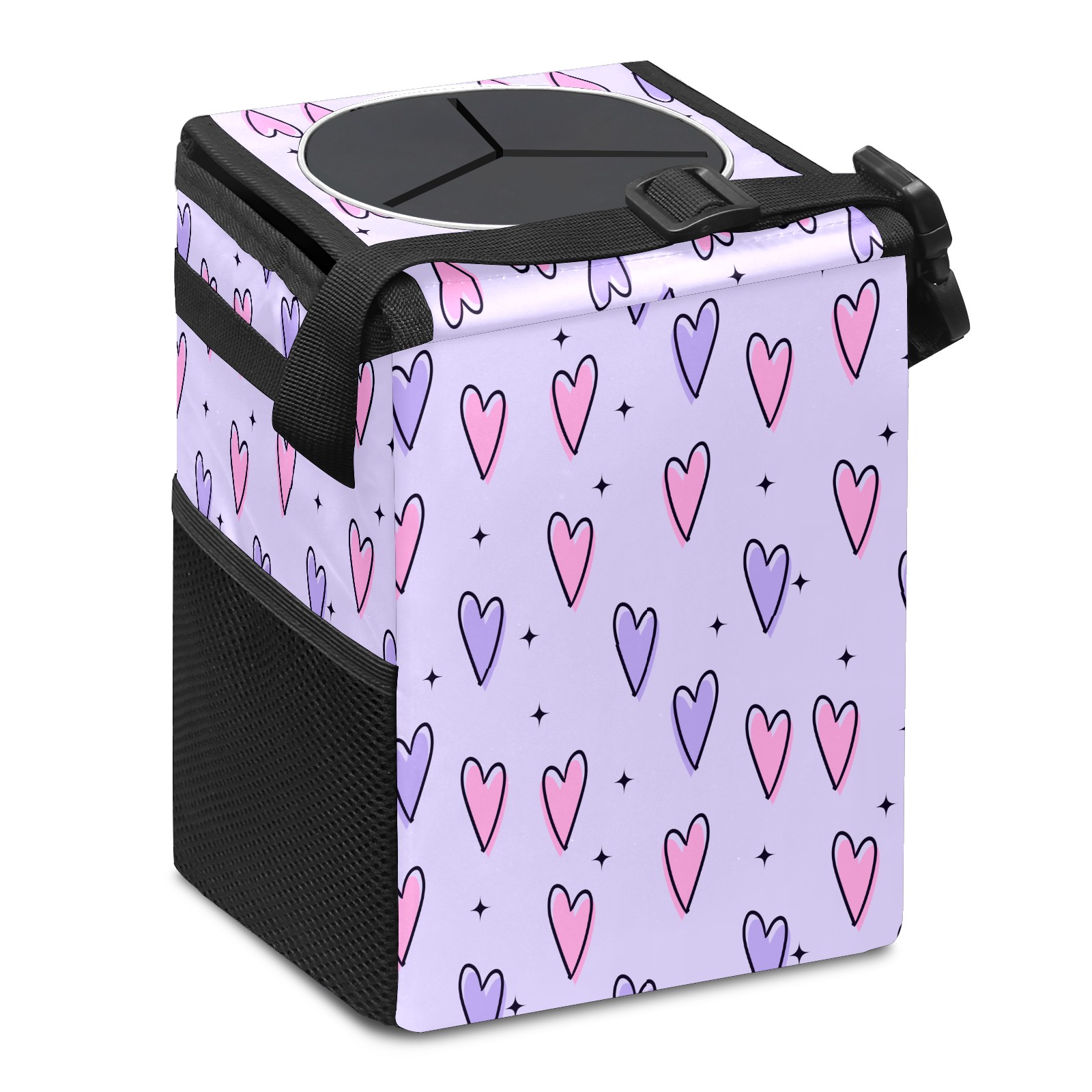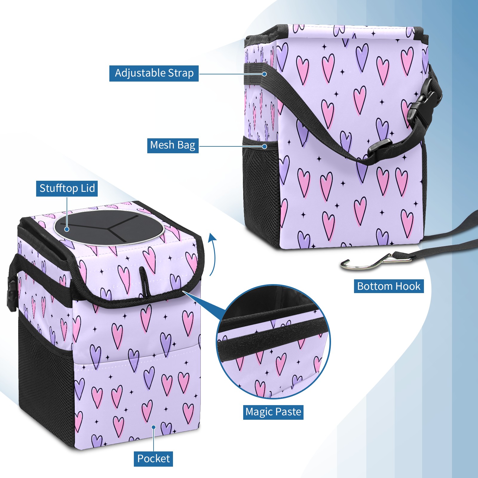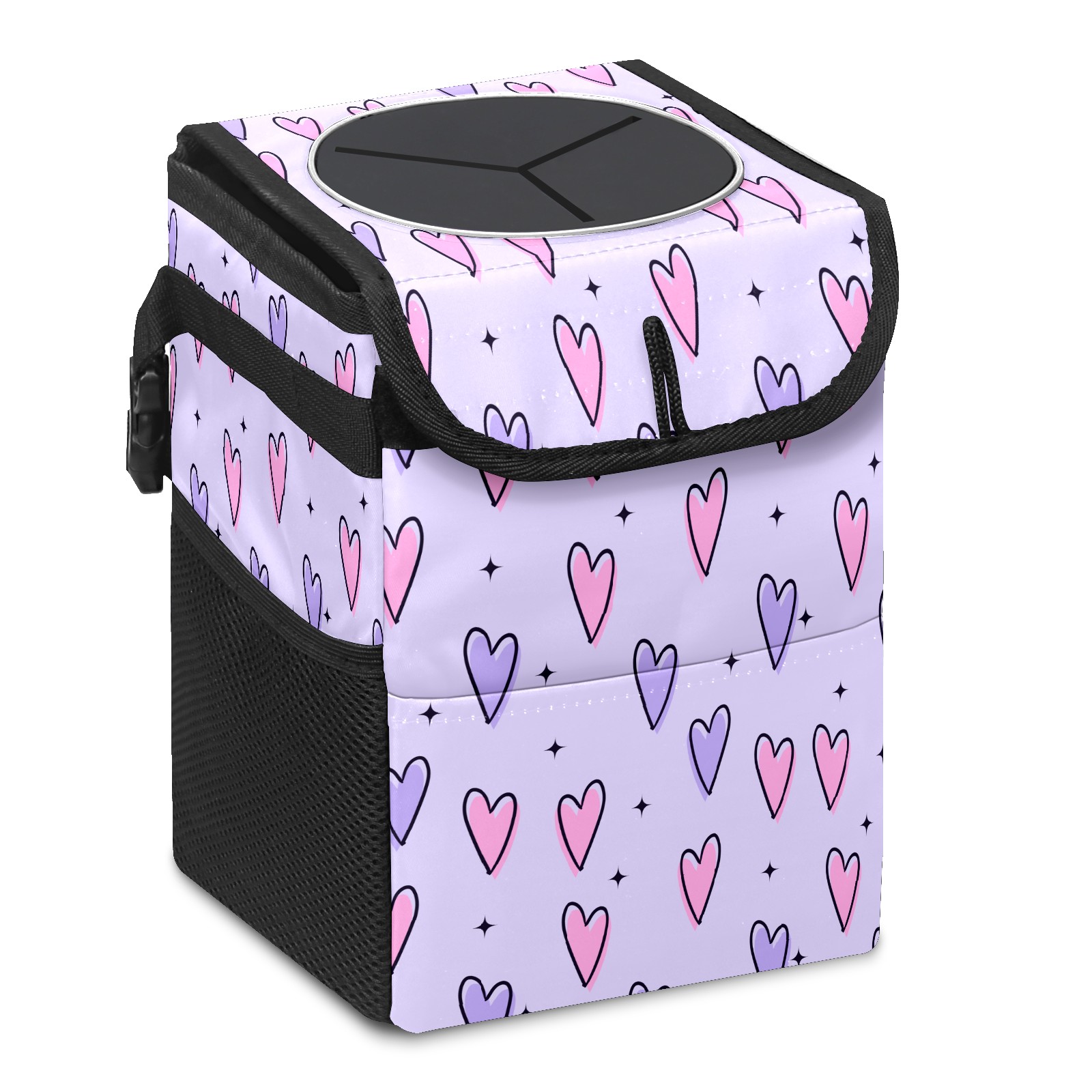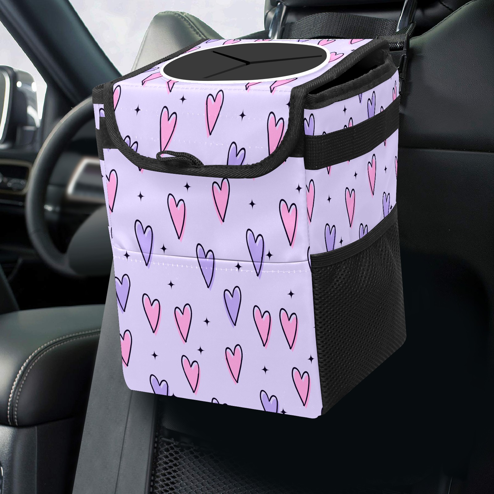 Car Trash Bin with Lid Auto Garbage Bag Hanging for Back Seat - Leakproof Trash Can for Cars SUVs Trucks Vehicle Car Accessories (Pink Purple Love Heart StarsPurple Background)
