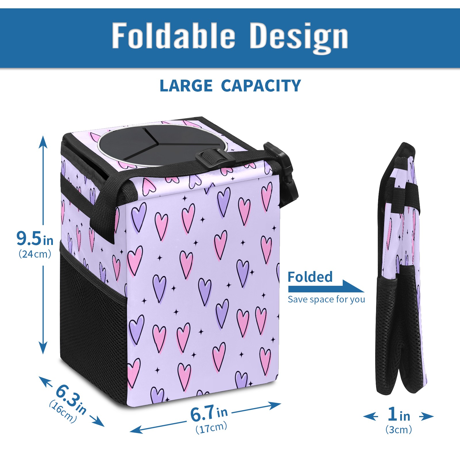 FOLDABLE & SPACE-SAVING Compact 9.5"×6.7"×6.3" size fits perfectly in any vehicle space Instantly folds flat when not in use - stores effortlessly under seats or in door pockets MULTI-FUNCTION ORGANIZER Large main compartment holds bottles, wrappers and tissues Additional pockets for wet wipes, masks or small accessories WATERPROOF & LEAKPROOF Made with premium leak-proof polyester material Contains messy spills from drinks, snacks, and food Wipe-clean surface resists stains and eliminates odors Package Includes 1× Car Trash Can