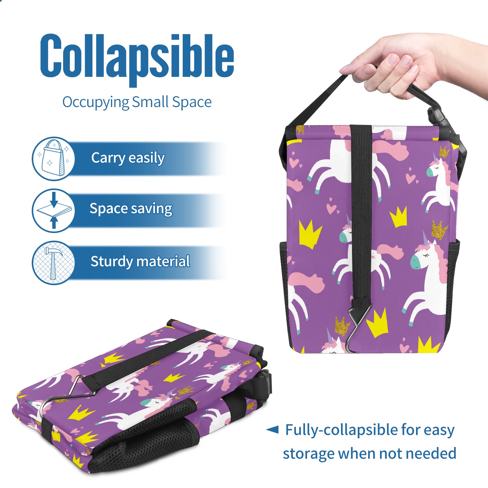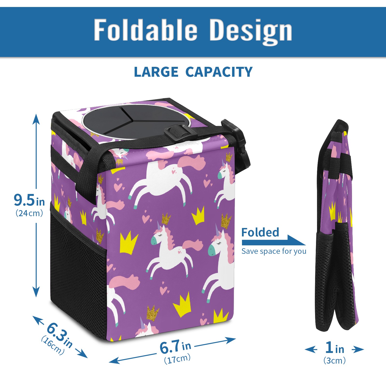 FOLDABLE & SPACE-SAVING Compact 9.5"×6.7"×6.3" size fits perfectly in any vehicle space Instantly folds flat when not in use - stores effortlessly under seats or in door pockets MULTI-FUNCTION ORGANIZER Large main compartment holds bottles, wrappers and tissues Additional pockets for wet wipes, masks or small accessories WATERPROOF & LEAKPROOF Made with premium leak-proof polyester material Contains messy spills from drinks, snacks, and food Wipe-clean surface resists stains and eliminates odors Package Includes 1× Car Trash Can