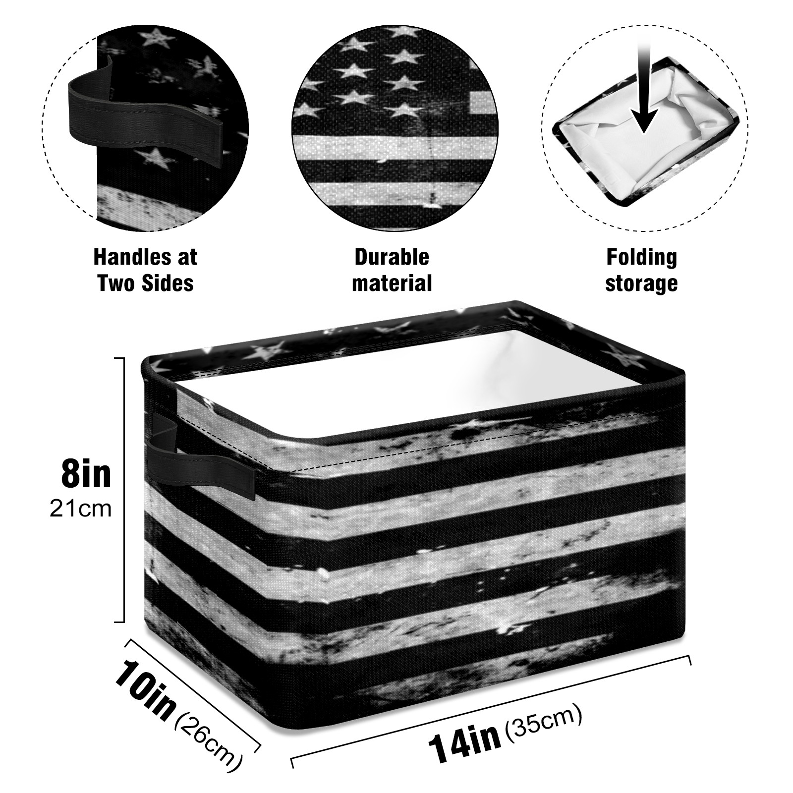 【Материал】Оксфордская ткань из полиэстера 600D; ручки изготовлены из полиэстера. 【Описание материала】Внешняя ткань: Оксфордская ткань полотняного переплетения высокой плотности 300D (ПВХ); Подкладка: белая ткань 750D; Ручки: черная композитная ткань 290T. 【Размер】26x35x21 см (10x14x8 дюймов) 【Описание продукта】Эта корзина для хранения с ручками с обеих сторон предлагает достаточно места для хранения предметов разных размеров, что делает ее подходящей для различных случаев, таких как дом, офис и школа. Ручки с обеих сторон закреплены гвоздями для долговечности. Прочный металлический каркас окружает корзину, поддерживая ее форму. Складная корзина для хранения: Наши корзины для хранения легко складываются, когда не используются. Эти ящики для хранения изготовлены из легко моющейся оксфордской ткани и при необходимости могут быть аккуратно протерты мягким мылом и водой. Из-за внутреннего металлического каркаса и жесткого дна машинная стирка не рекомендуется. 【Подходящие сценарии использования】Дом, офис и школа 【Инструкции по стирке】Рекомендуется ручная стирка; избегайте длительного воздействия прямых солнечных лучей.