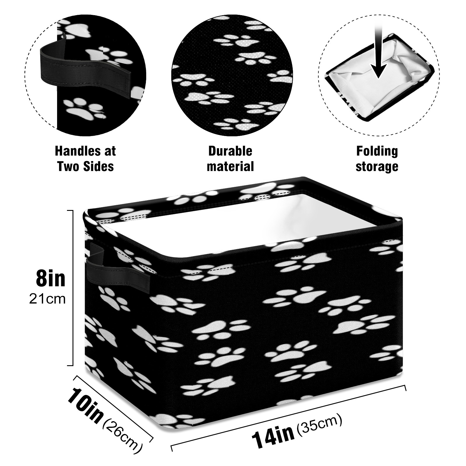 【Материал】Оксфордская ткань из полиэстера 600D; ручки изготовлены из полиэстера. 【Описание материала】Внешняя ткань: Оксфордская ткань полотняного переплетения высокой плотности 300D (ПВХ); Подкладка: белая ткань 750D; Ручки: черная композитная ткань 290T. 【Размер】26x35x21 см (10x14x8 дюймов) 【Описание продукта】Эта корзина для хранения с ручками с обеих сторон предлагает достаточно места для хранения предметов разных размеров, что делает ее подходящей для различных случаев, таких как дом, офис и школа. Ручки с обеих сторон закреплены гвоздями для долговечности. Прочный металлический каркас окружает корзину, поддерживая ее форму. Складная корзина для хранения: Наши корзины для хранения легко складываются, когда не используются. Эти ящики для хранения изготовлены из легко моющейся оксфордской ткани и при необходимости могут быть аккуратно протерты мягким мылом и водой. Из-за внутреннего металлического каркаса и жесткого дна машинная стирка не рекомендуется. 【Подходящие сценарии использования】Дом, офис и школа 【Инструкции по стирке】Рекомендуется ручная стирка; избегайте длительного воздействия прямых солнечных лучей.