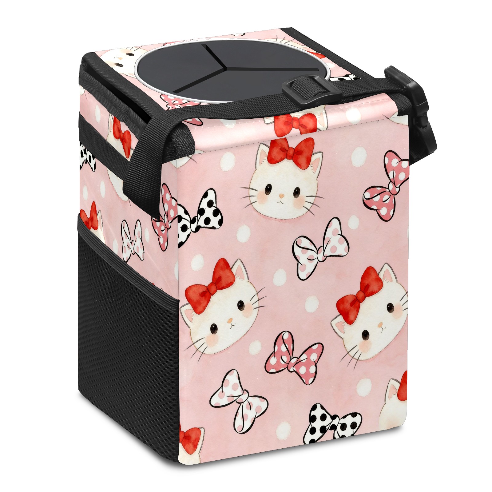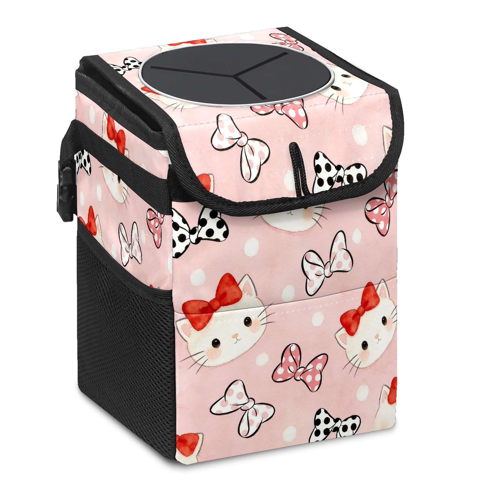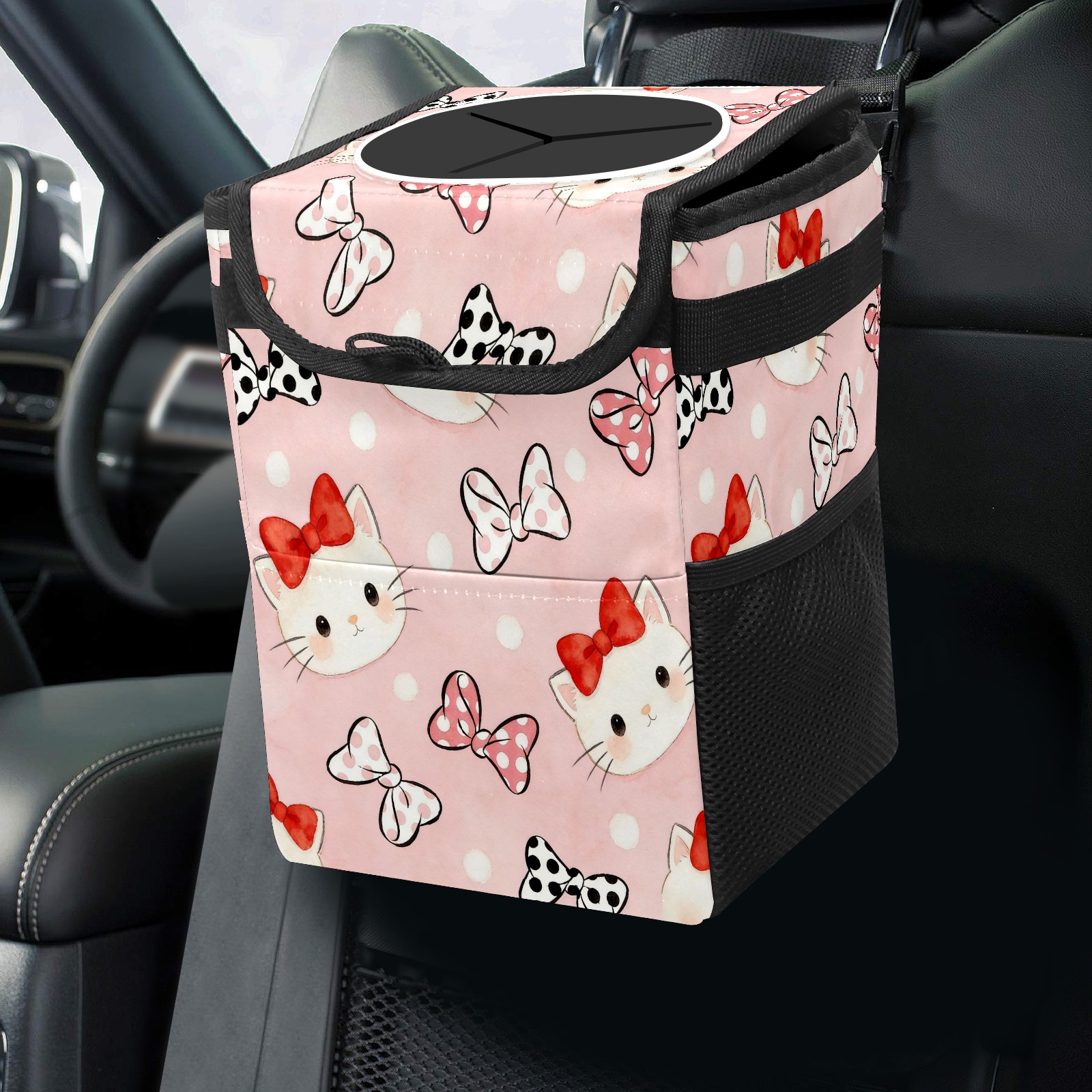 Car Trash Can with Lid, Small Portable Hanging Automotive Garbage Bin for Vehicles, Leakproof Waste Bag Container for SUV Truck Van Interior Auto Travel Road Trips(Kitty Bows)