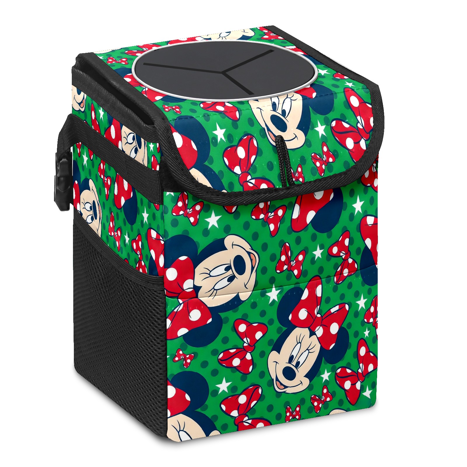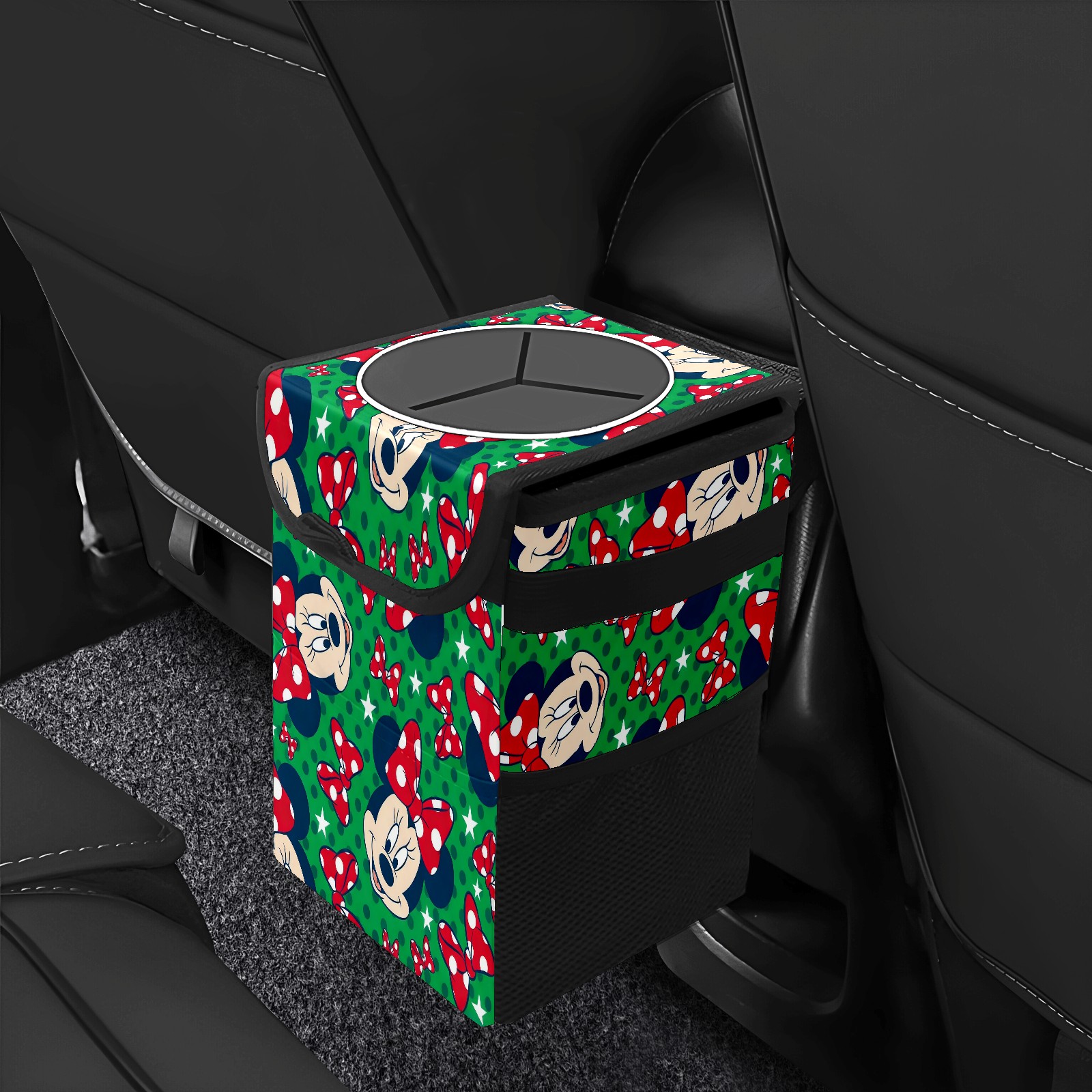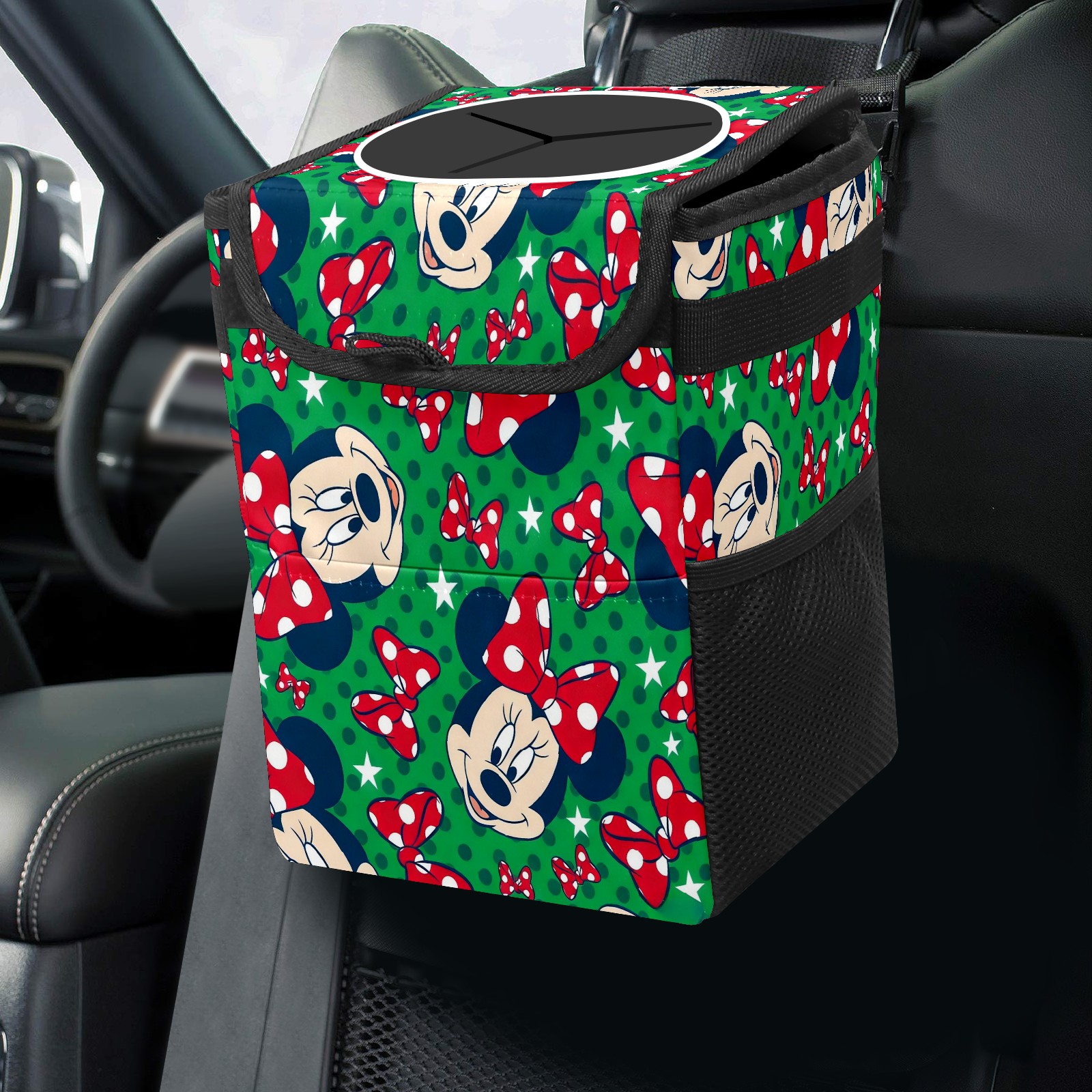 Car Trash Can with Lid, Small Portable Hanging Automotive Garbage Bin for Vehicles, Leakproof Waste Bag Container for SUV Truck Van Interior Auto Travel Road Trips(Mickey Green)