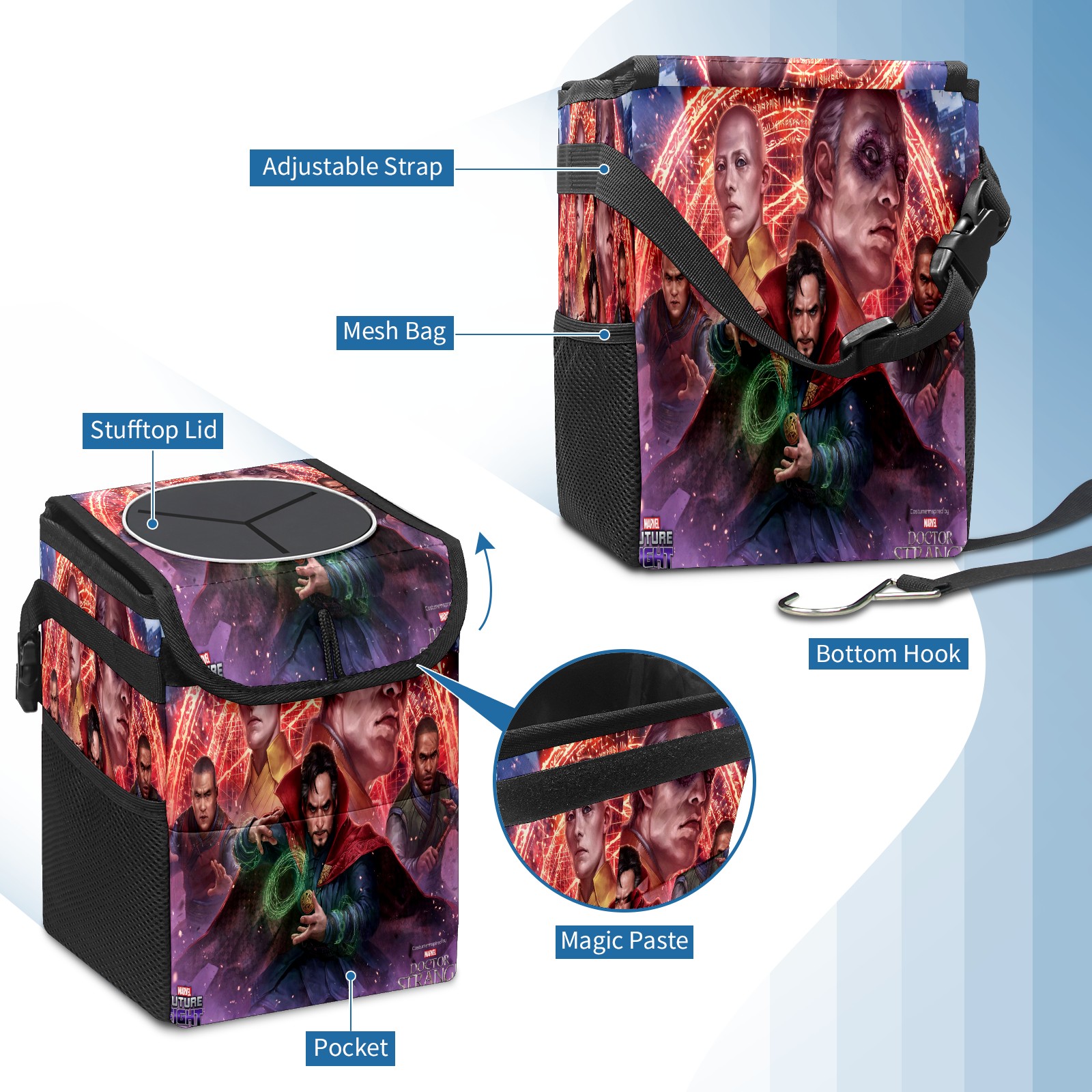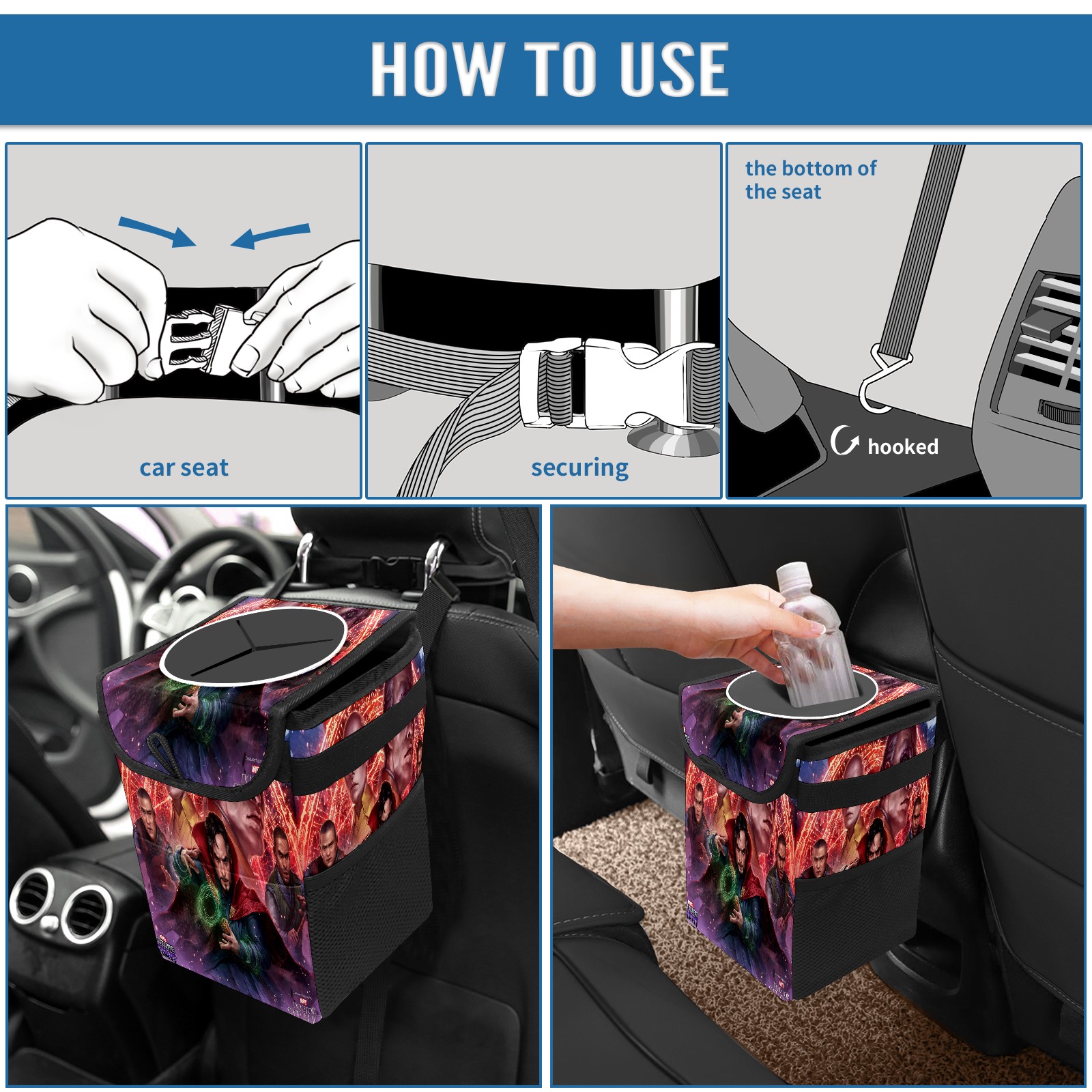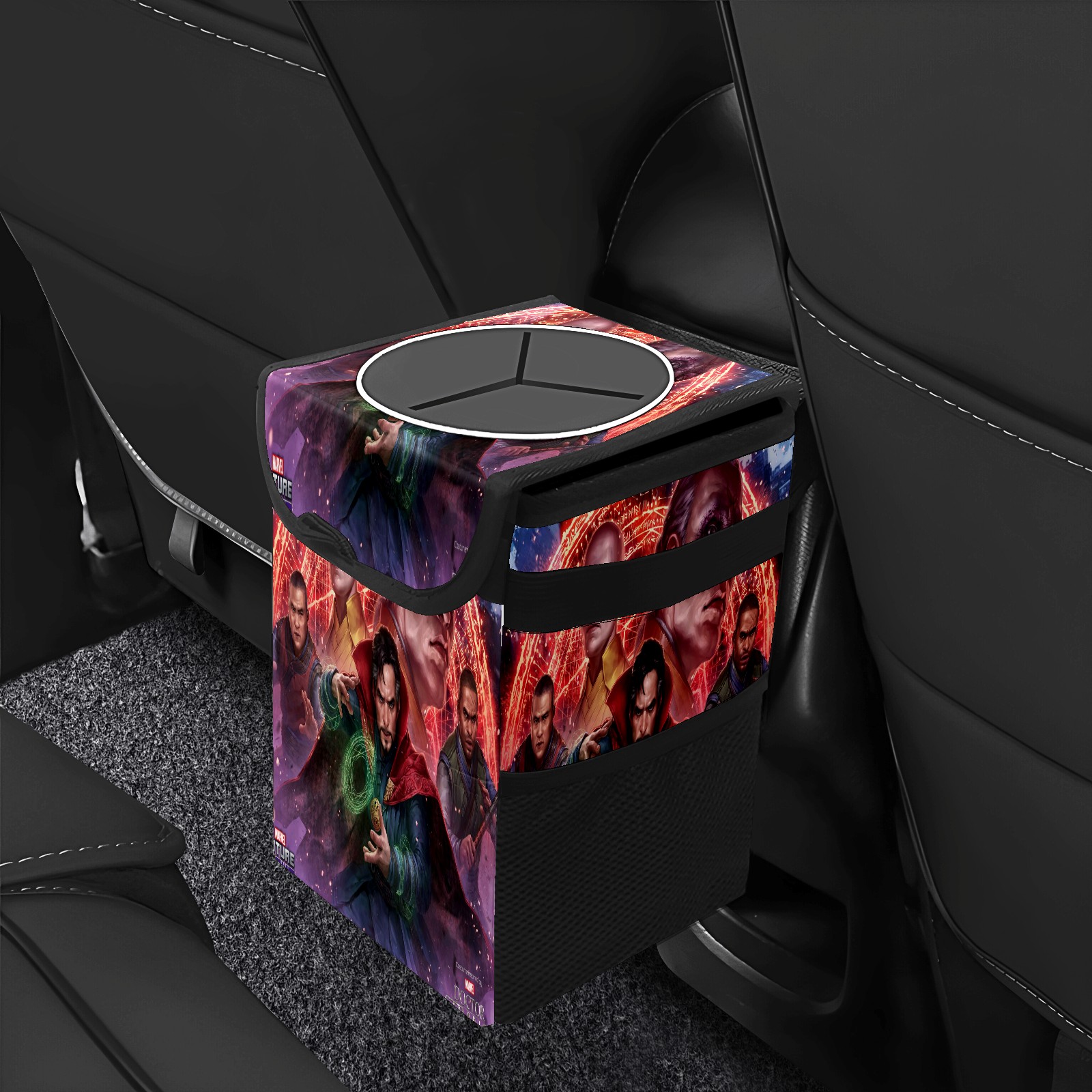 Car Trash Can with Lid, Small Portable Hanging Automotive Garbage Bin for Vehicles, Leakproof Waste Bag Container for SUV Truck Van Interior Auto Travel Road Trips(漫威 (1101))