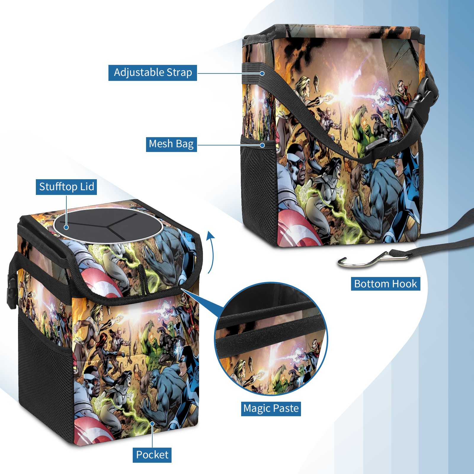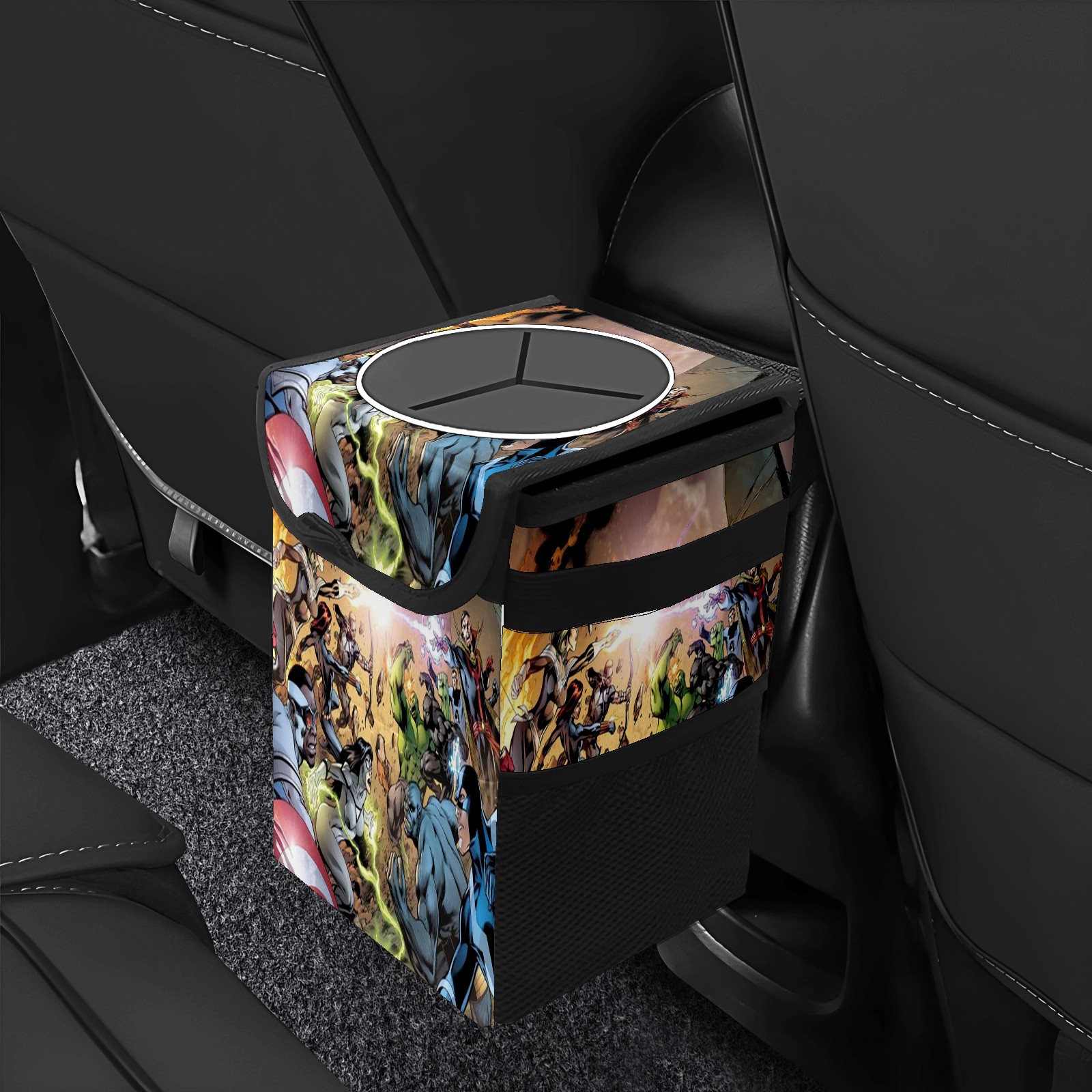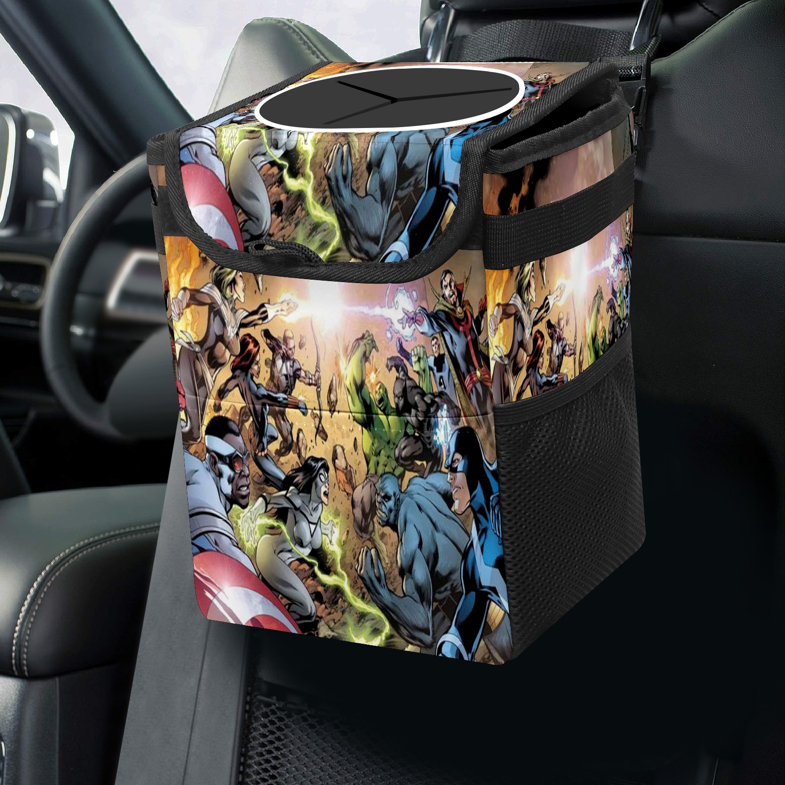 Car Trash Can with Lid, Small Portable Hanging Automotive Garbage Bin for Vehicles, Leakproof Waste Bag Container for SUV Truck Van Interior Auto Travel Road Trips(漫威 (1095))