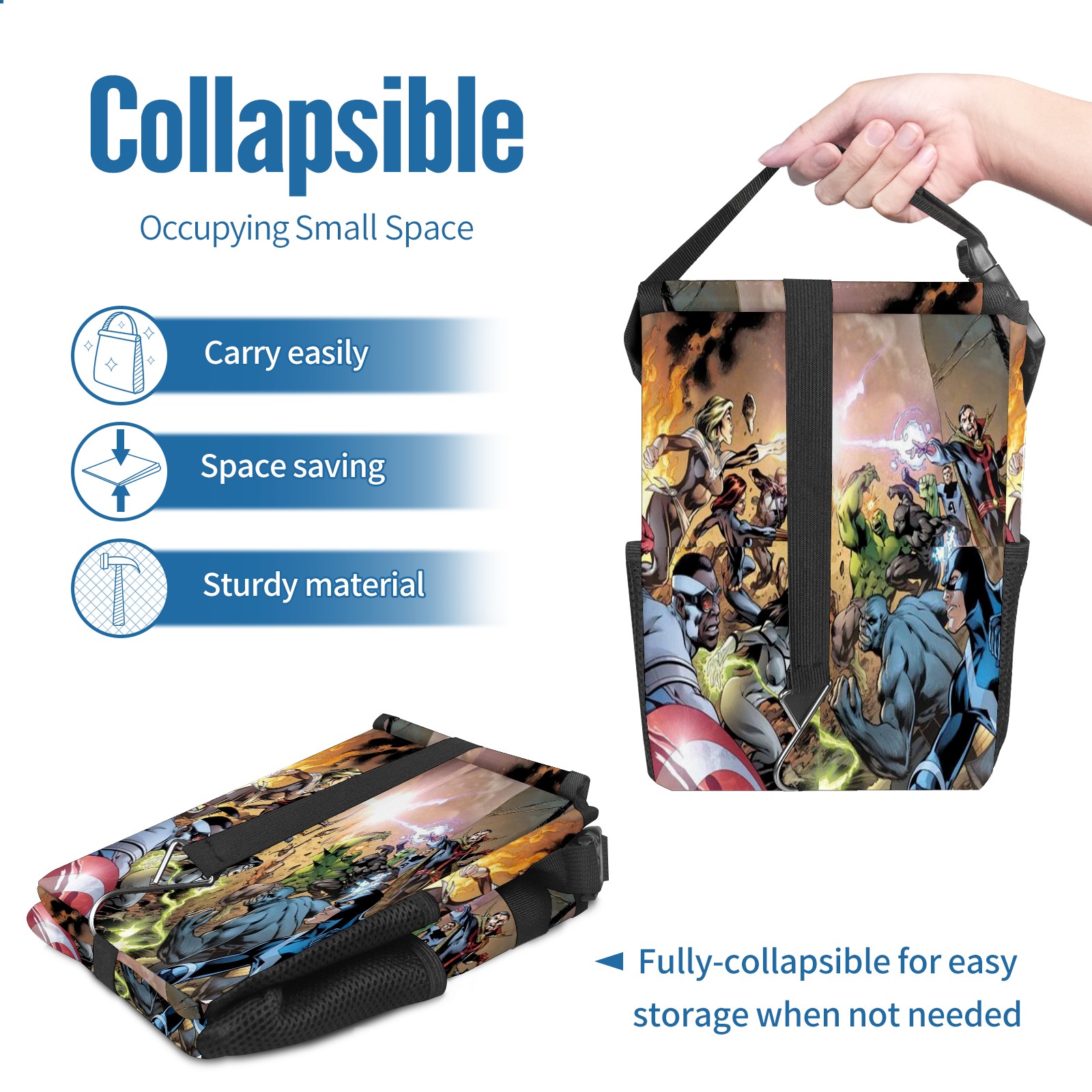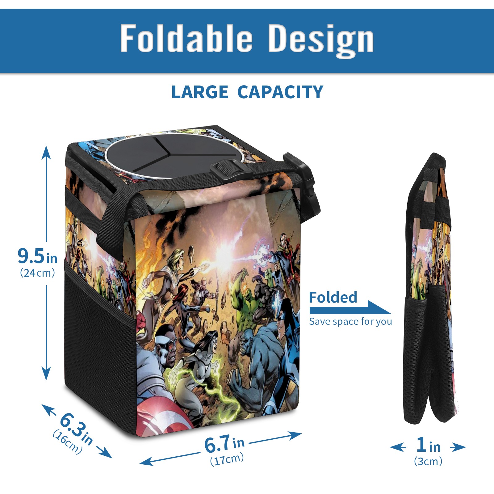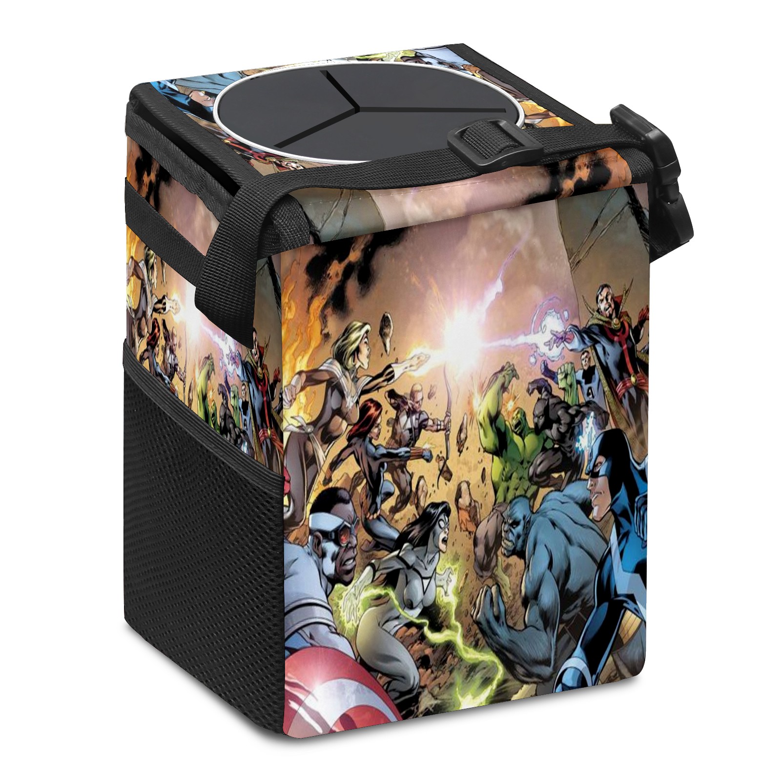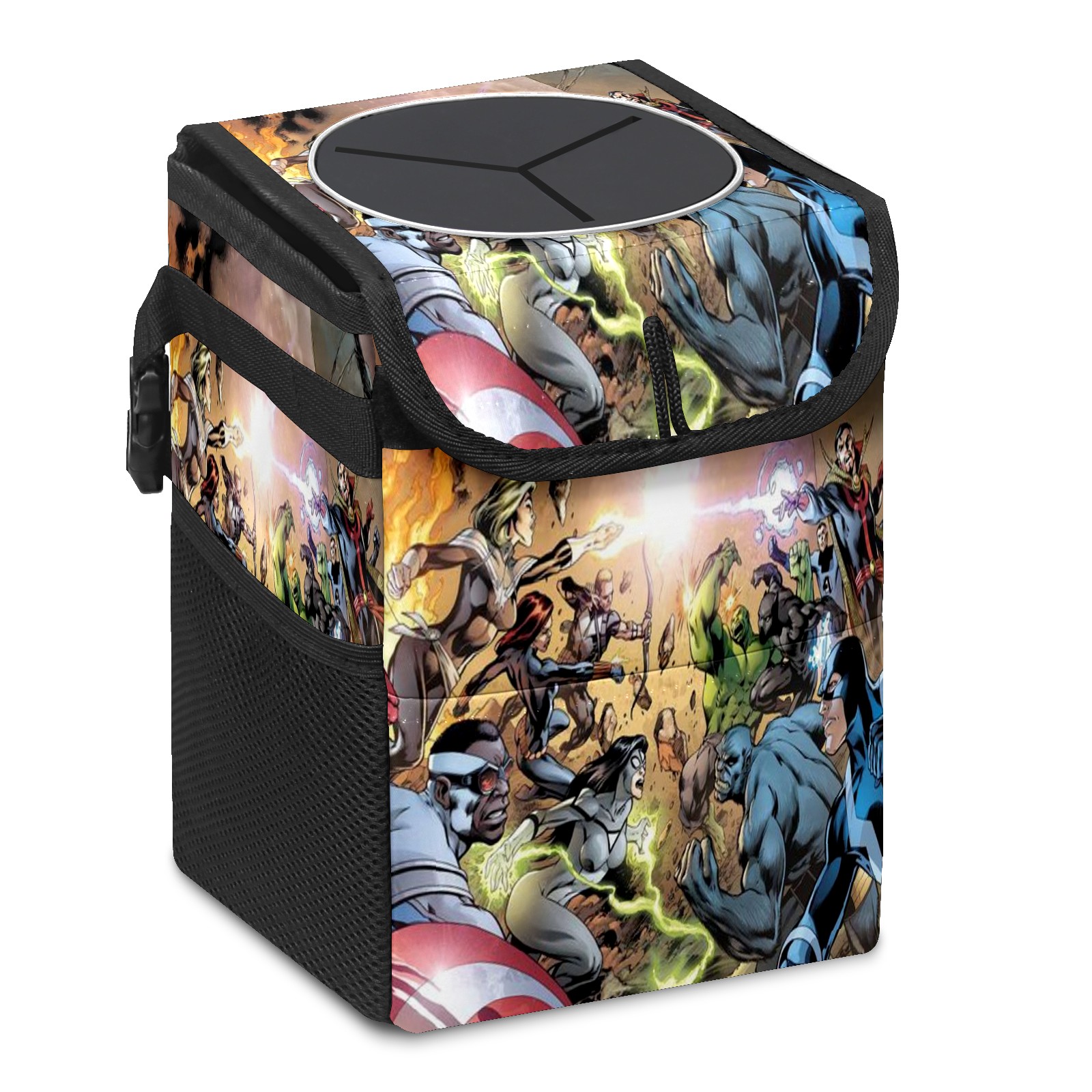Car Trash Can with Lid, Small Portable Hanging Automotive Garbage Bin for Vehicles, Leakproof Waste Bag Container for SUV Truck Van Interior Auto Travel Road Trips(漫威 (1095))