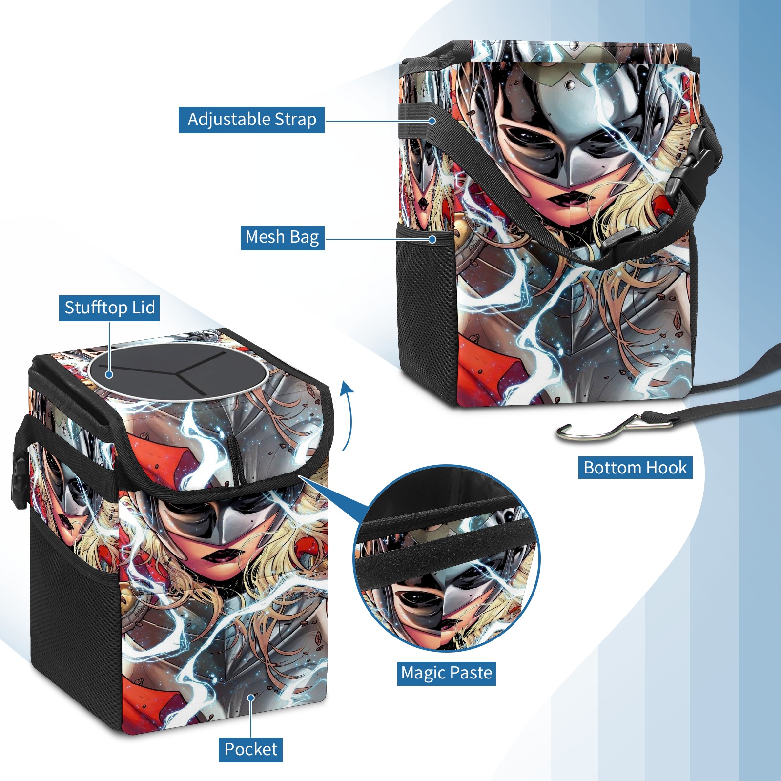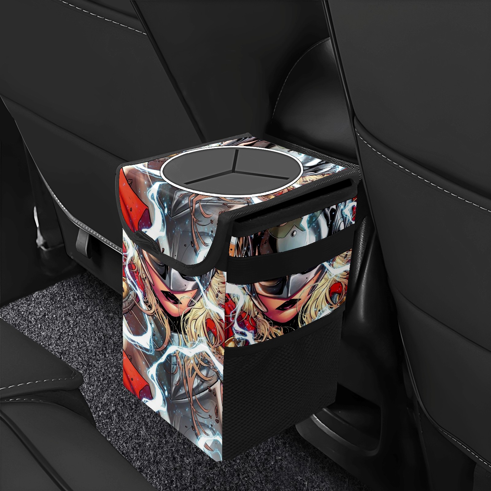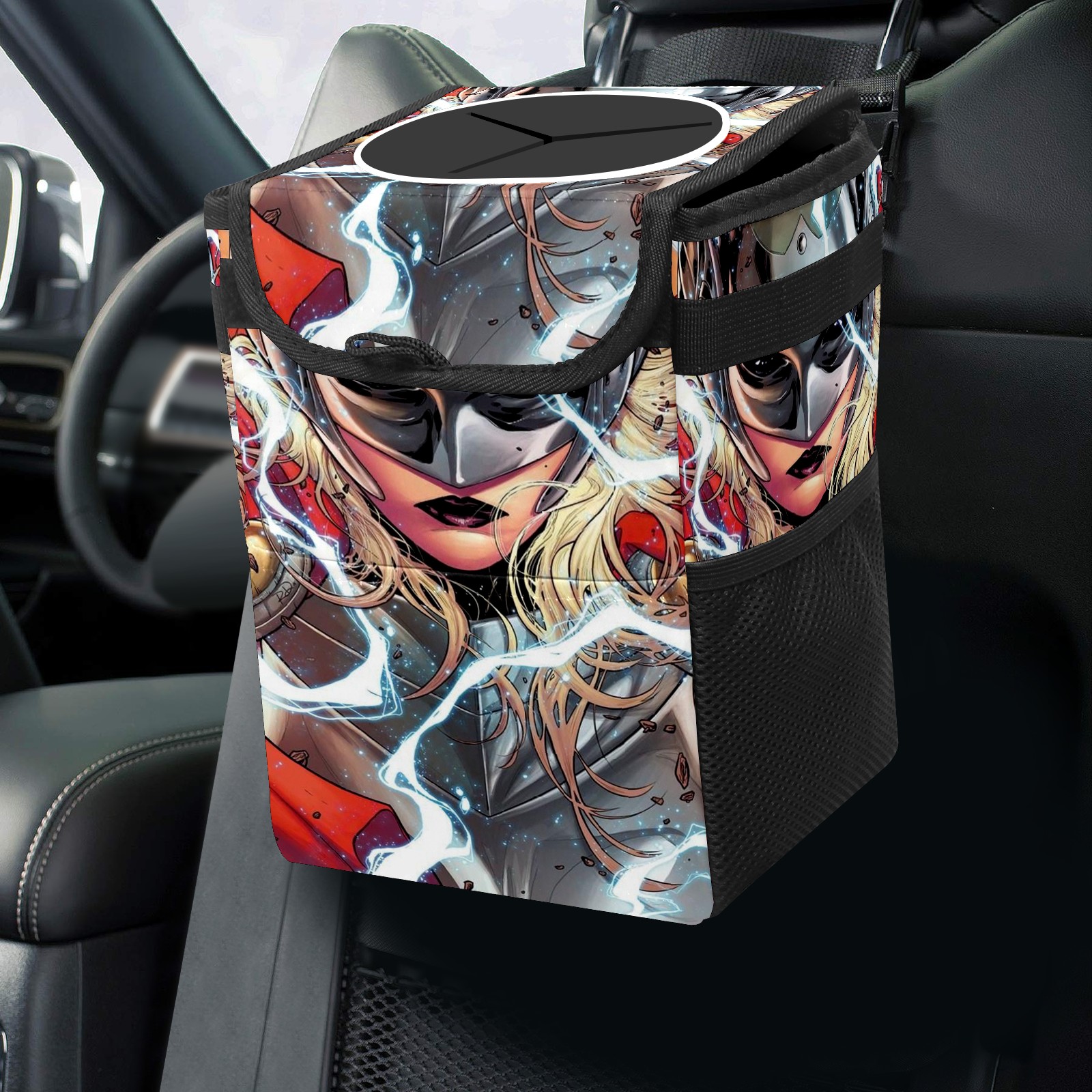 Car Trash Can with Lid, Small Portable Hanging Automotive Garbage Bin for Vehicles, Leakproof Waste Bag Container for SUV Truck Van Interior Auto Travel Road Trips(漫威 (1093))
