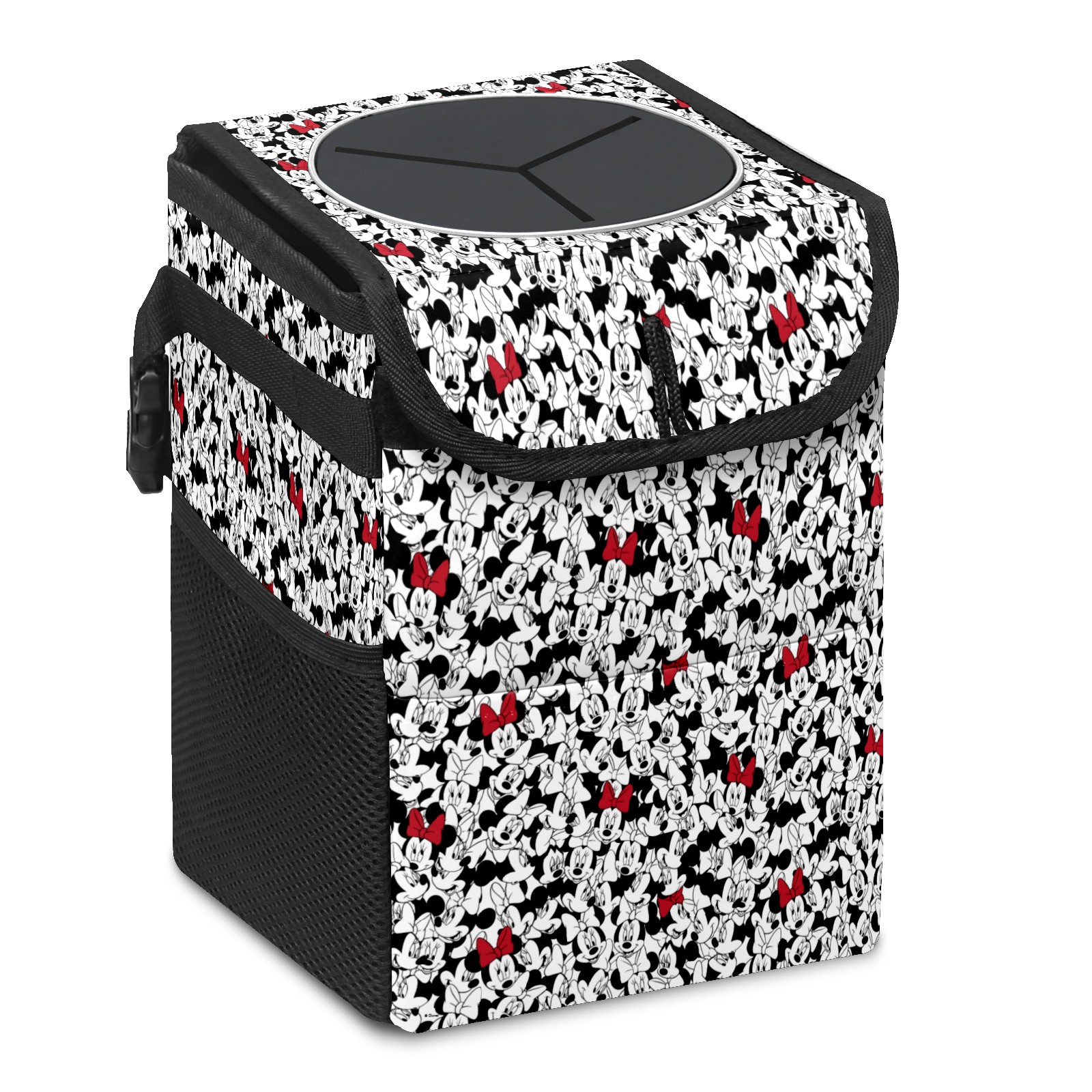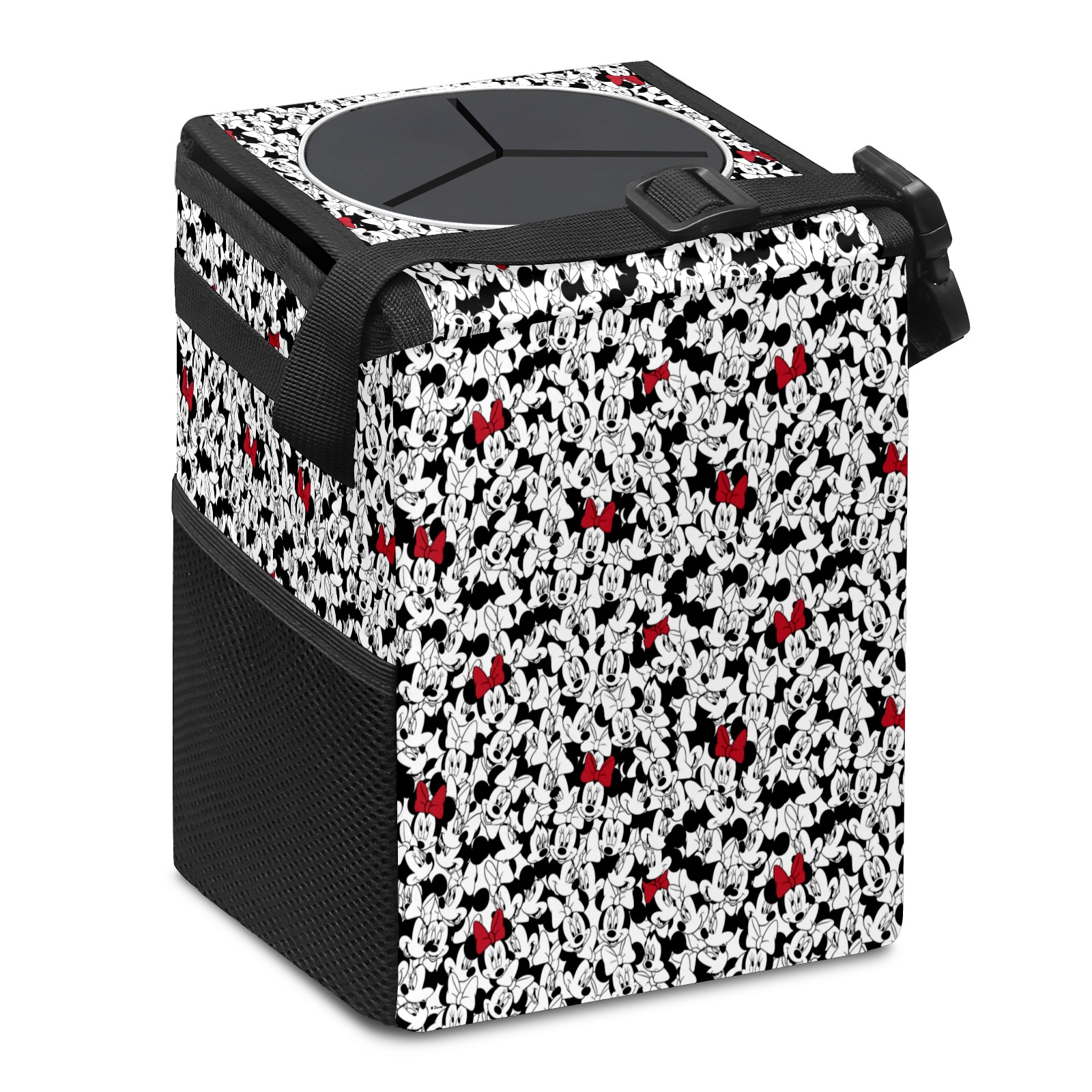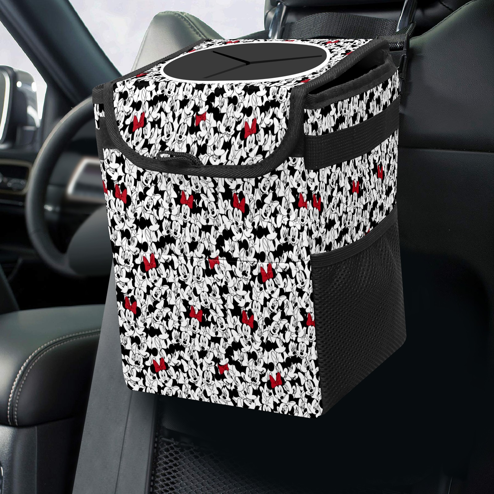 Car Trash Can with Lid, Small Portable Hanging Automotive Garbage Bin for Vehicles, Leakproof Waste Bag Container for SUV Truck Van Interior Auto Travel Road Trips(Mickey Mouse Minnie Red Bow Pattern)