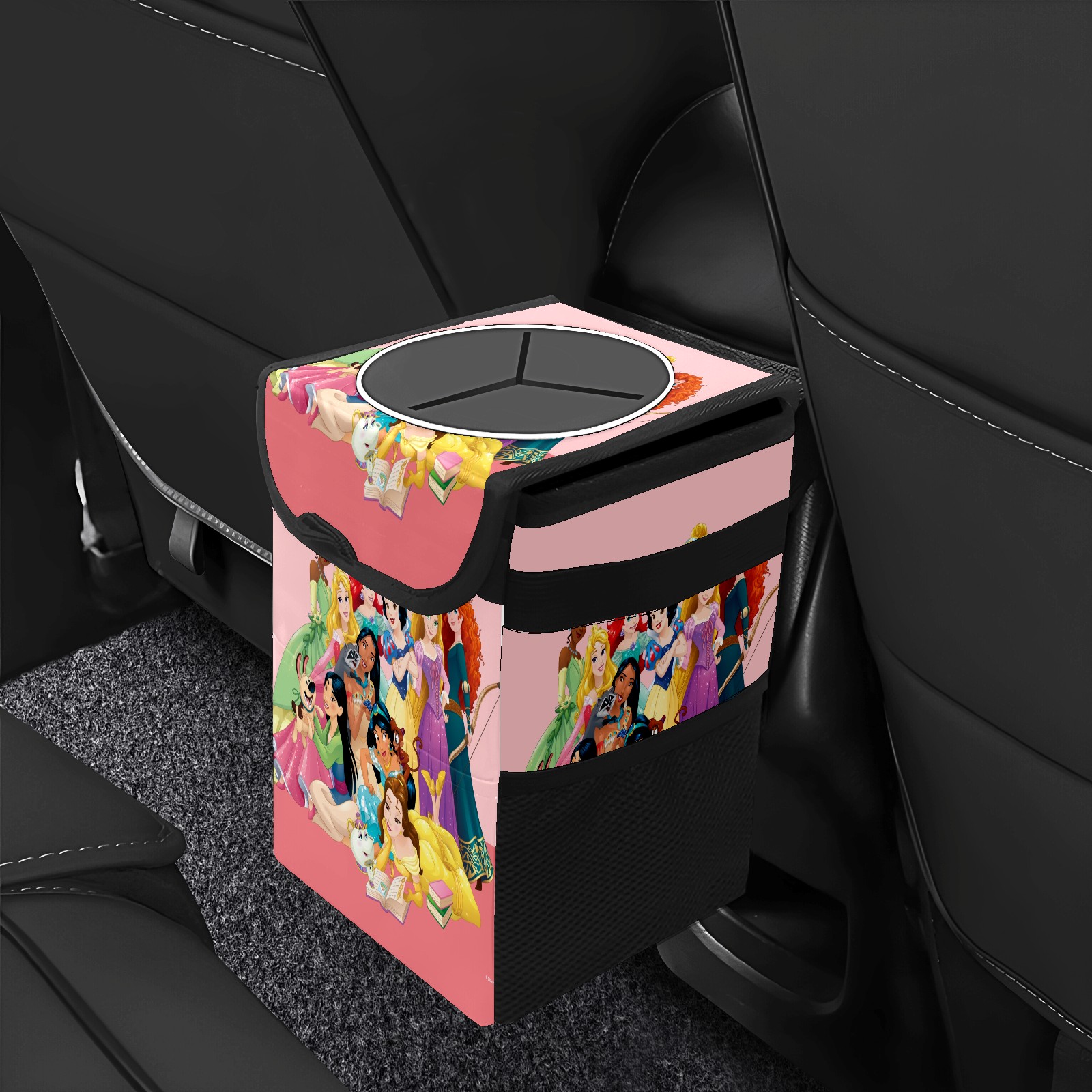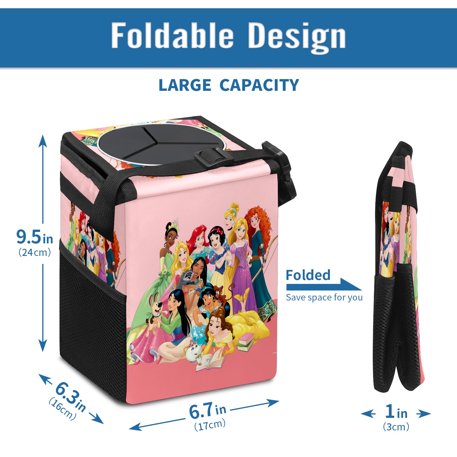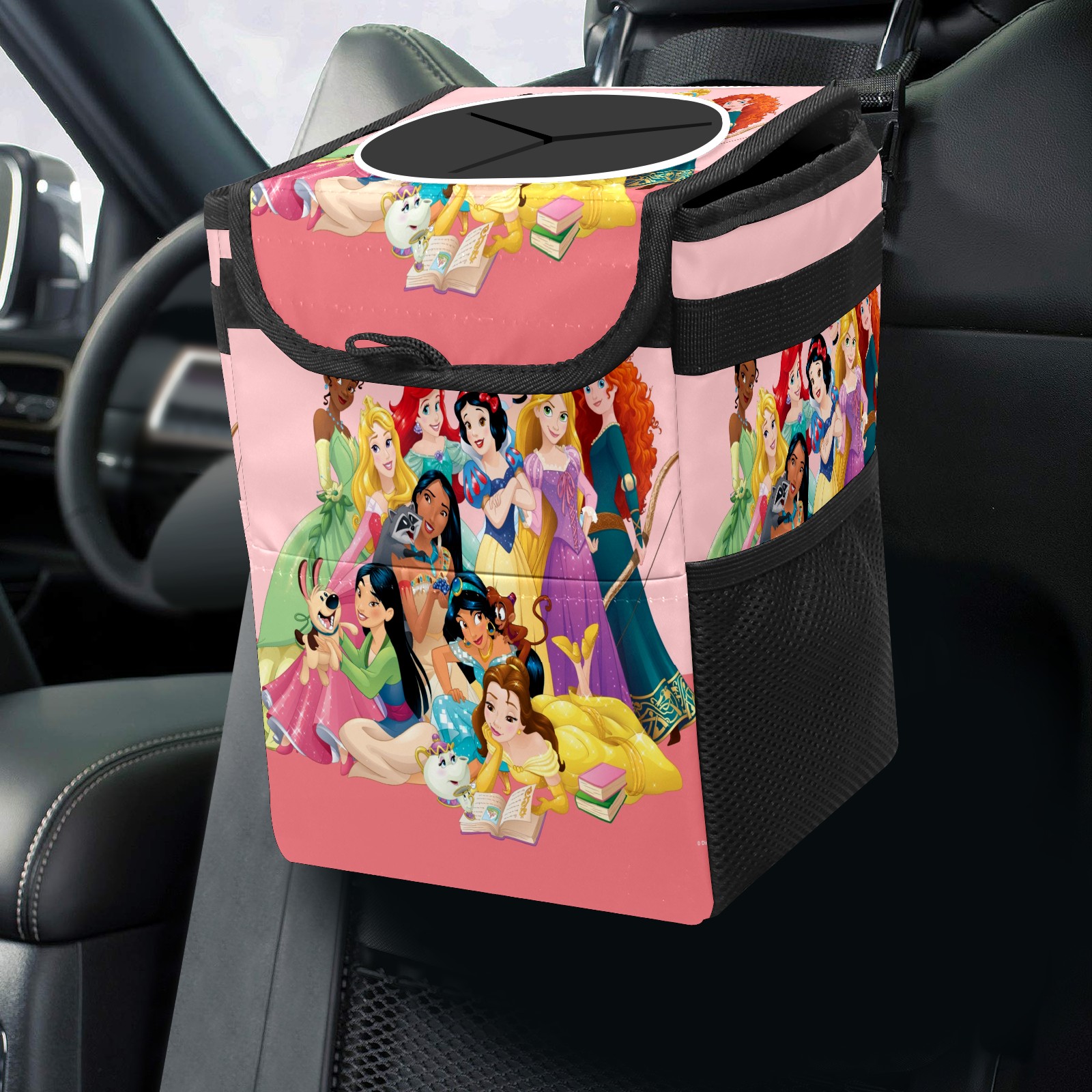Car Trash Can with Lid, Small Portable Hanging Automotive Garbage Bin for Vehicles, Leakproof Waste Bag Container for SUV Truck Van Interior Auto Travel Road Trips(Disney Princess Friends)