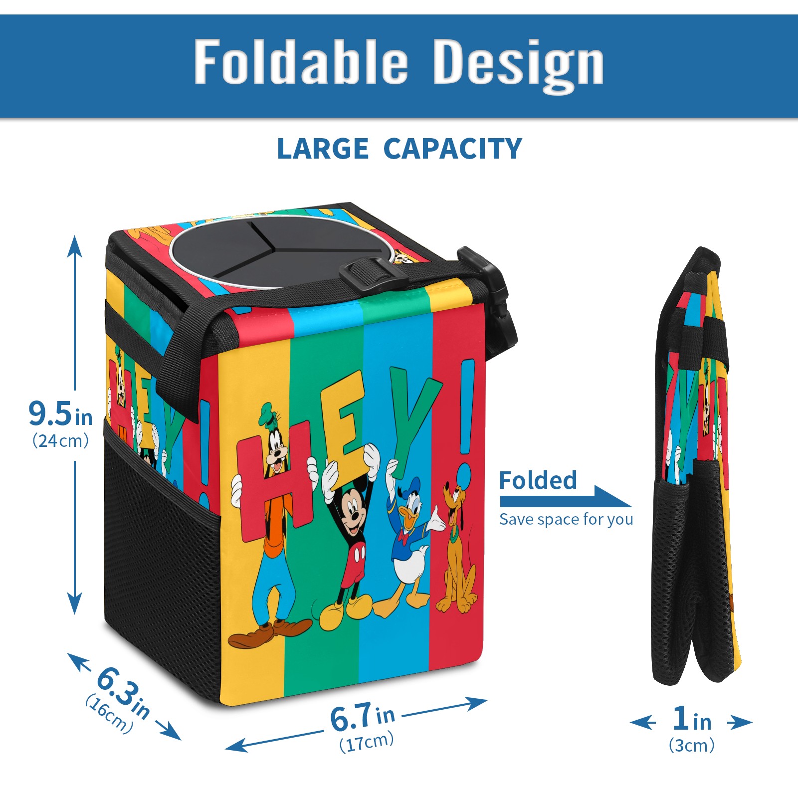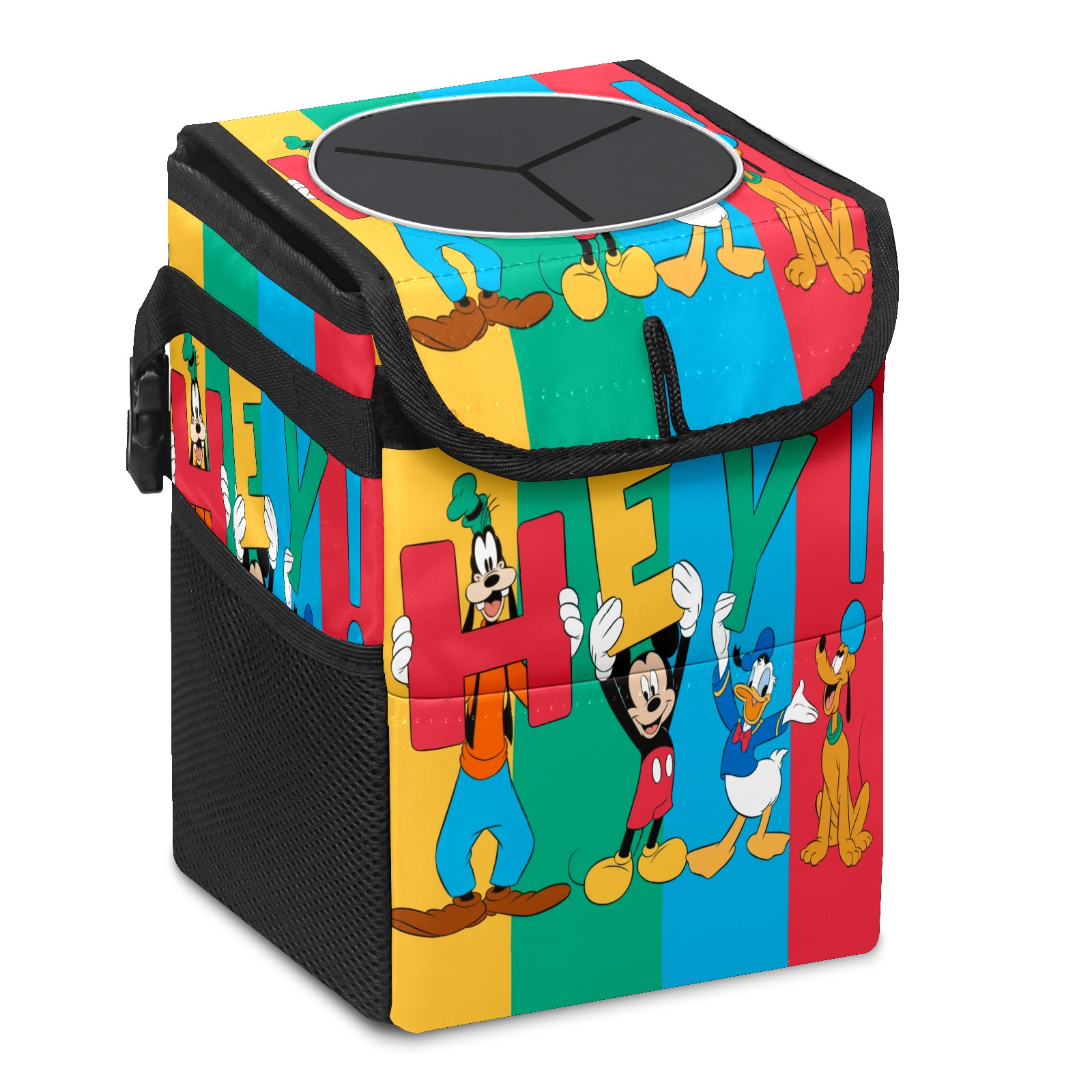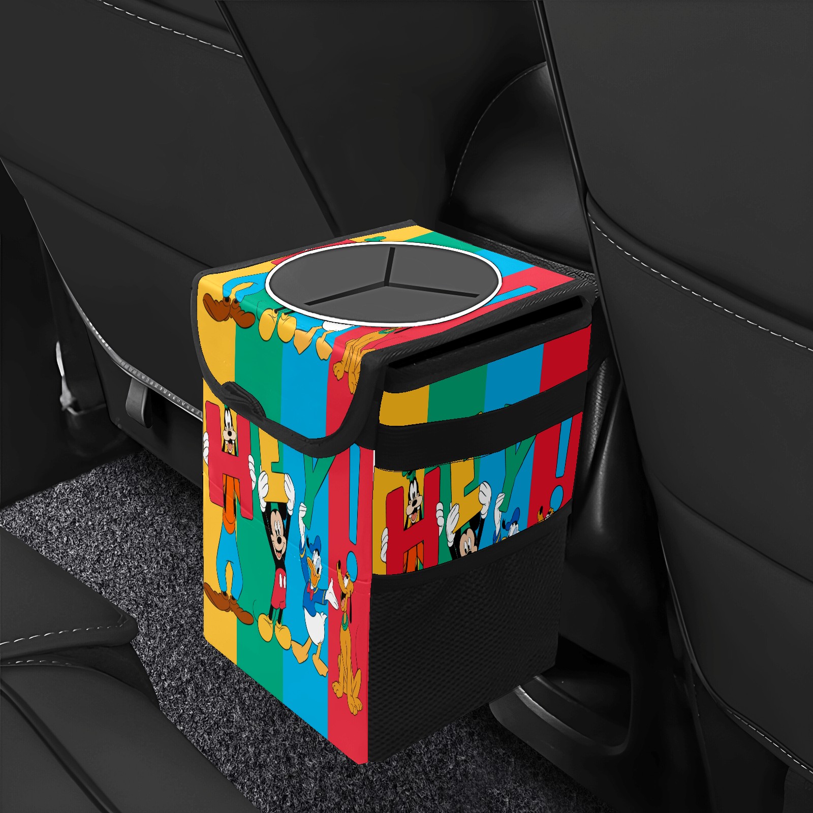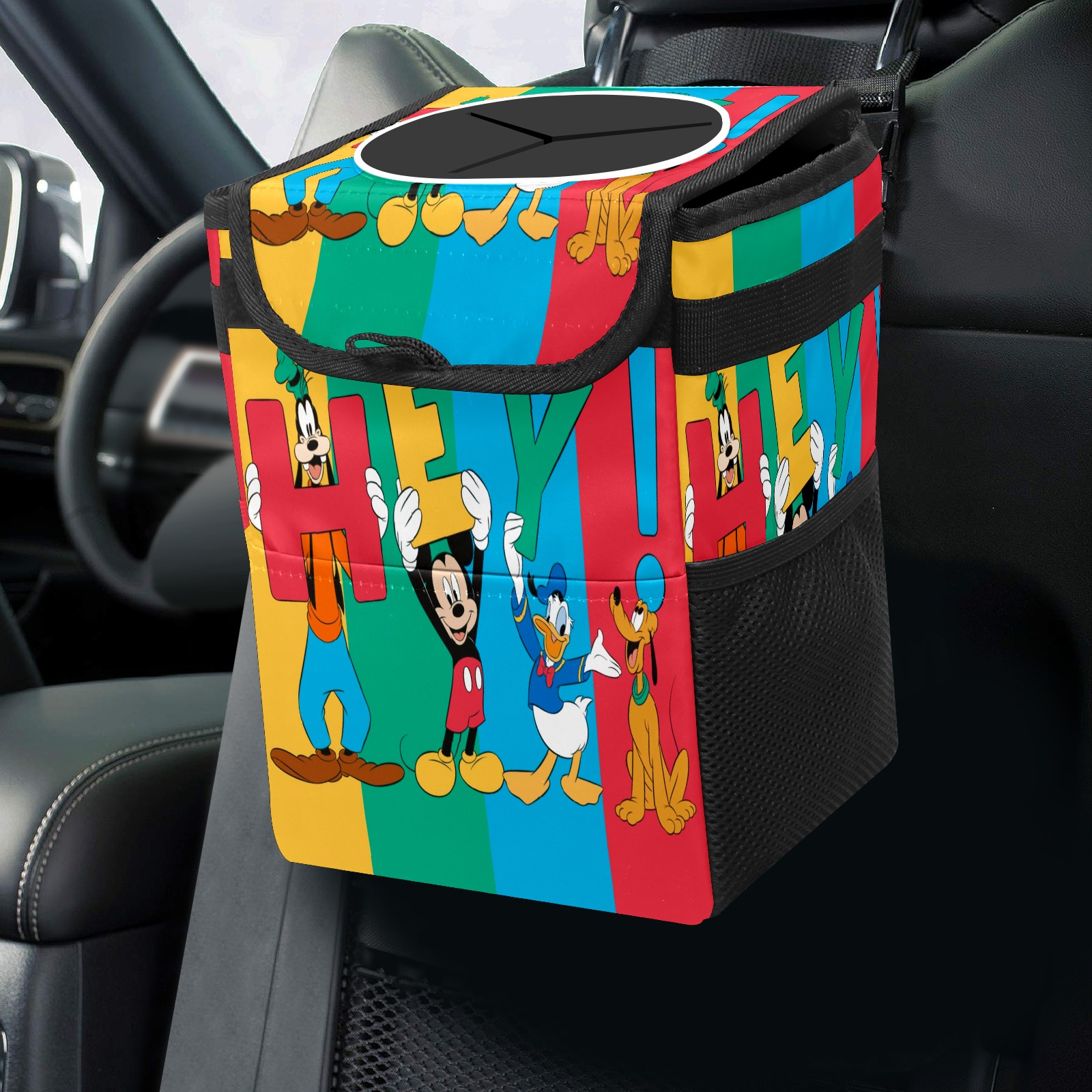 Car Trash Can with Lid, Small Portable Hanging Automotive Garbage Bin for Vehicles, Leakproof Waste Bag Container for SUV Truck Van Interior Auto Travel Road Trips(Goofy Mickey Donald Pluto - Hey)