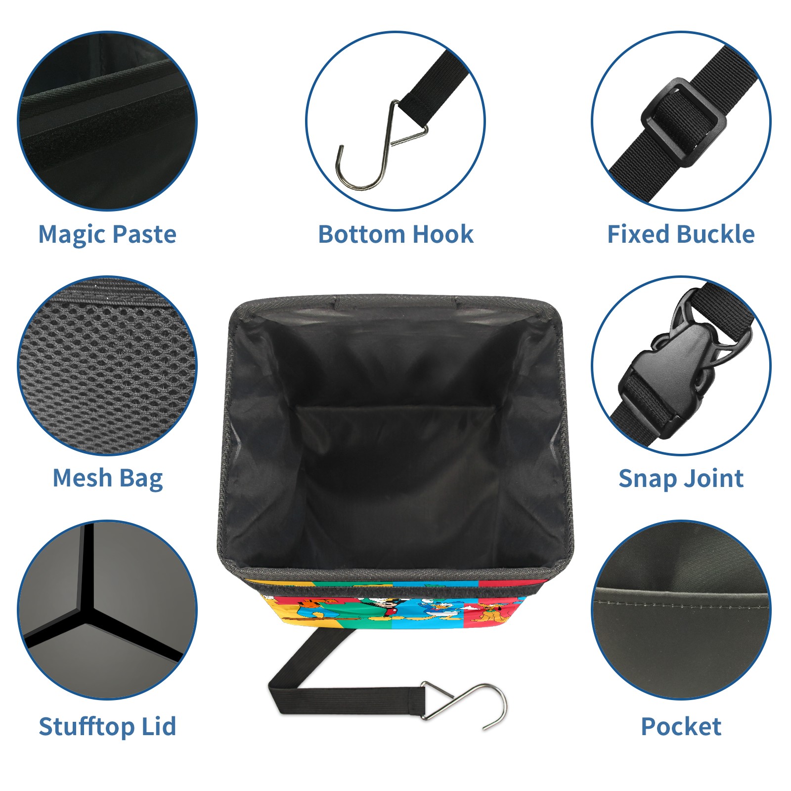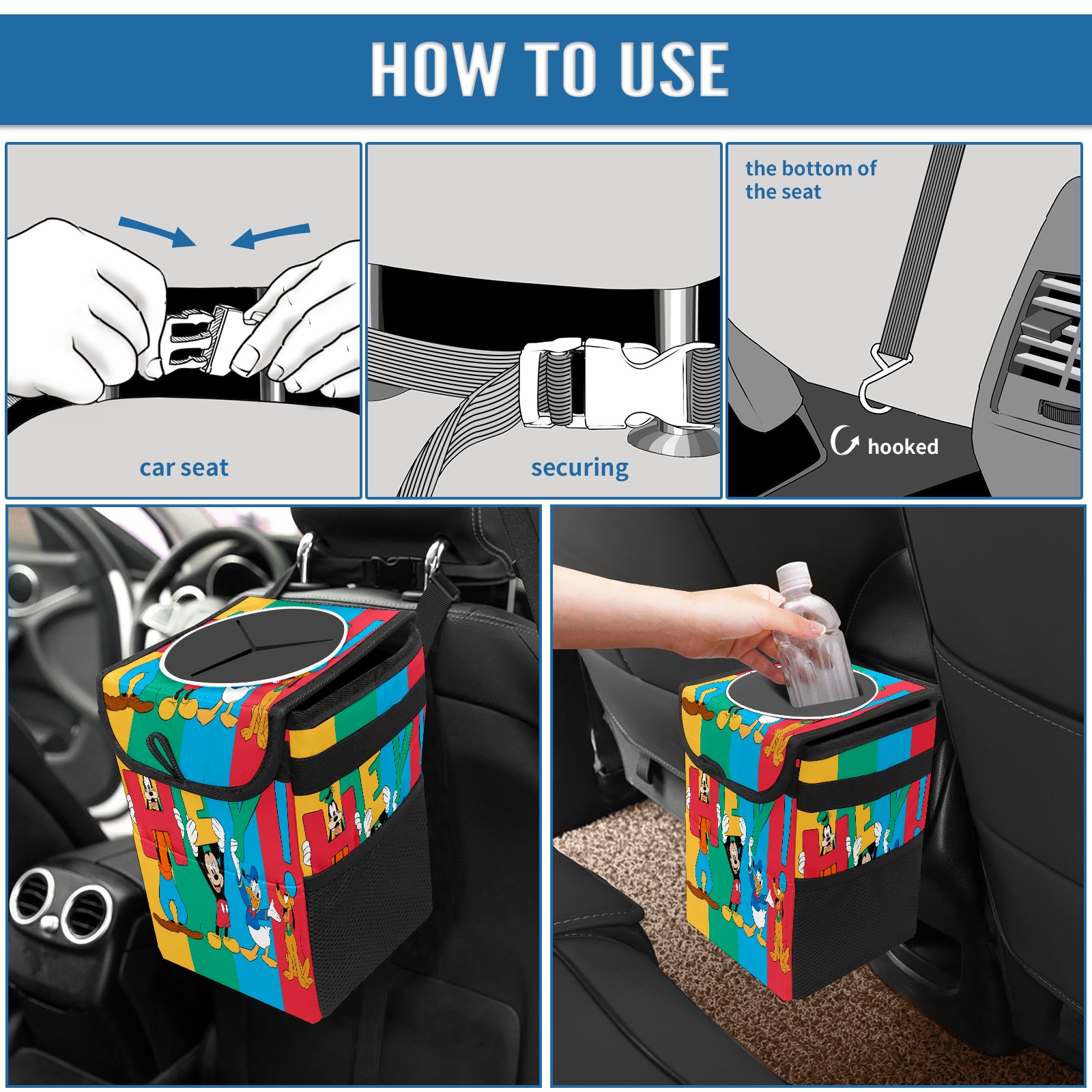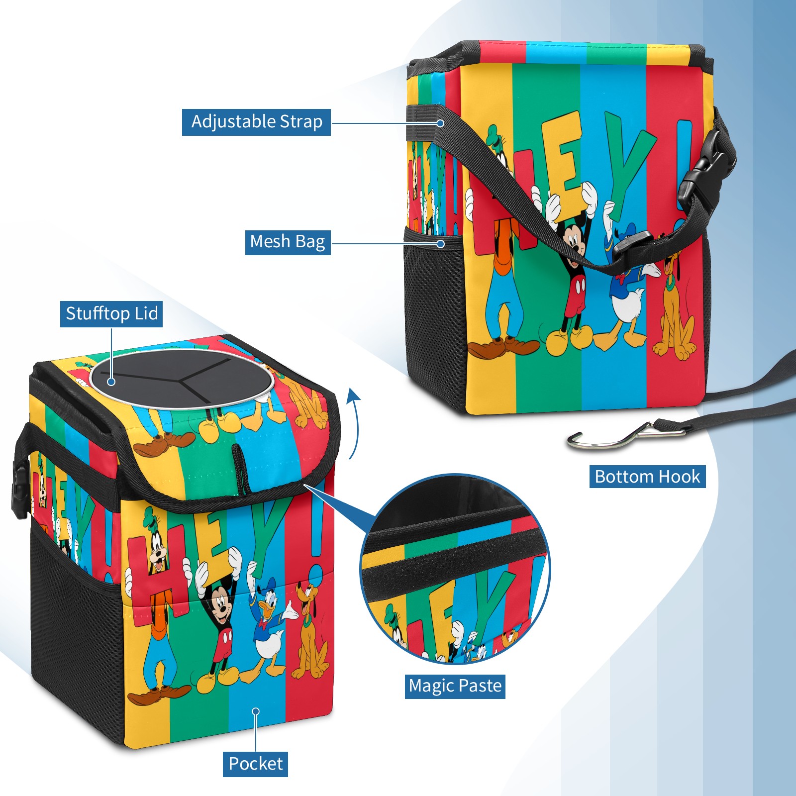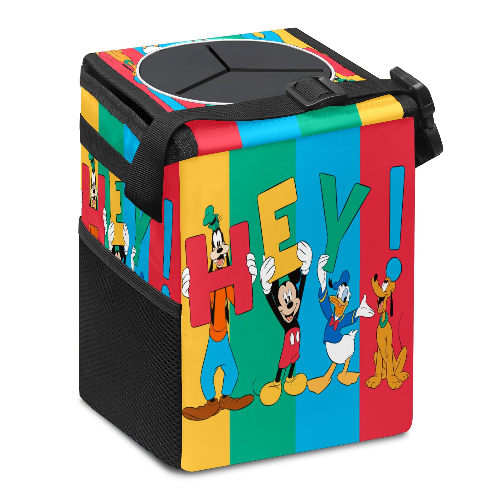Car Trash Can with Lid, Small Portable Hanging Automotive Garbage Bin for Vehicles, Leakproof Waste Bag Container for SUV Truck Van Interior Auto Travel Road Trips(Goofy Mickey Donald Pluto - Hey)