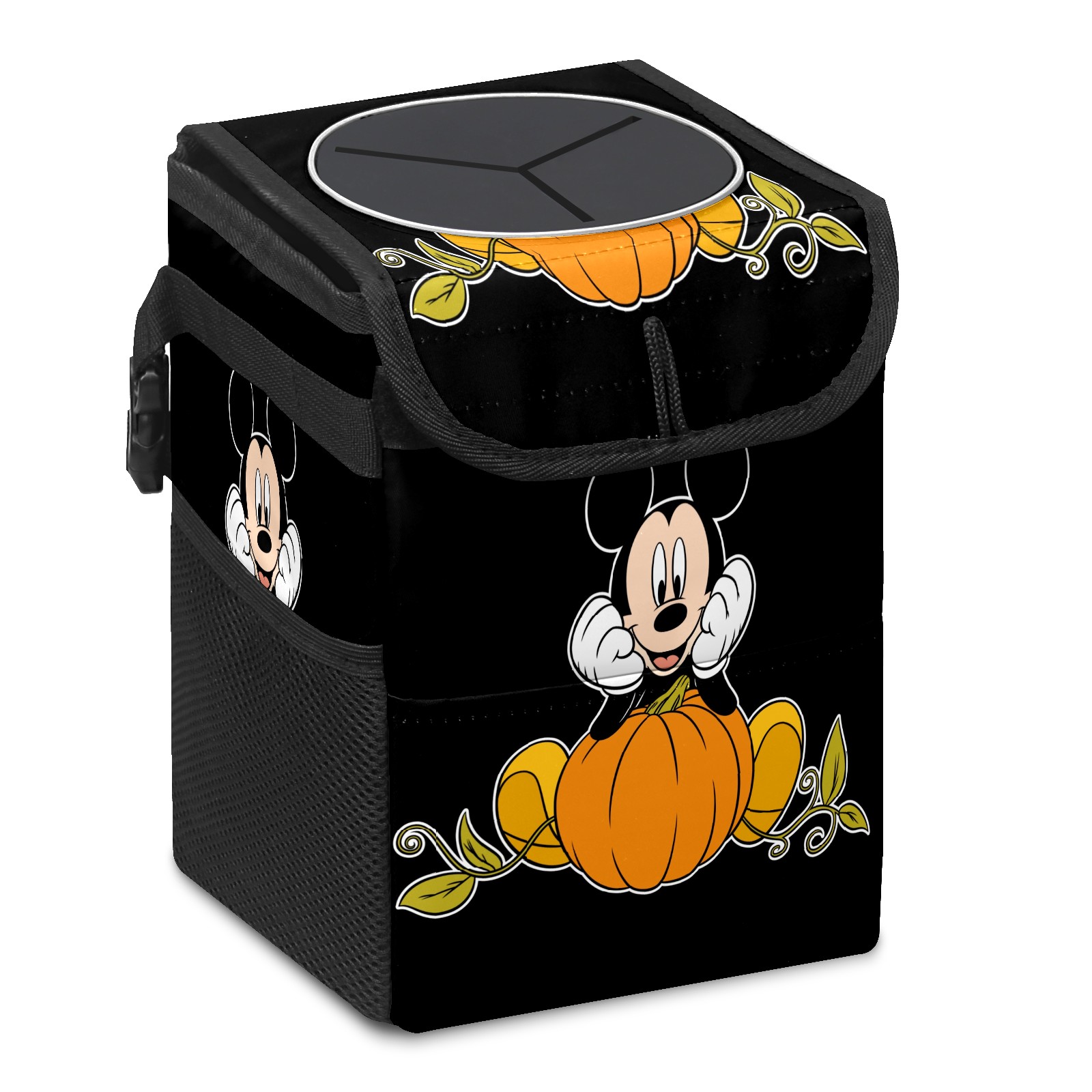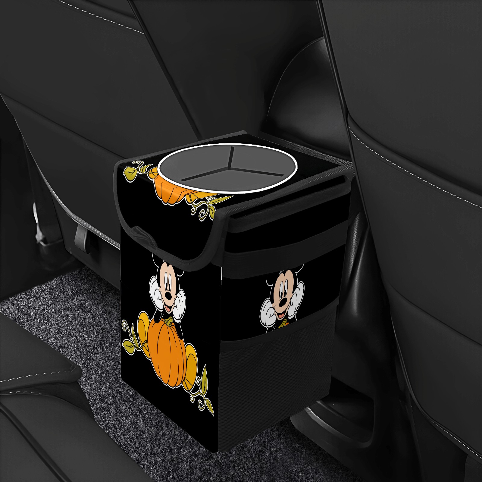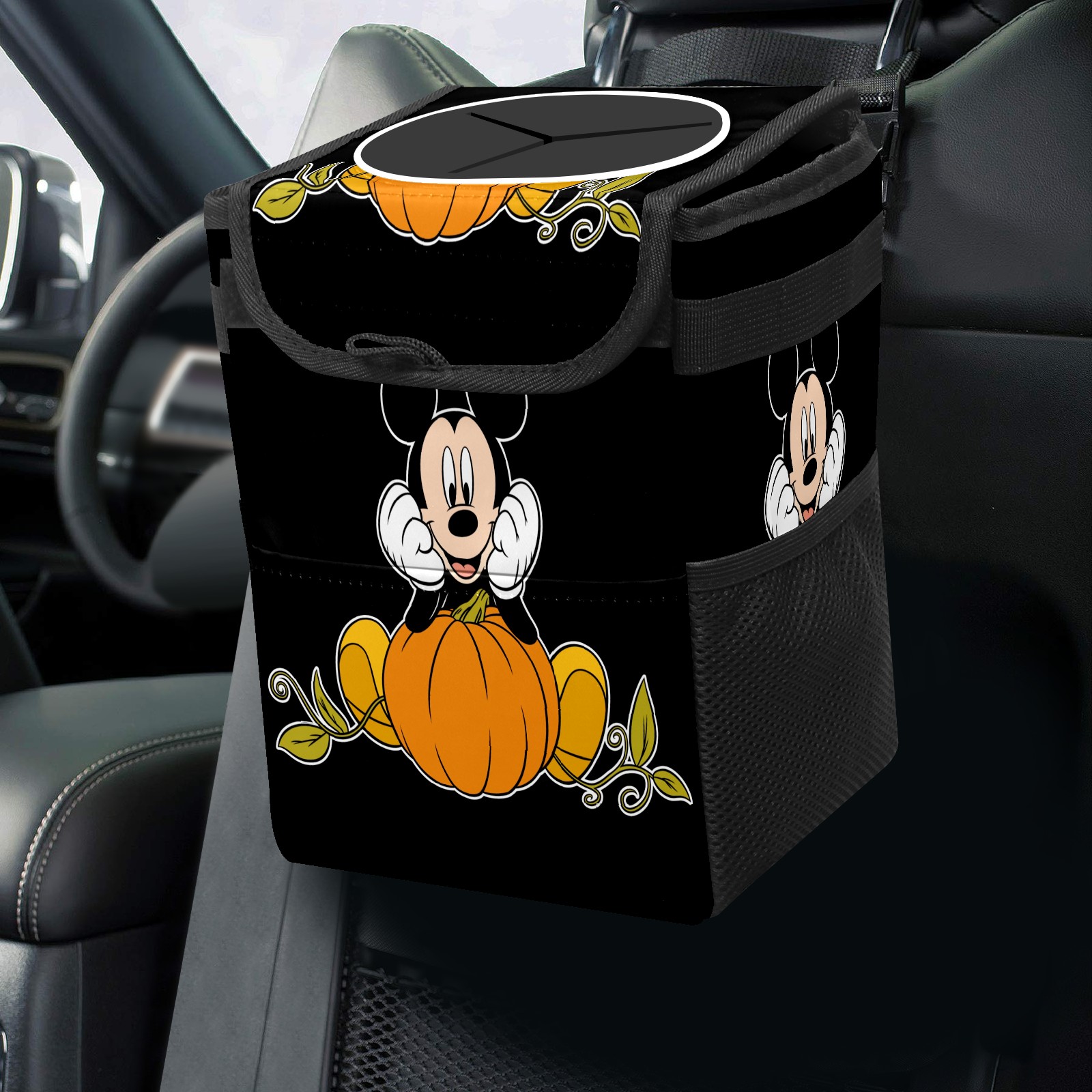 Car Trash Can with Lid, Small Portable Hanging Automotive Garbage Bin for Vehicles, Leakproof Waste Bag Container for SUV Truck Van Interior Auto Travel Road Trips(Mickey Mouse Sitting On Pumpkin)
