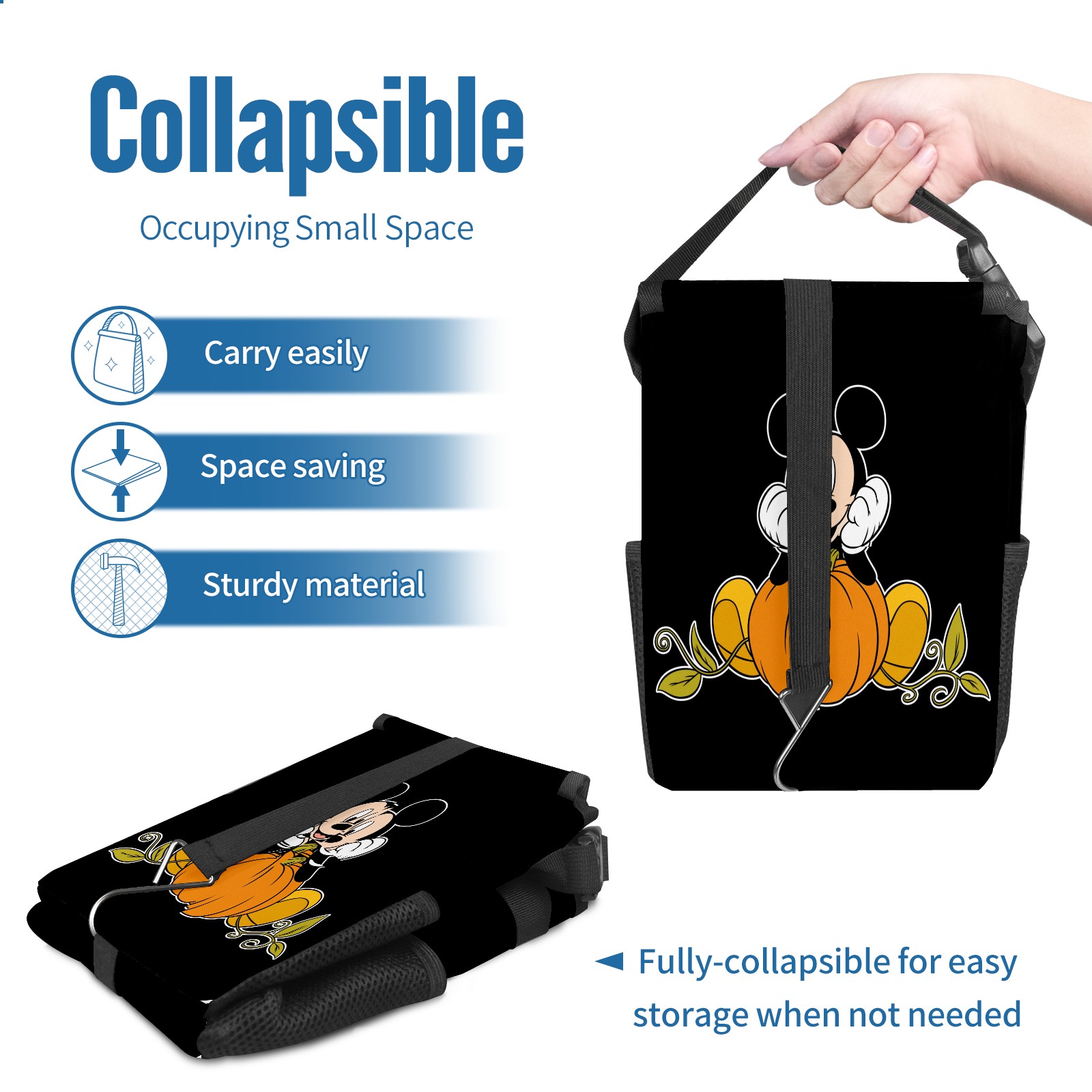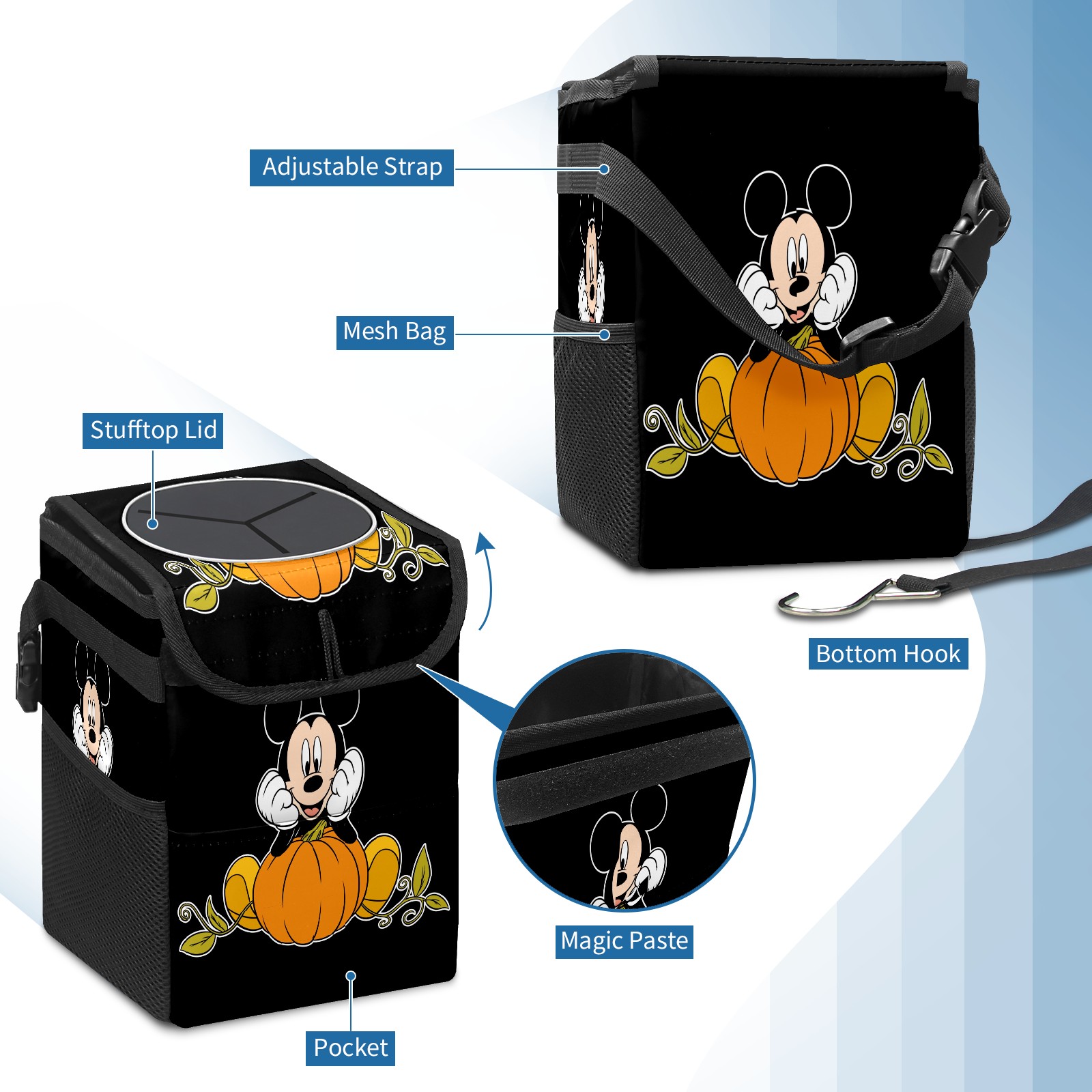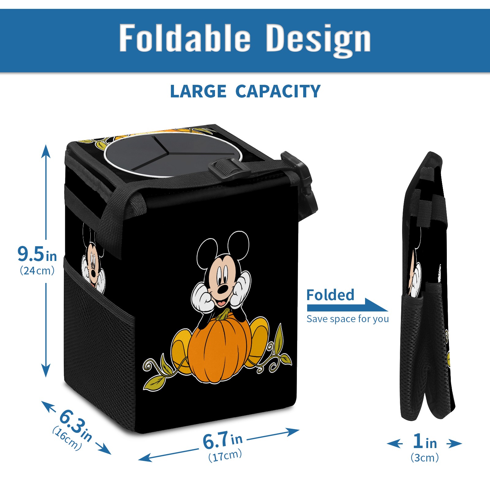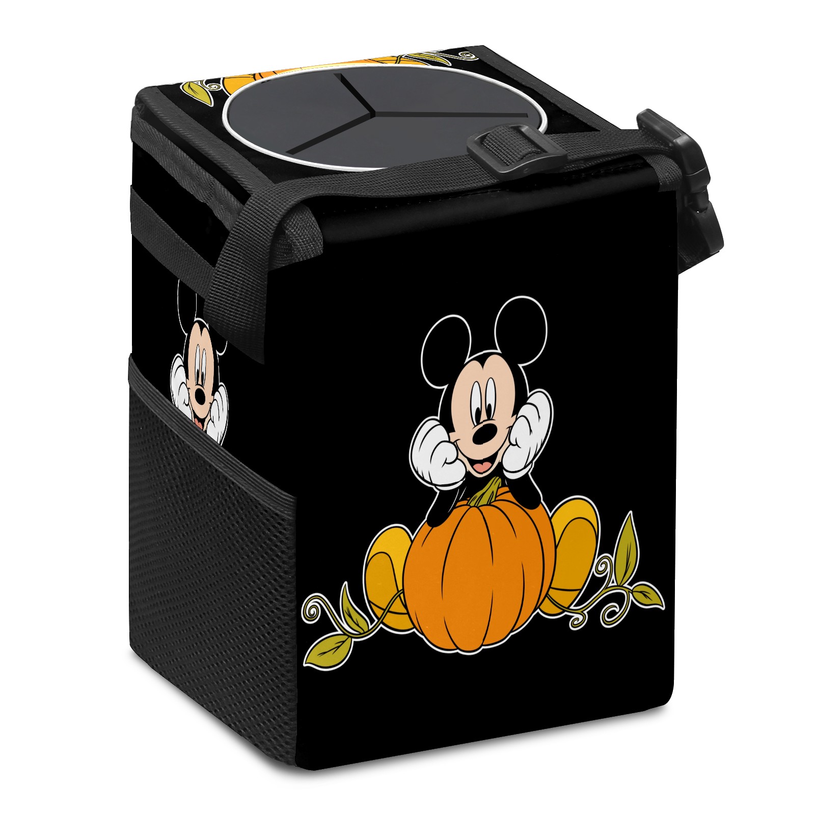 Car Trash Can with Lid, Small Portable Hanging Automotive Garbage Bin for Vehicles, Leakproof Waste Bag Container for SUV Truck Van Interior Auto Travel Road Trips(Mickey Mouse Sitting On Pumpkin)