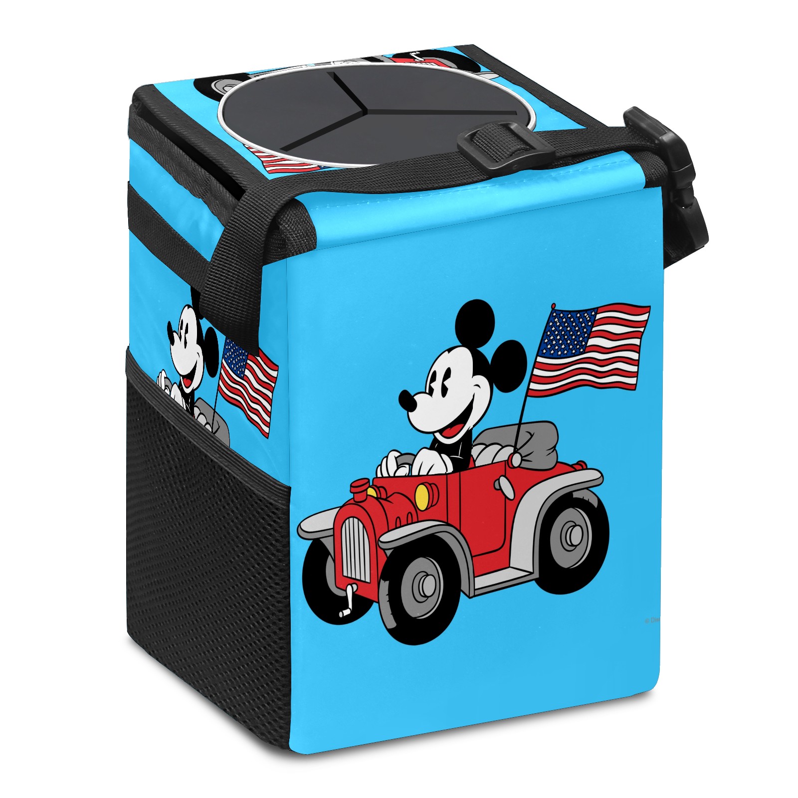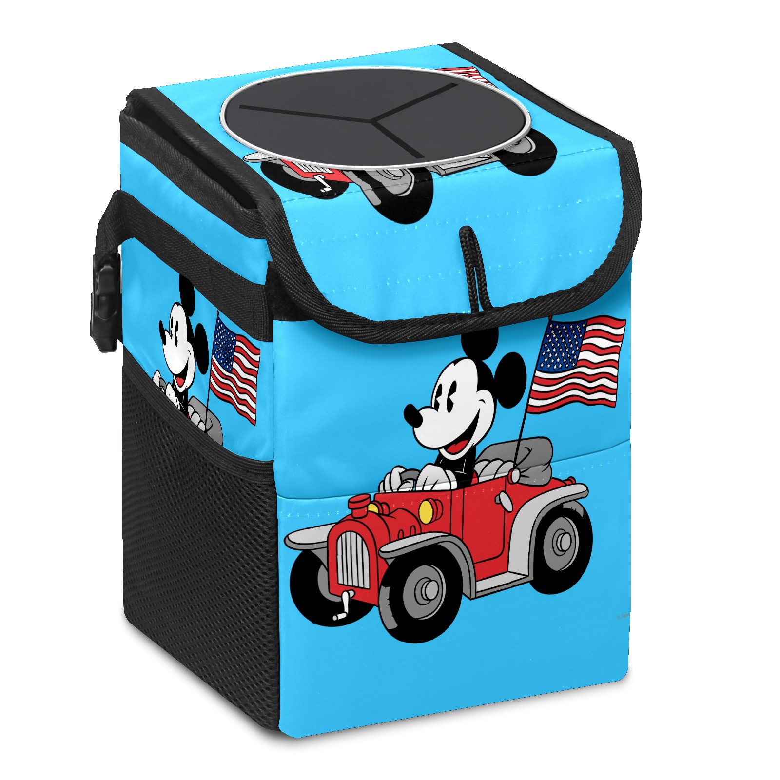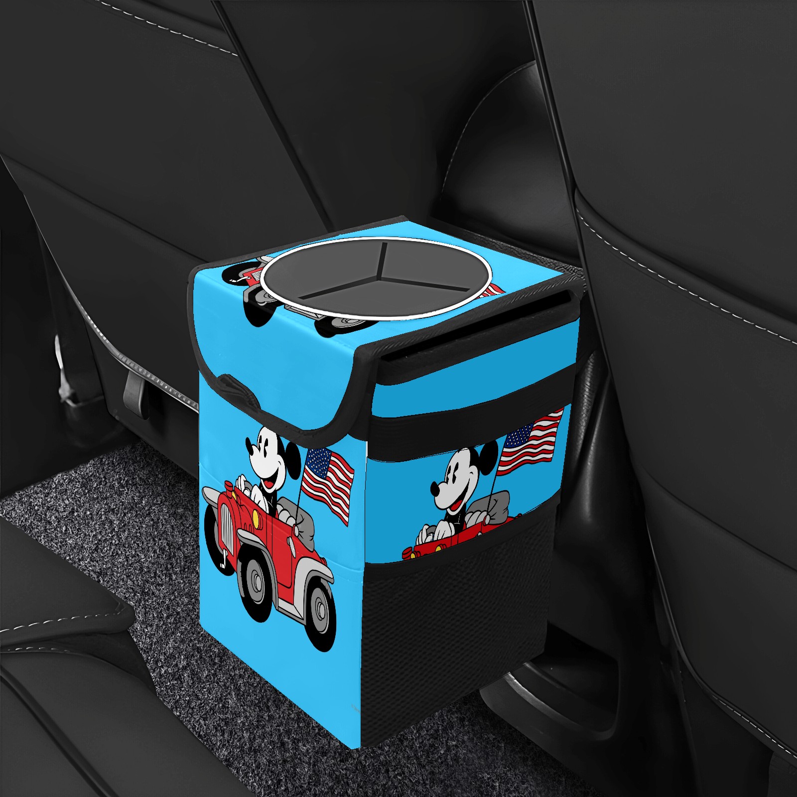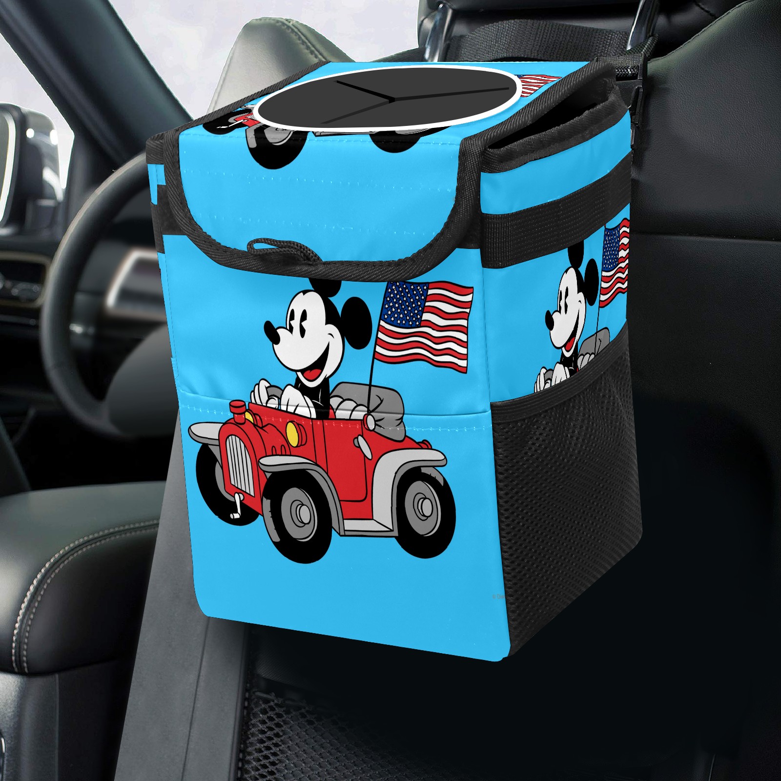 Car Trash Can with Lid, Small Portable Hanging Automotive Garbage Bin for Vehicles, Leakproof Waste Bag Container for SUV Truck Van Interior Auto Travel Road Trips(Holiday Mickey Mouse)