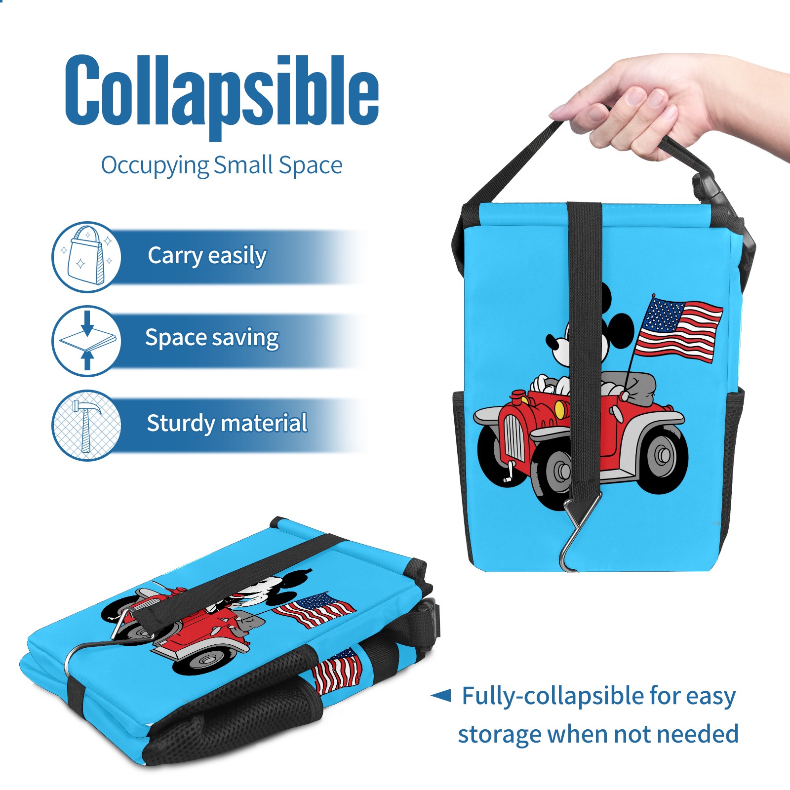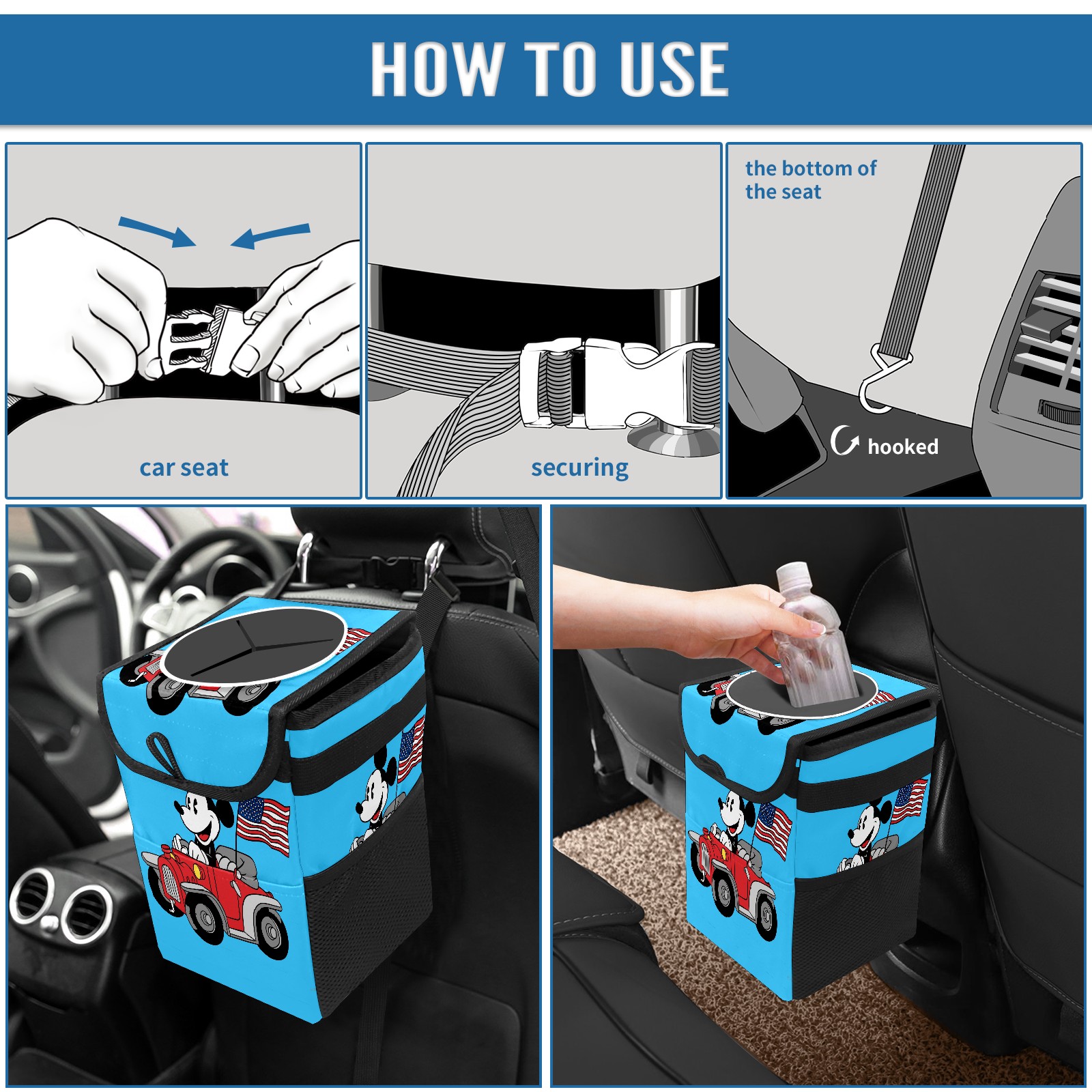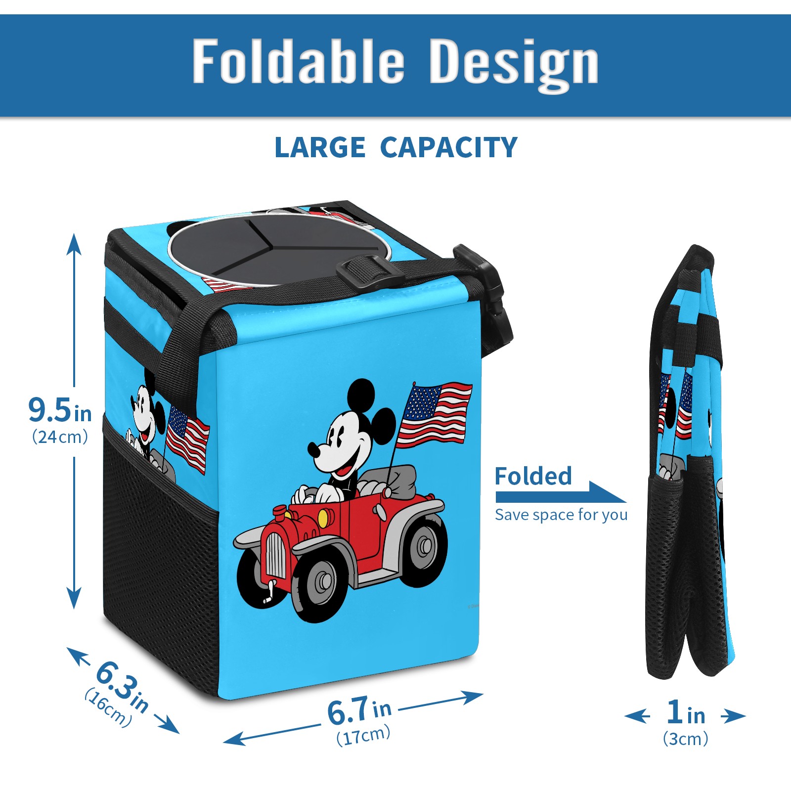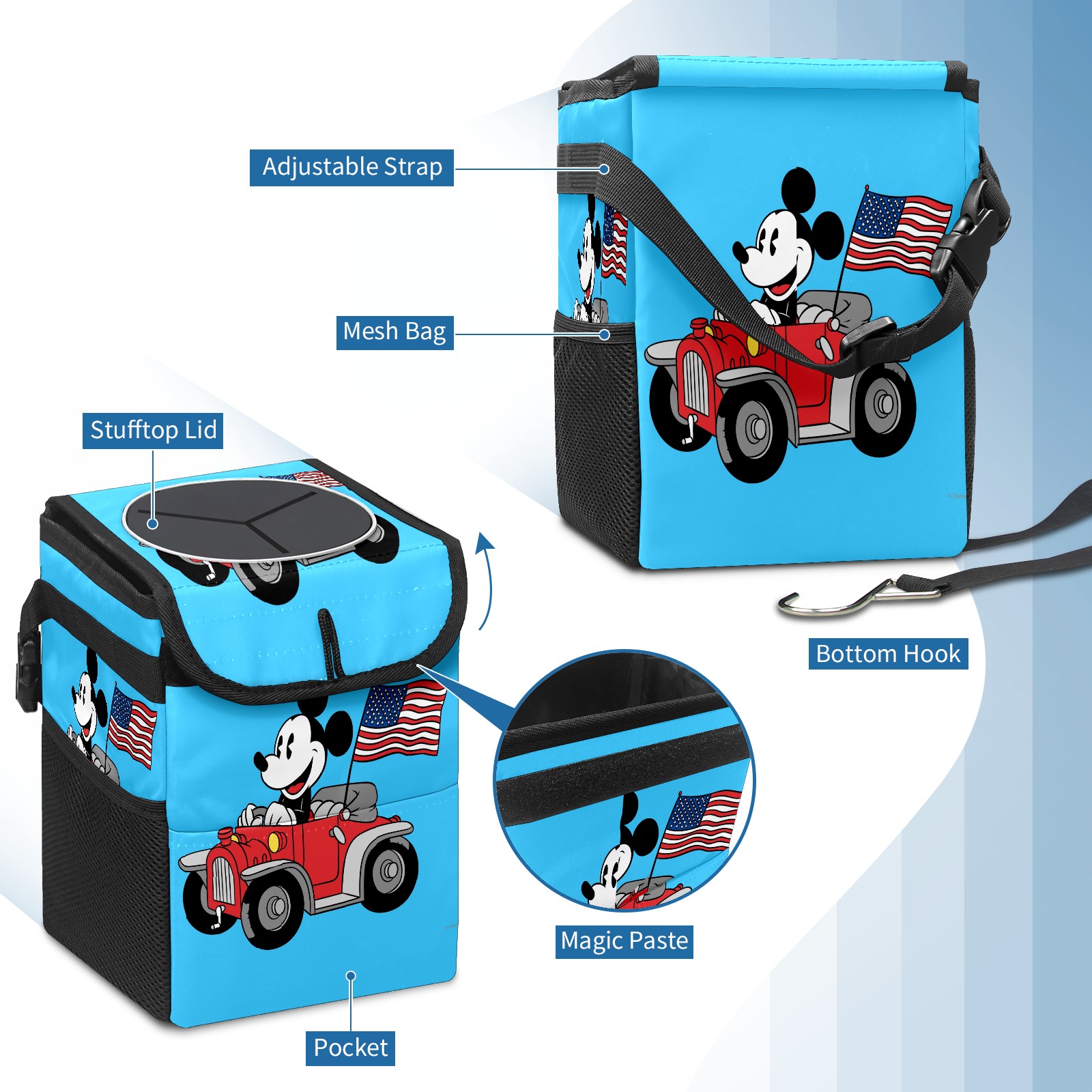 Car Trash Can with Lid, Small Portable Hanging Automotive Garbage Bin for Vehicles, Leakproof Waste Bag Container for SUV Truck Van Interior Auto Travel Road Trips(Holiday Mickey Mouse)