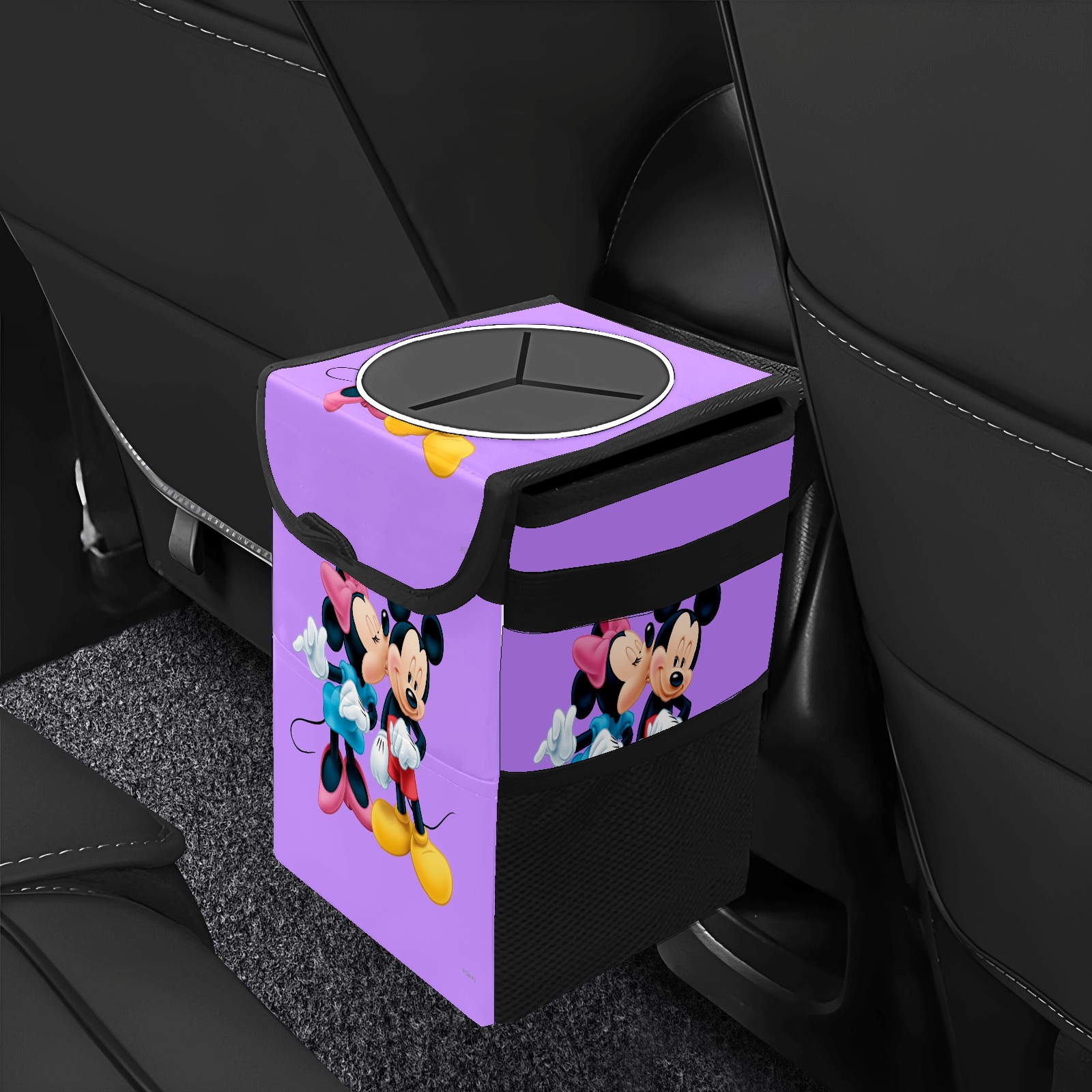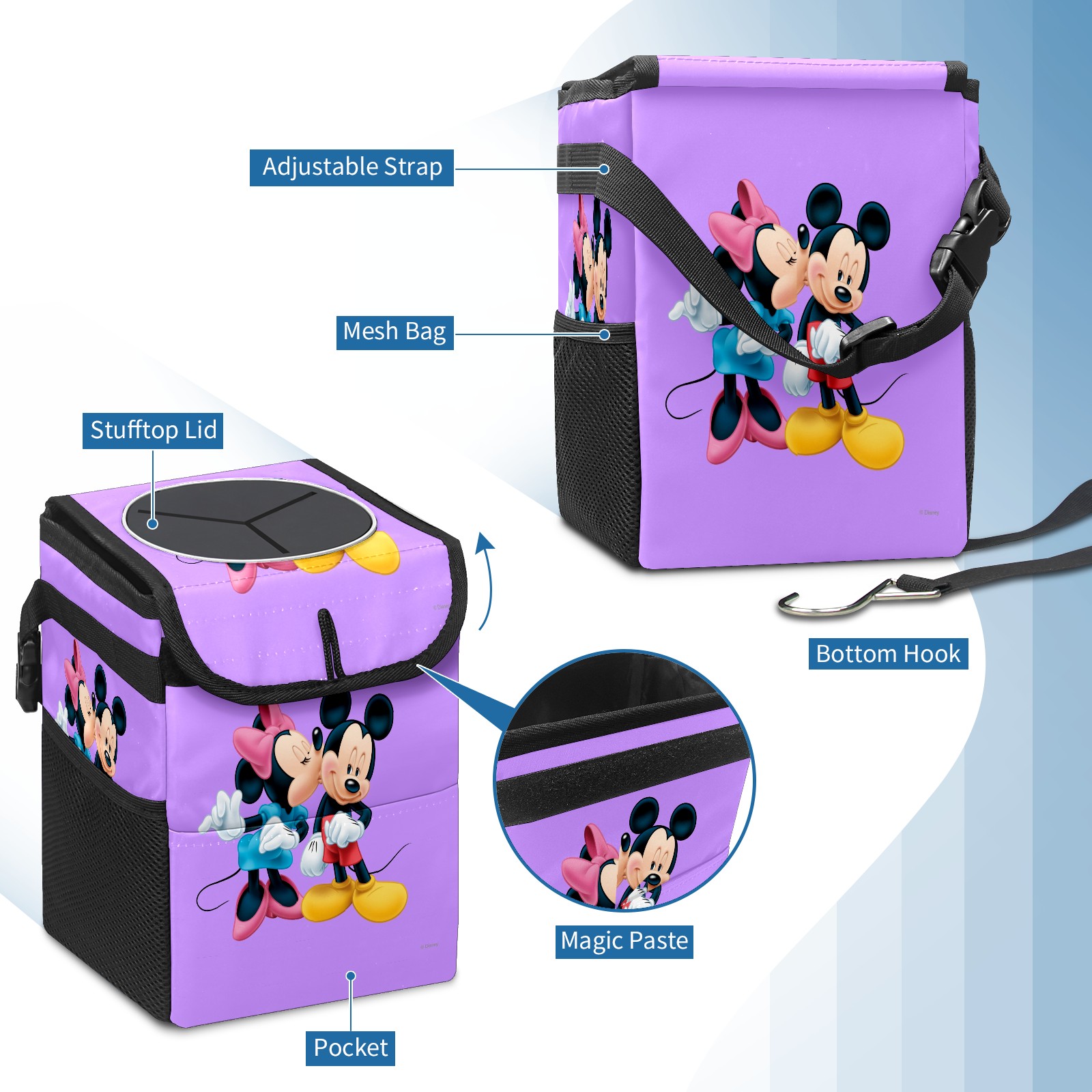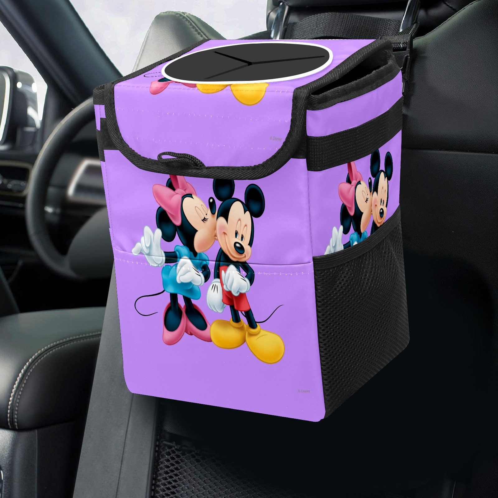 Car Trash Can with Lid, Small Portable Hanging Automotive Garbage Bin for Vehicles, Leakproof Waste Bag Container for SUV Truck Van Interior Auto Travel Road Trips(Minnie Kissing Mickey Mouse Purple)