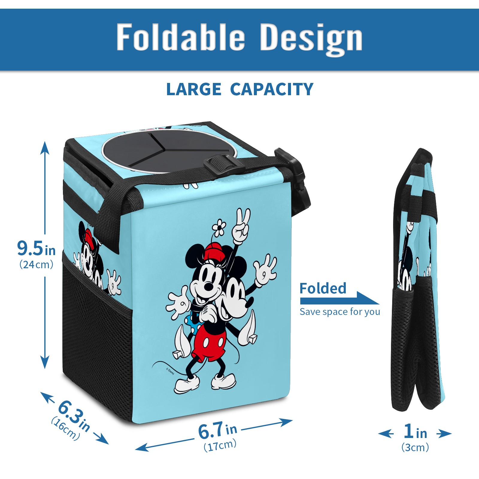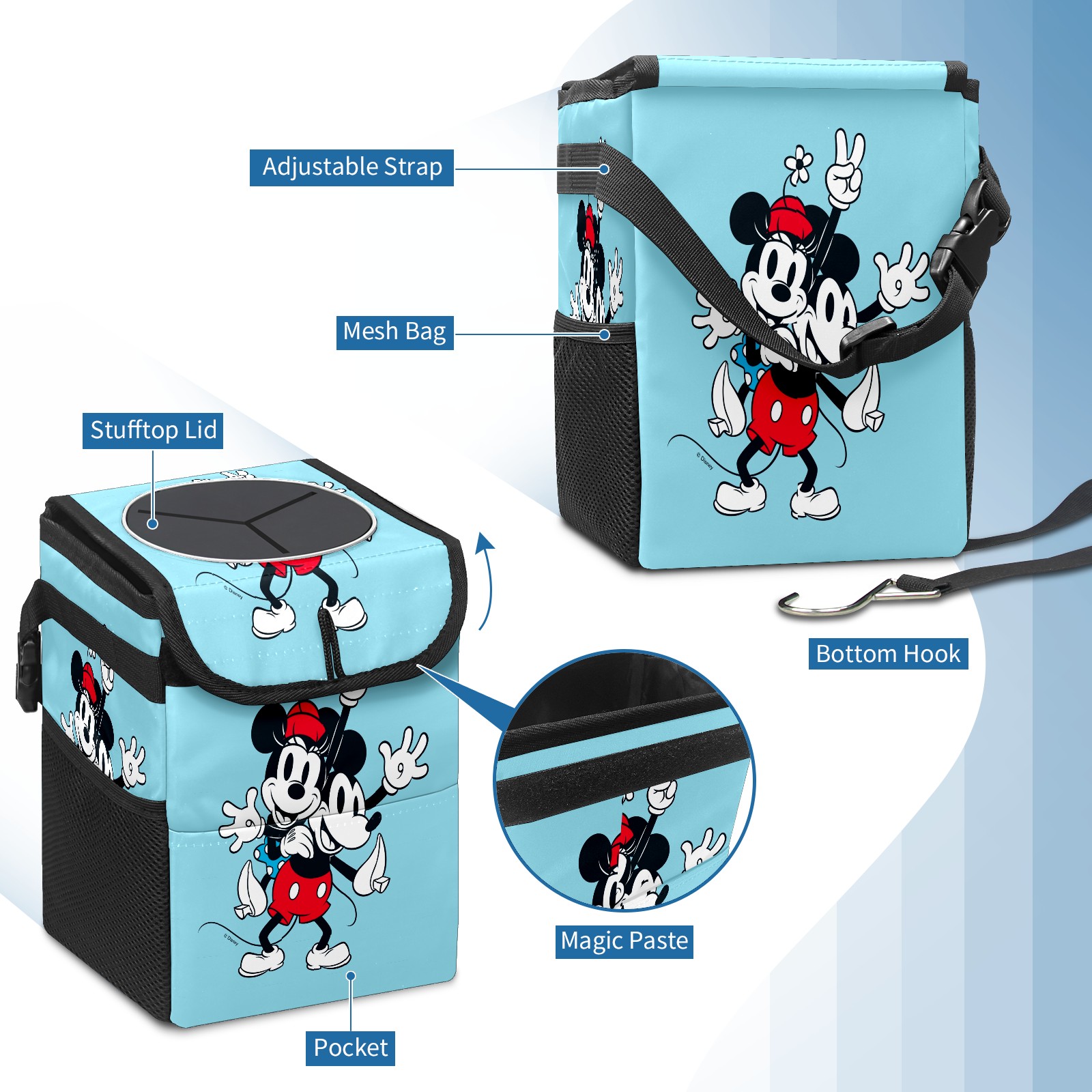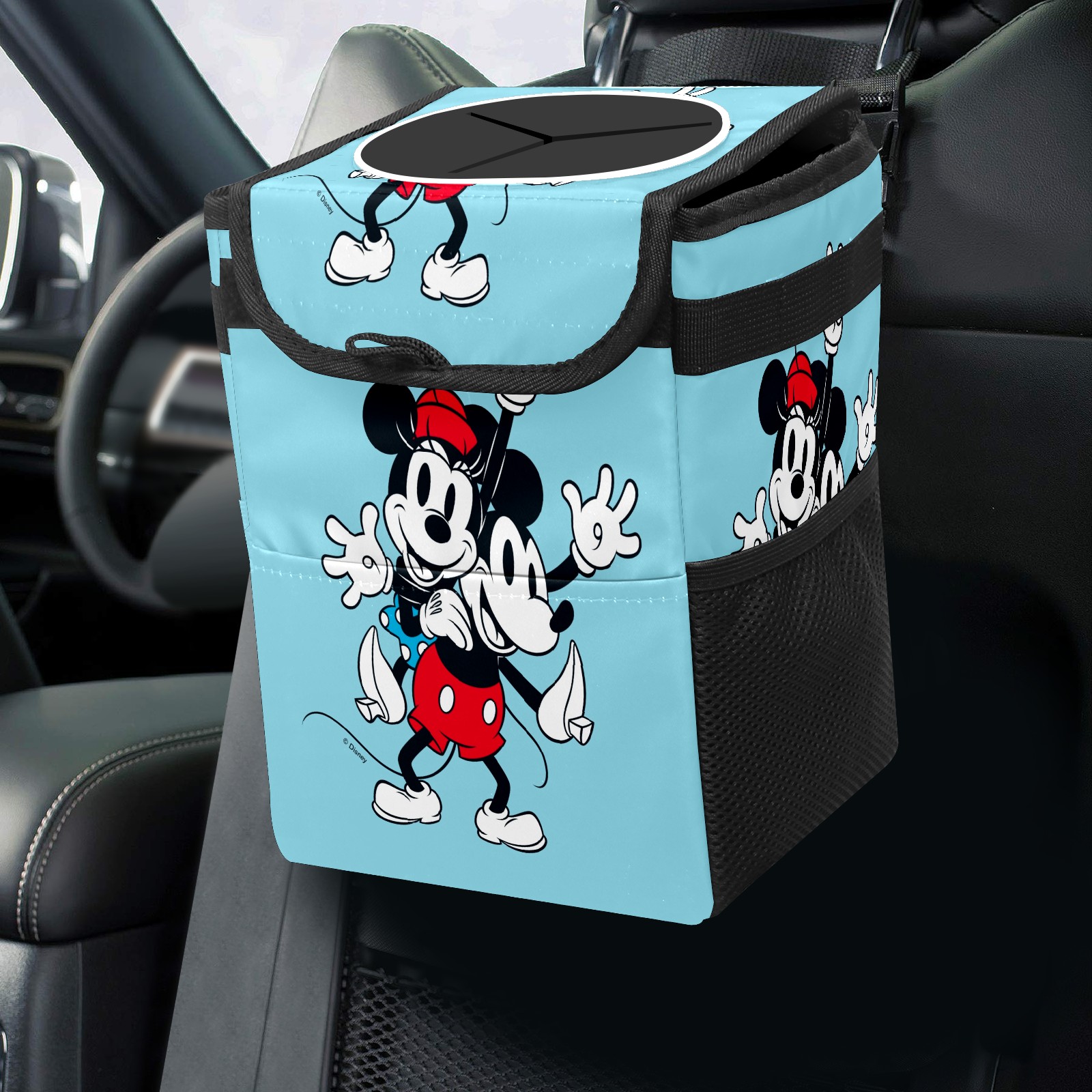 Car Trash Can with Lid, Small Portable Hanging Automotive Garbage Bin for Vehicles, Leakproof Waste Bag Container for SUV Truck Van Interior Auto Travel Road Trips(Blue Minnie Mickey Mouse Pattern)
