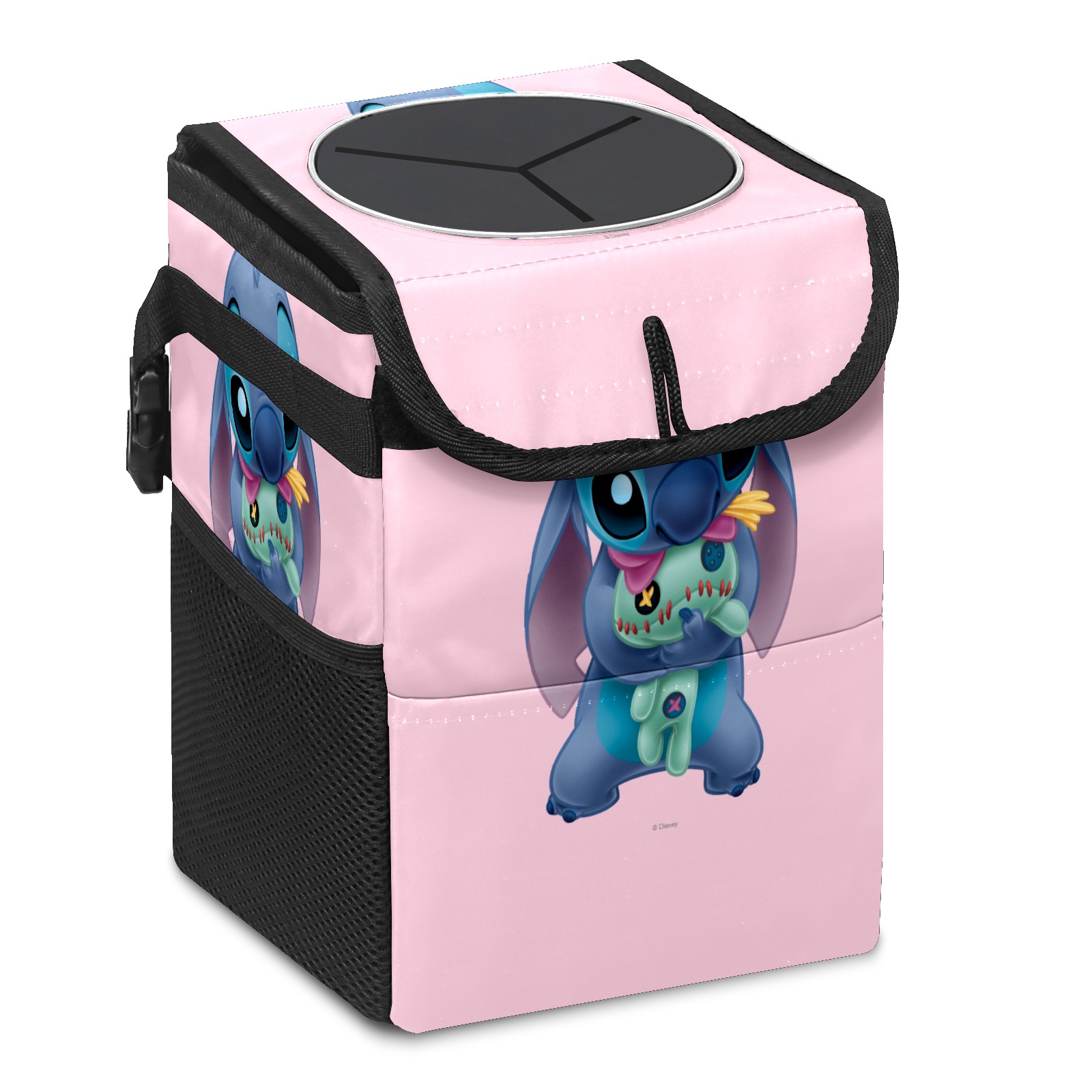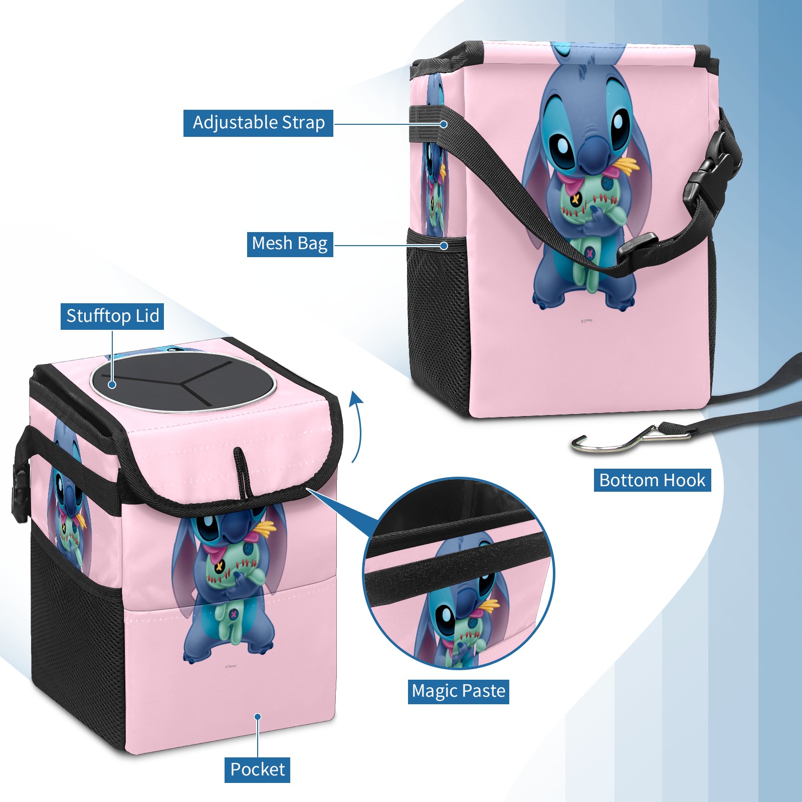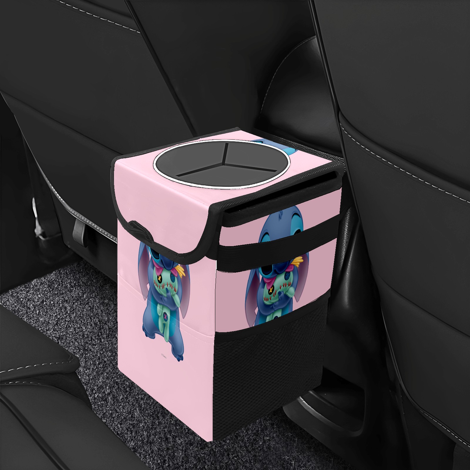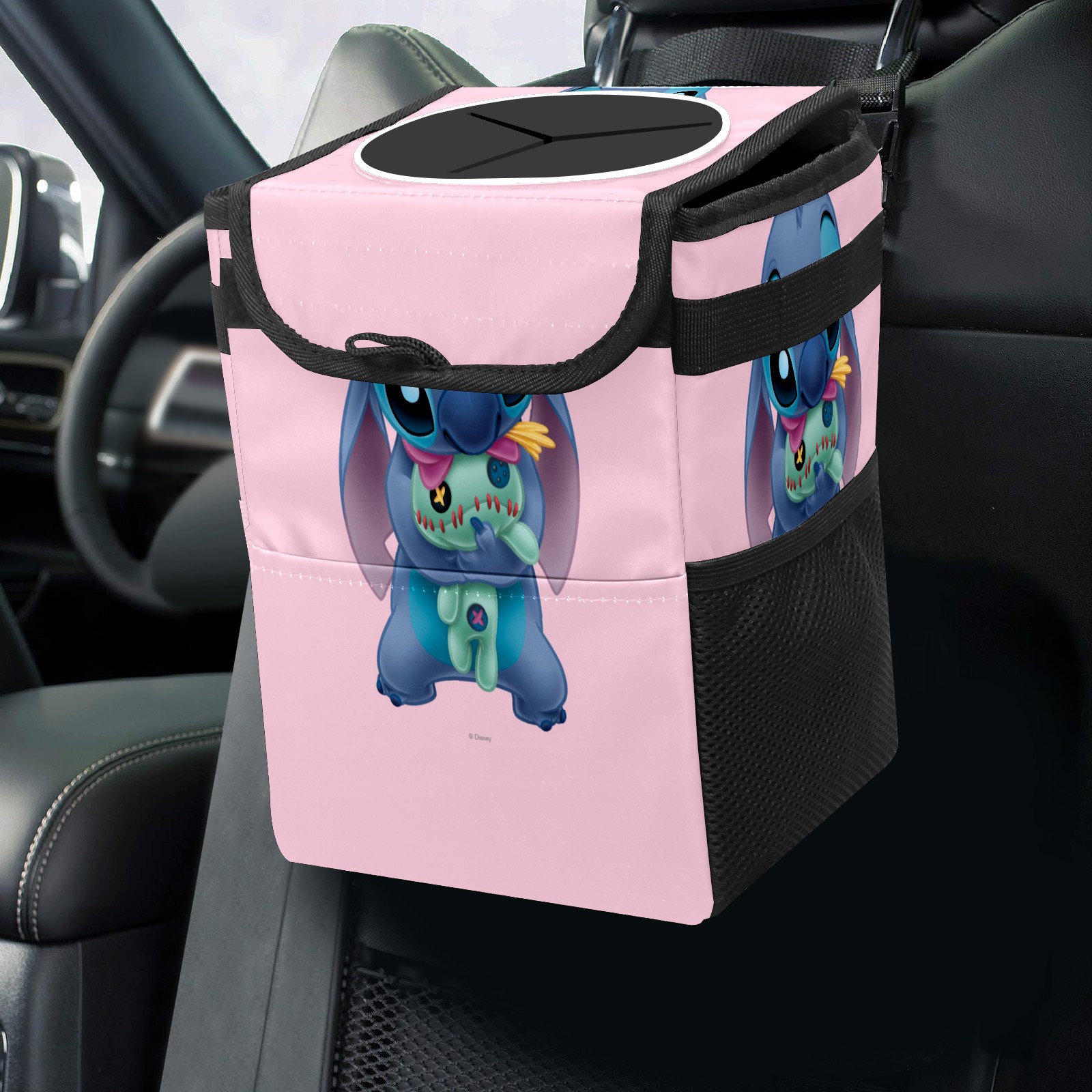 Car Trash Can with Lid, Small Portable Hanging Automotive Garbage Bin for Vehicles, Leakproof Waste Bag Container for SUV Truck Van Interior Auto Travel Road Trips(Lilo Stich Stitch With Ugly Doll Pink)