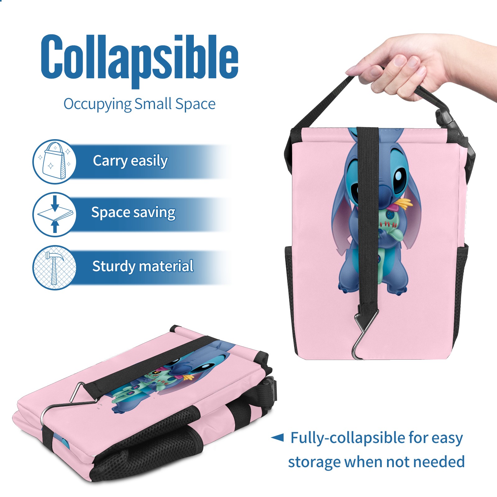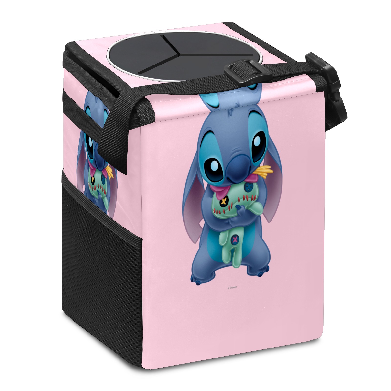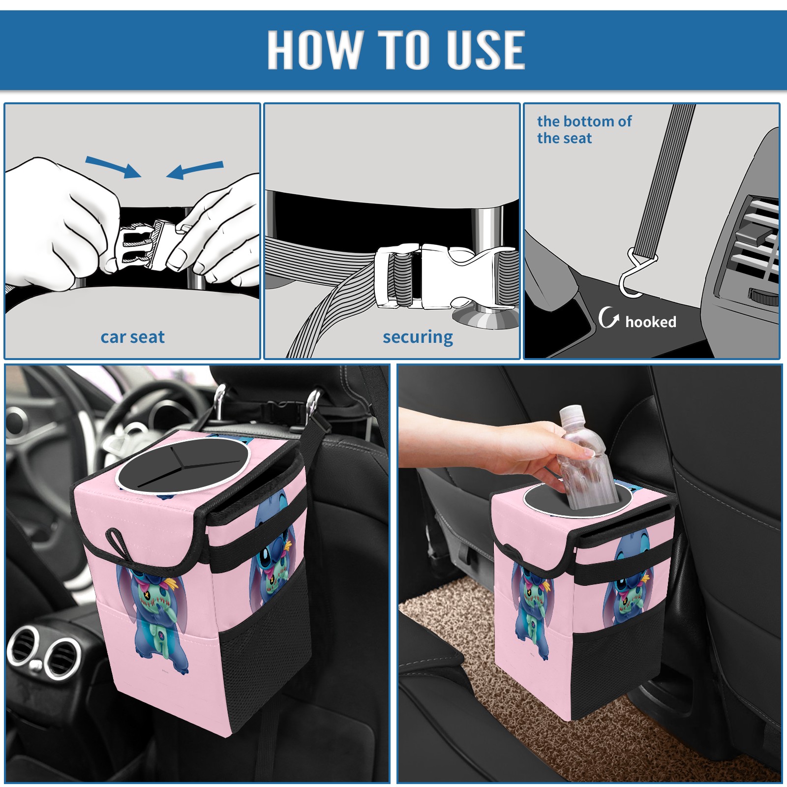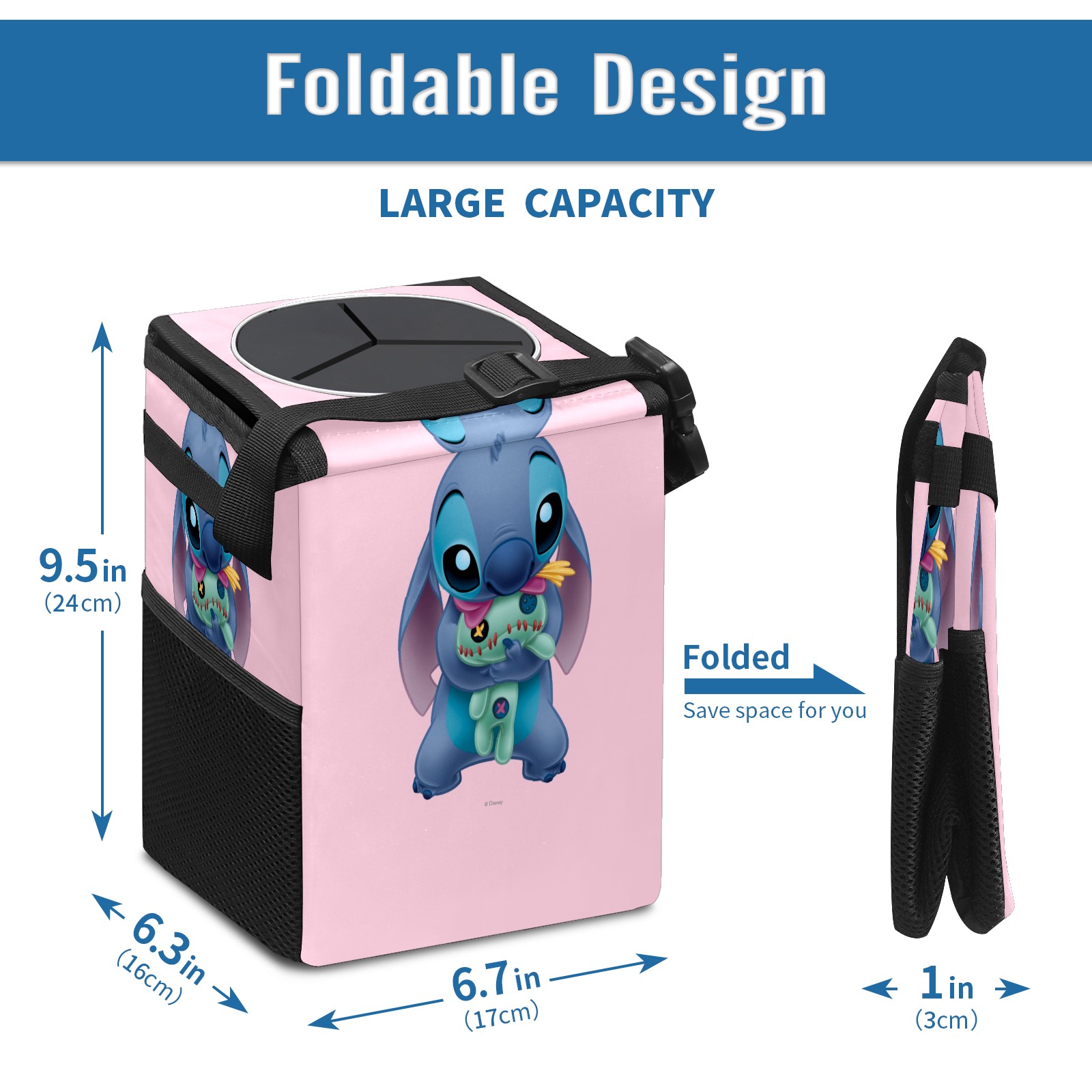 Car Trash Can with Lid, Small Portable Hanging Automotive Garbage Bin for Vehicles, Leakproof Waste Bag Container for SUV Truck Van Interior Auto Travel Road Trips(Lilo Stich Stitch With Ugly Doll Pink)