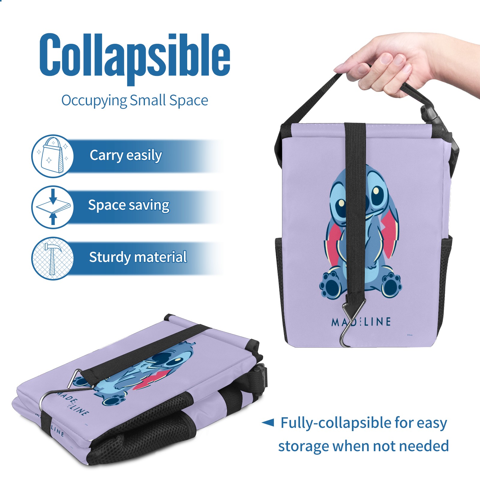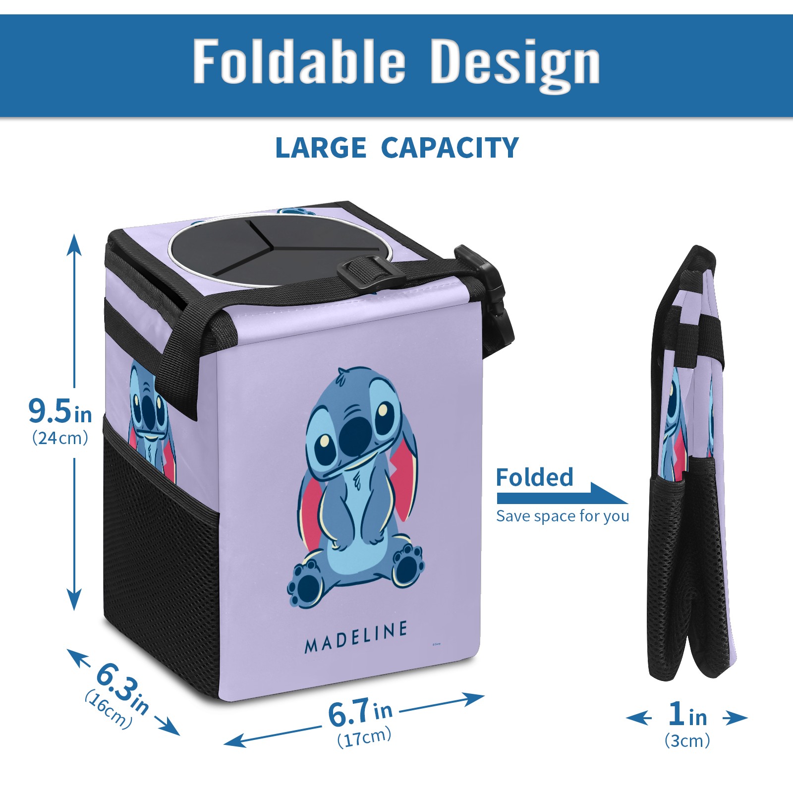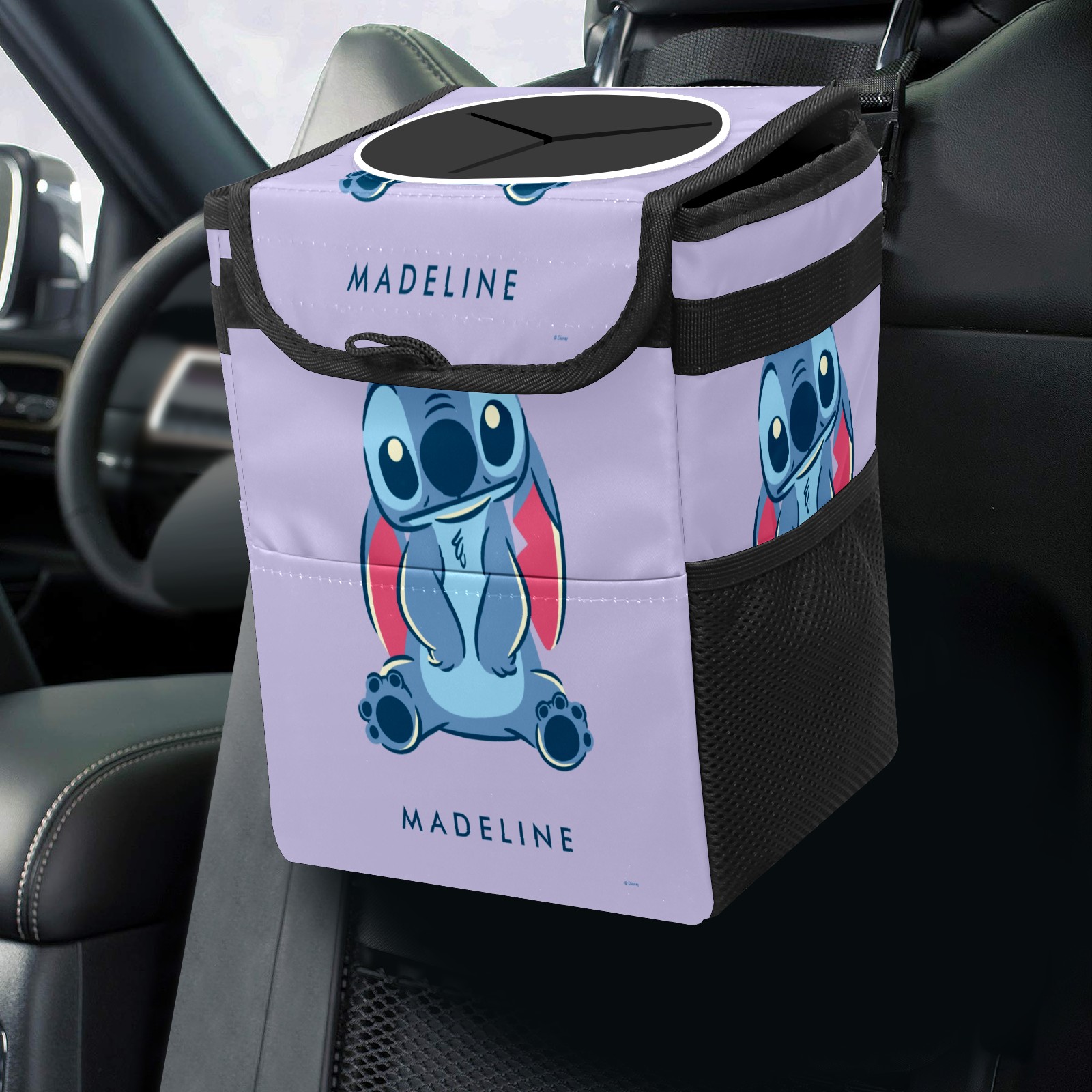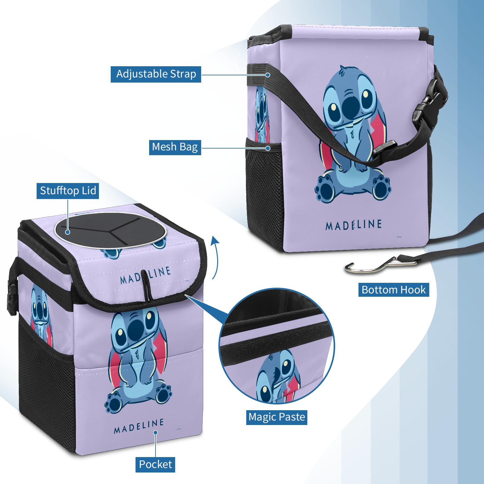 Car Trash Can with Lid, Small Portable Hanging Automotive Garbage Bin for Vehicles, Leakproof Waste Bag Container for SUV Truck Van Interior Auto Travel Road Trips(Lilo Stich Stitch Purple Background)