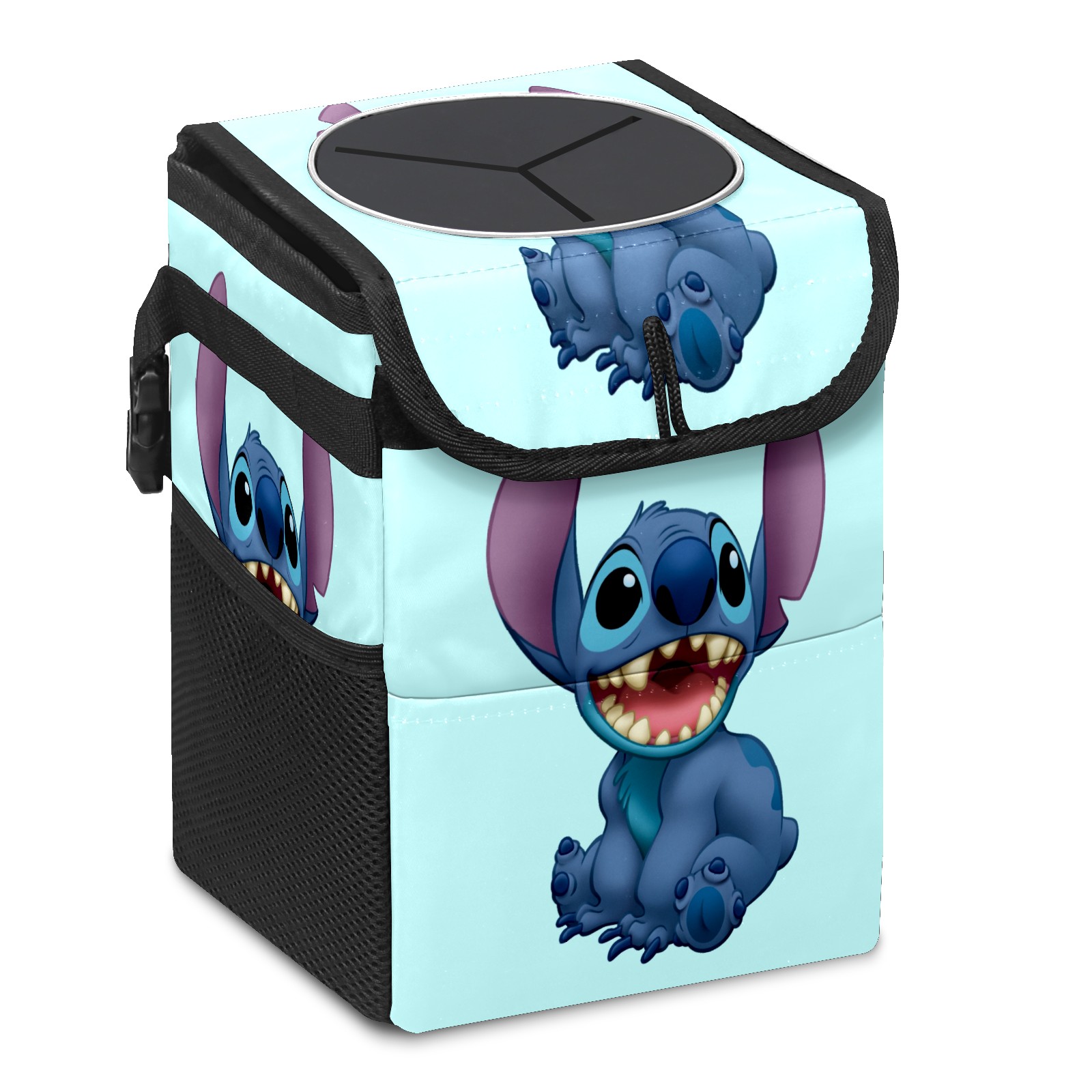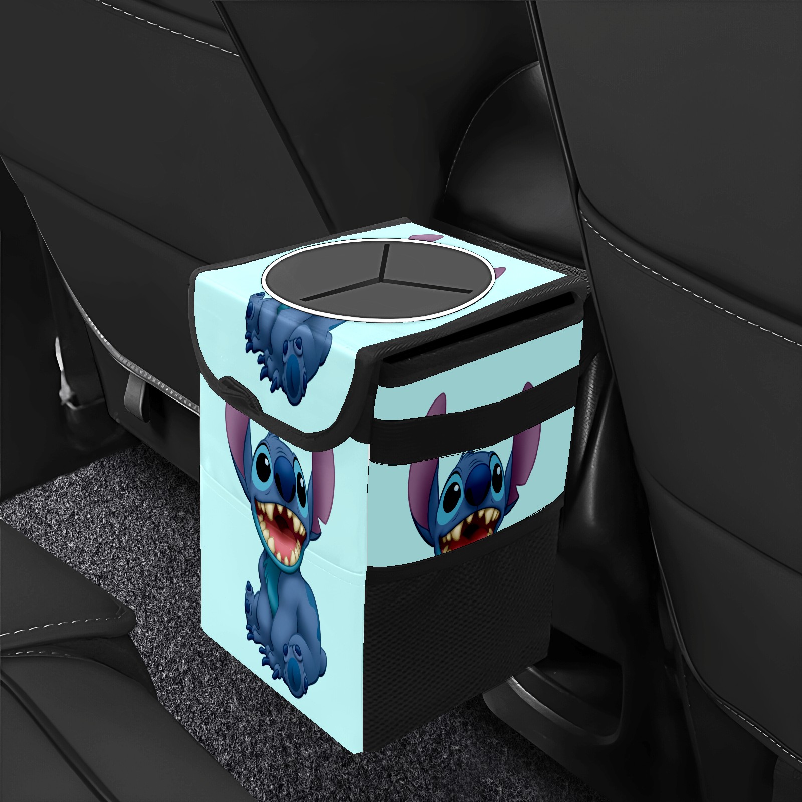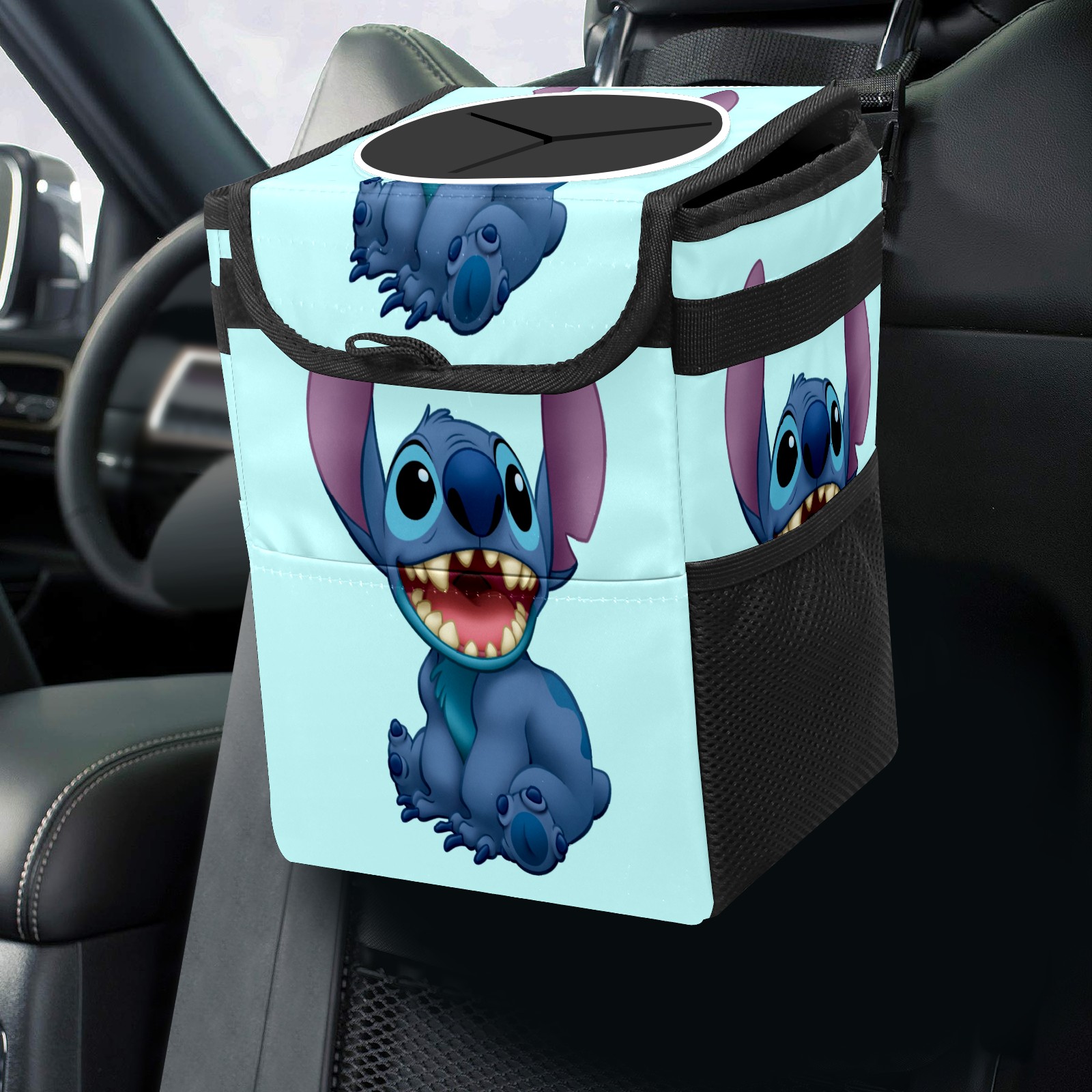 Car Trash Can with Lid, Small Portable Hanging Automotive Garbage Bin for Vehicles, Leakproof Waste Bag Container for SUV Truck Van Interior Auto Travel Road Trips(Lilo Stitch)