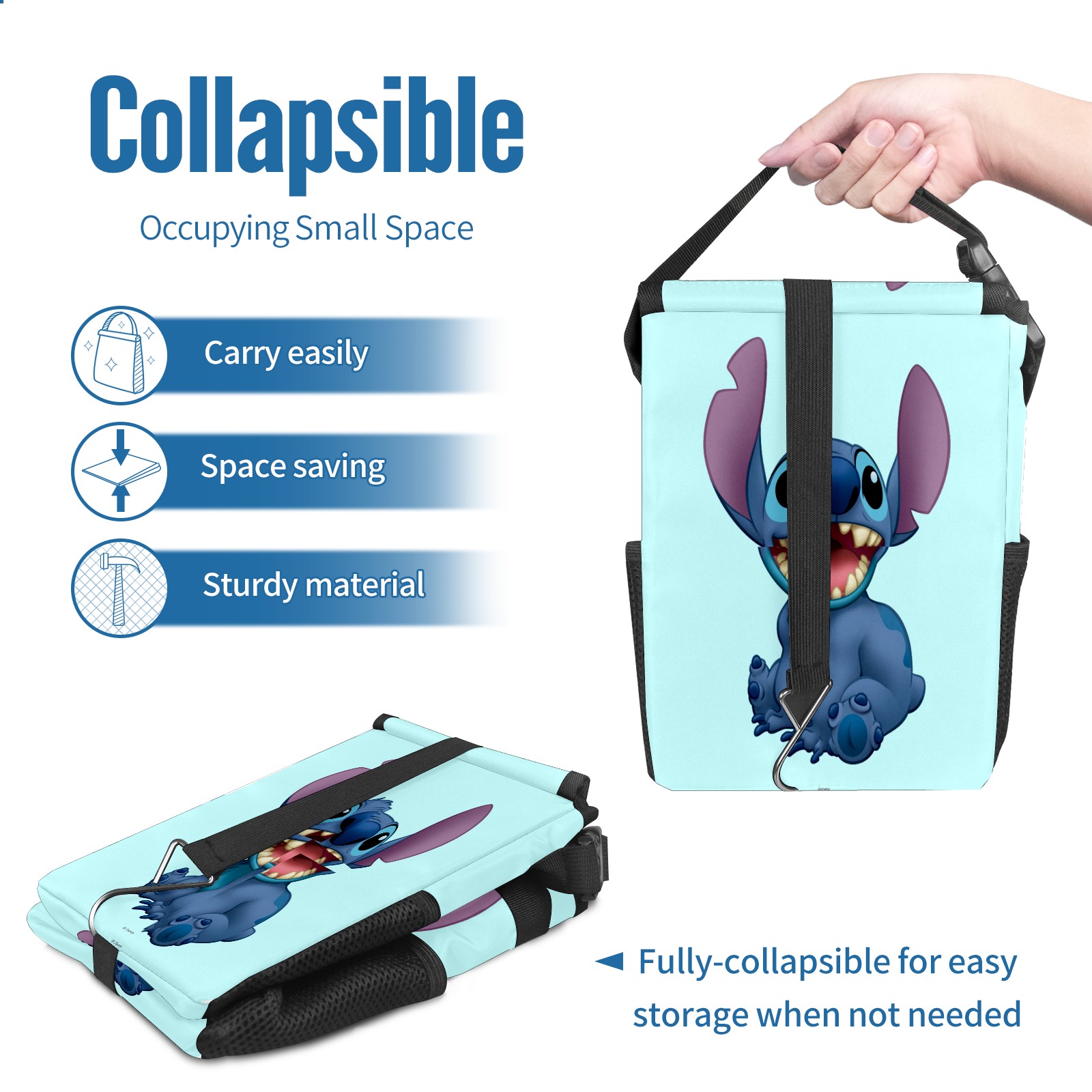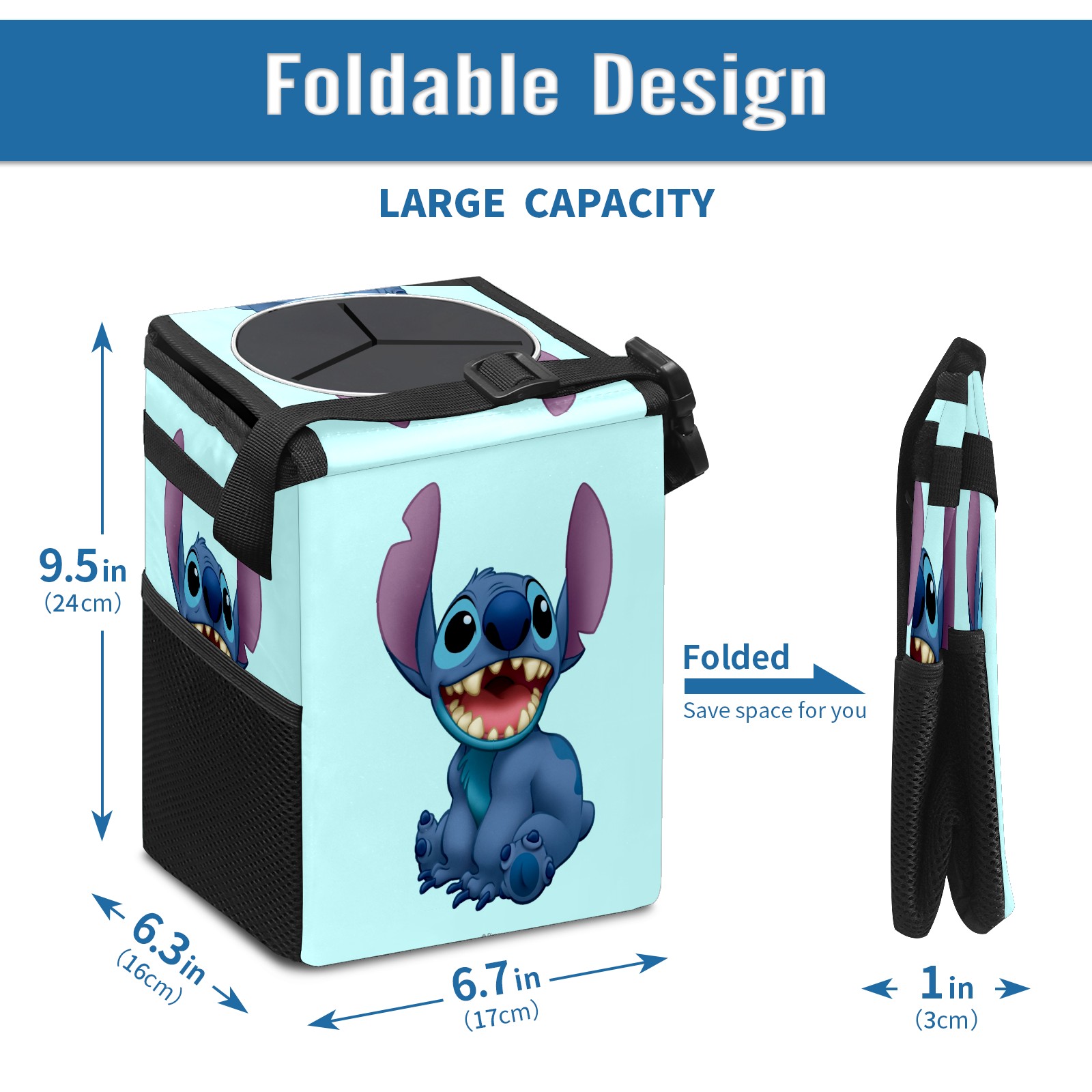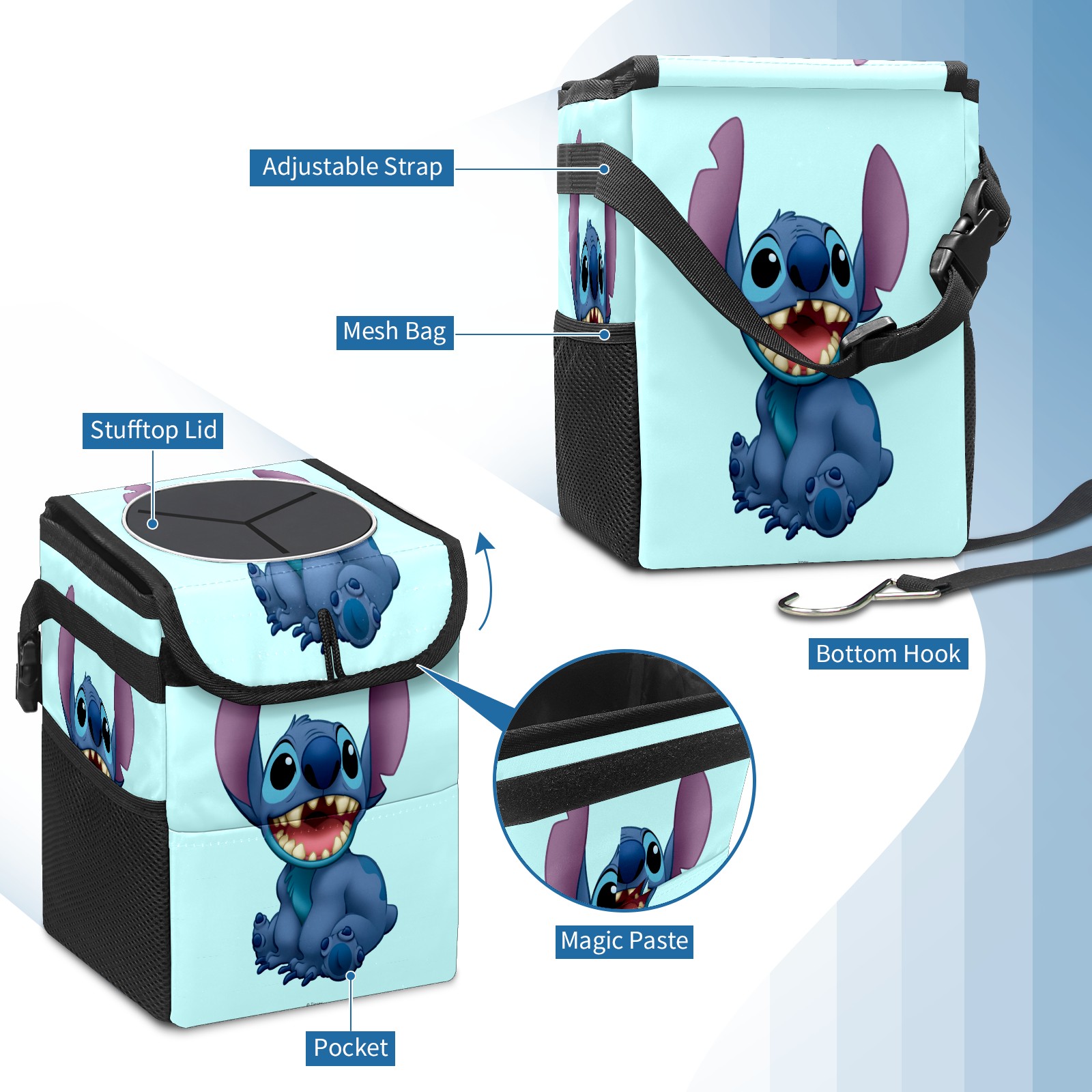 Car Trash Can with Lid, Small Portable Hanging Automotive Garbage Bin for Vehicles, Leakproof Waste Bag Container for SUV Truck Van Interior Auto Travel Road Trips(Lilo Stitch)