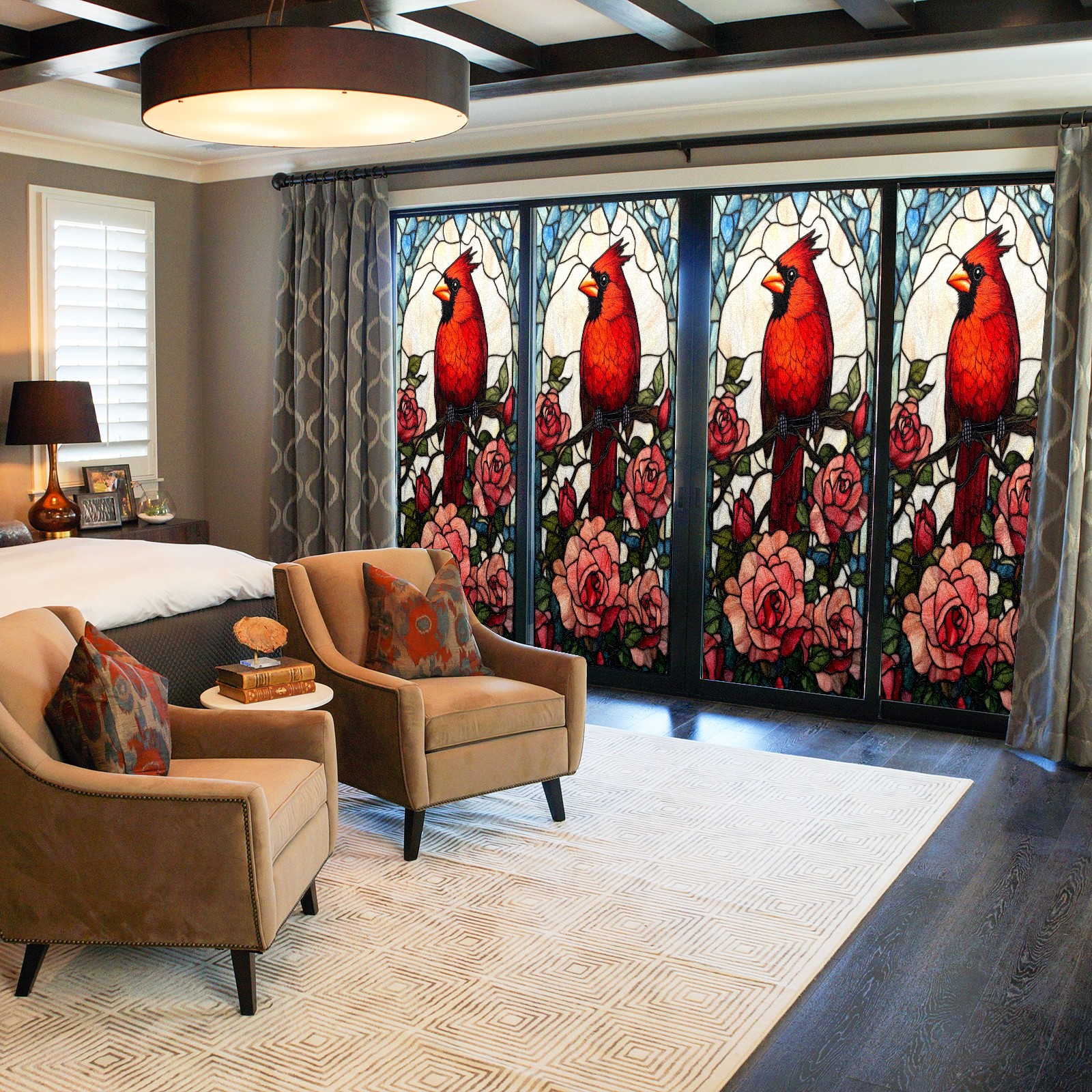 Фильм для окон приватный, матовый, под цветное стекло, декоративный статически клеящийся, для ванной и домашнего офиса, Tulip Red Cardinal Bird