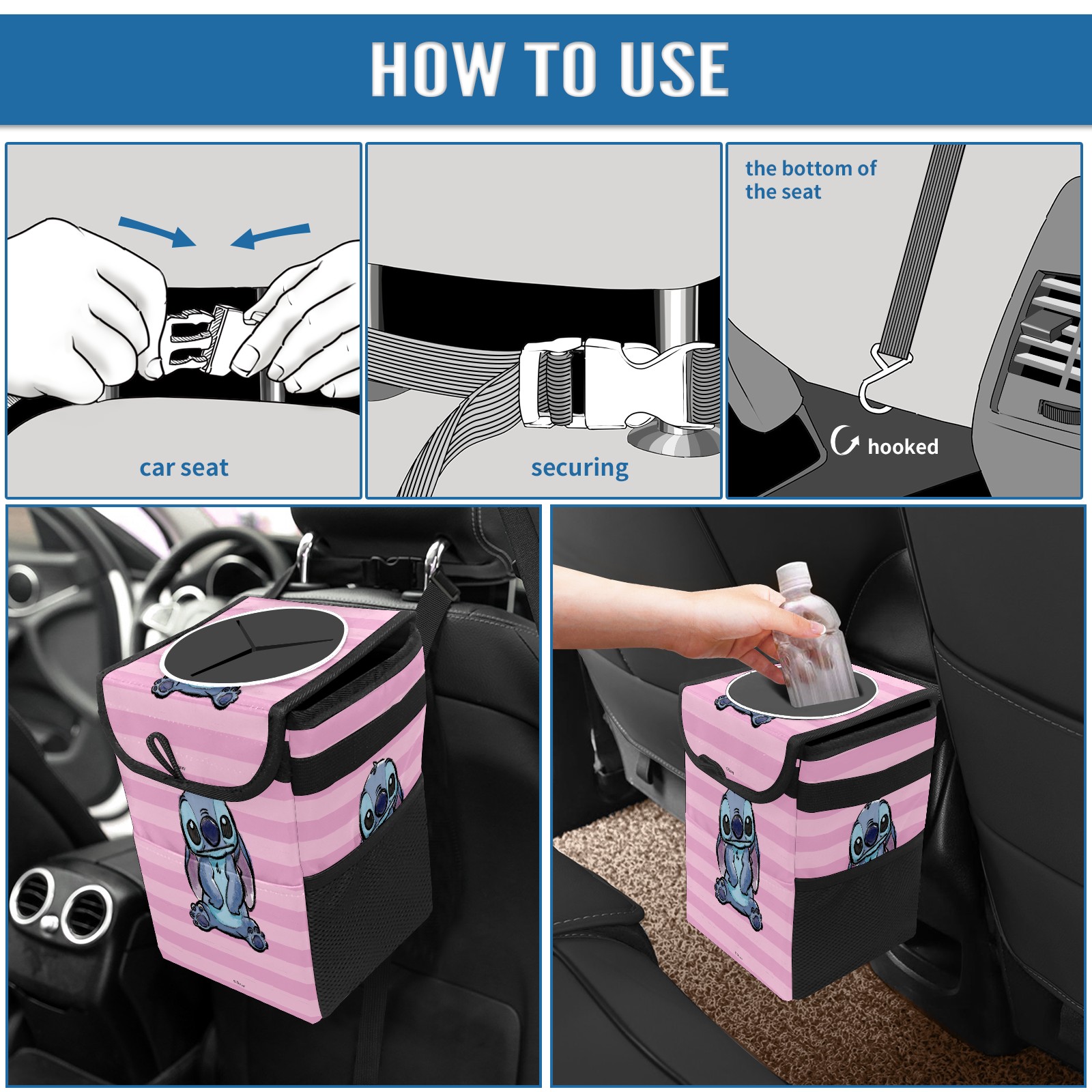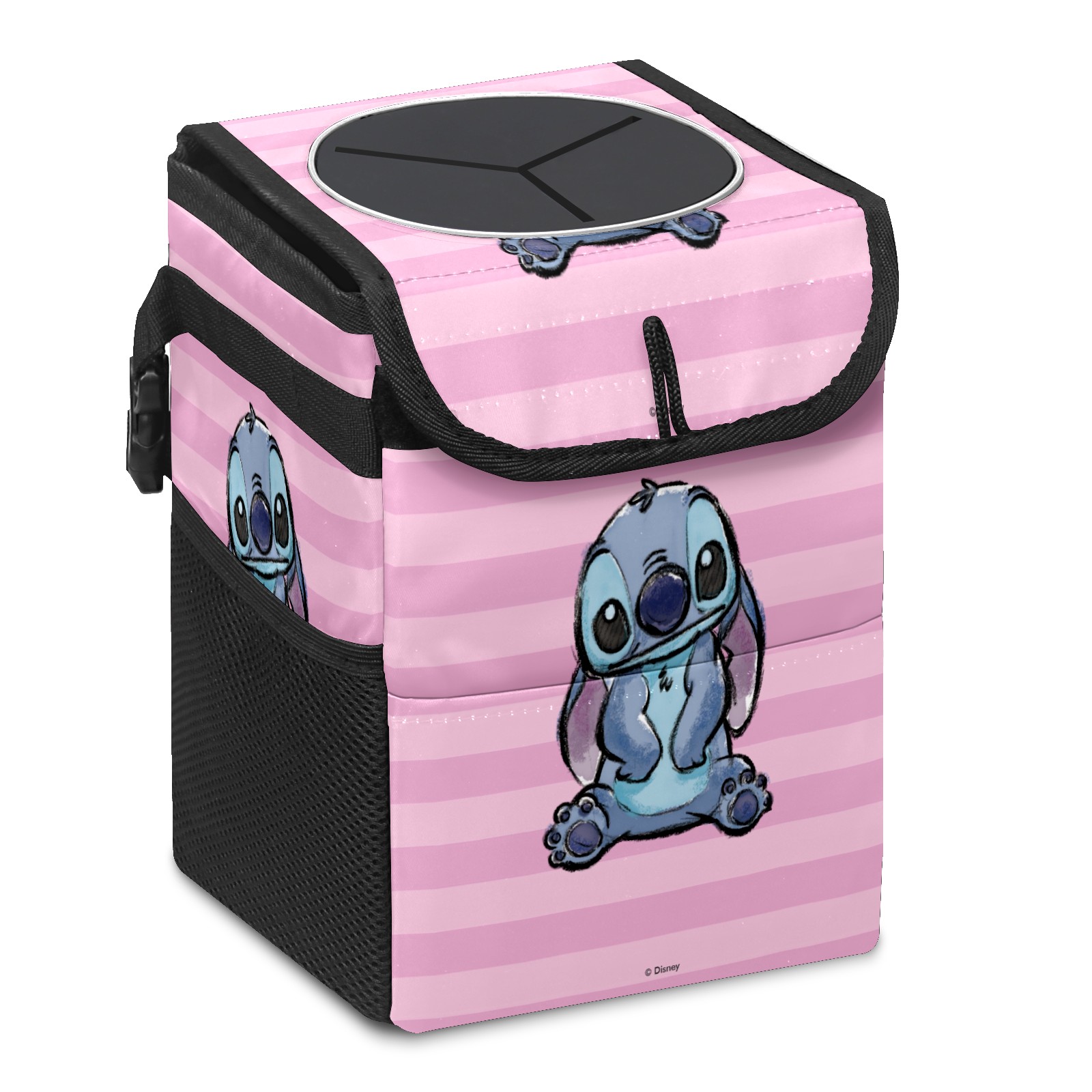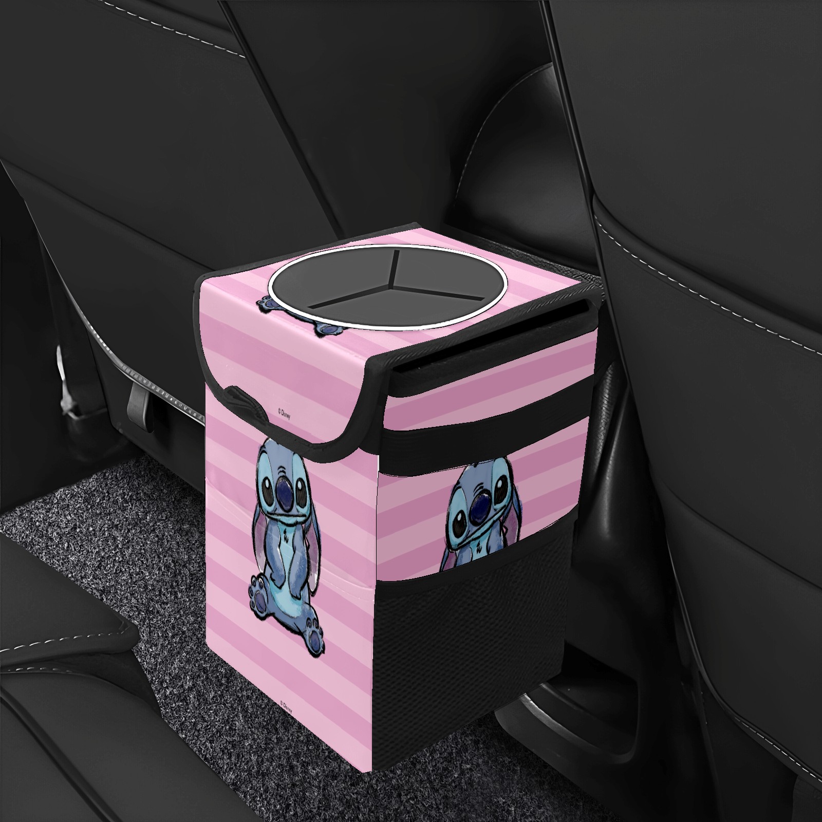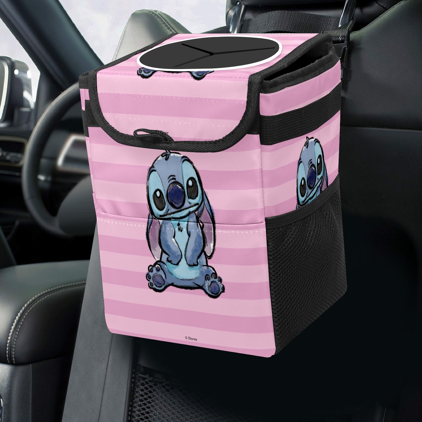 Car Trash Can with Lid, Small Portable Hanging Automotive Garbage Bin for Vehicles, Leakproof Waste Bag Container for SUV Truck Van Interior Auto Travel Road Trips(Pink Lilo Stitch Stitch Sketch)