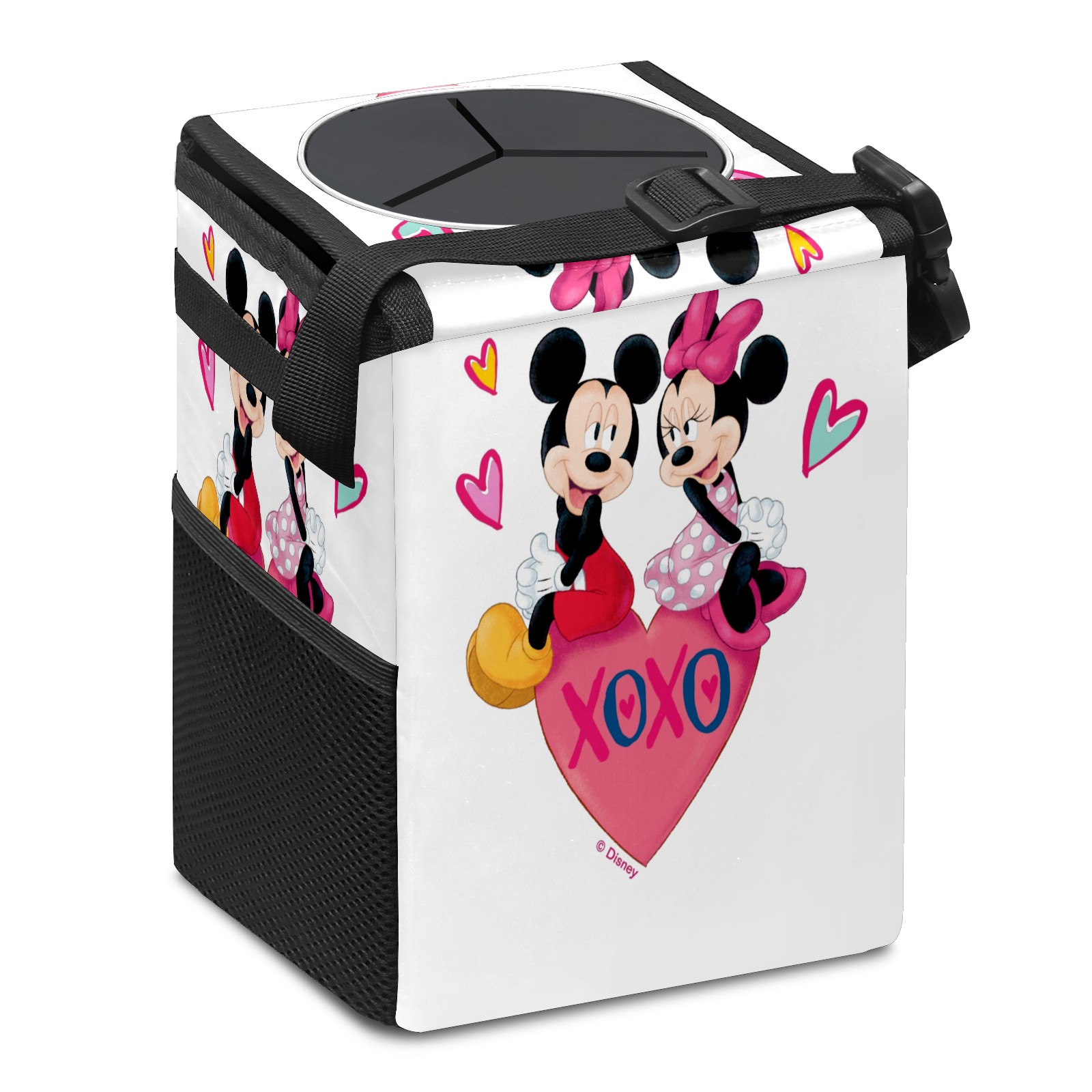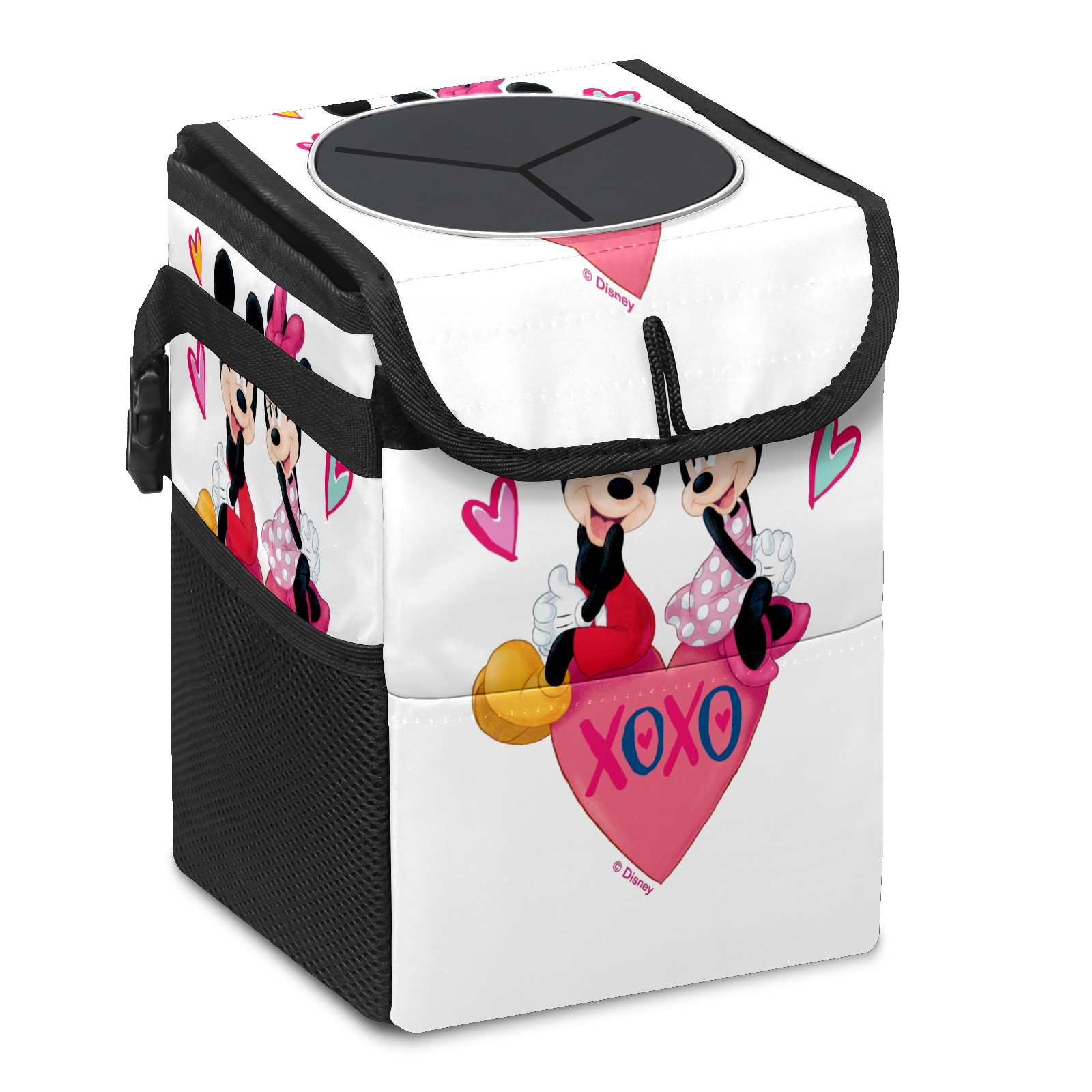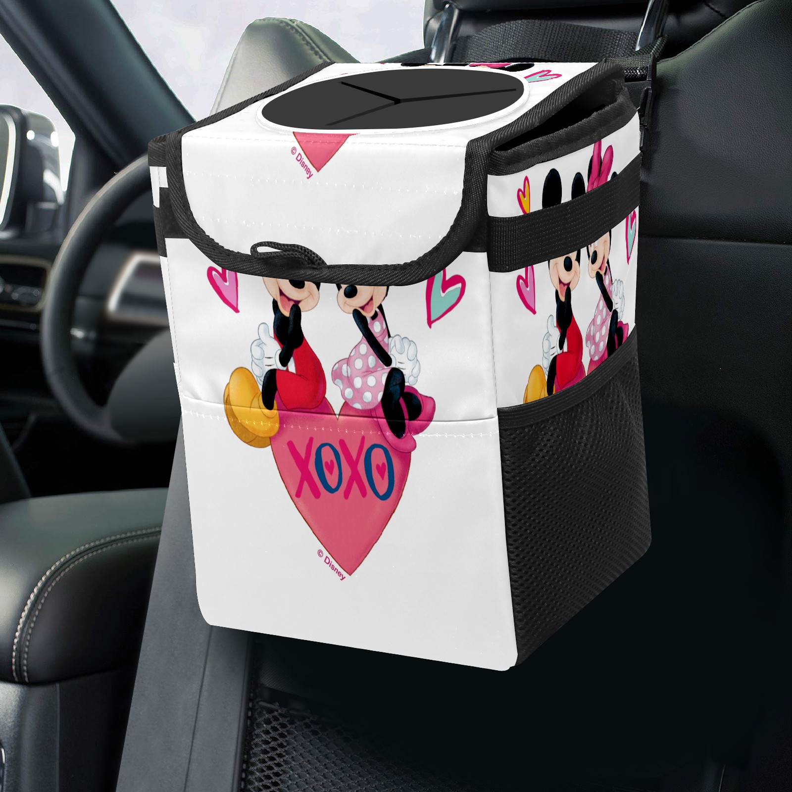 Car Trash Can with Lid, Small Portable Hanging Automotive Garbage Bin for Vehicles, Leakproof Waste Bag Container for SUV Truck Van Interior Auto Travel Road Trips(Mickey Minnie Valentine's Day)