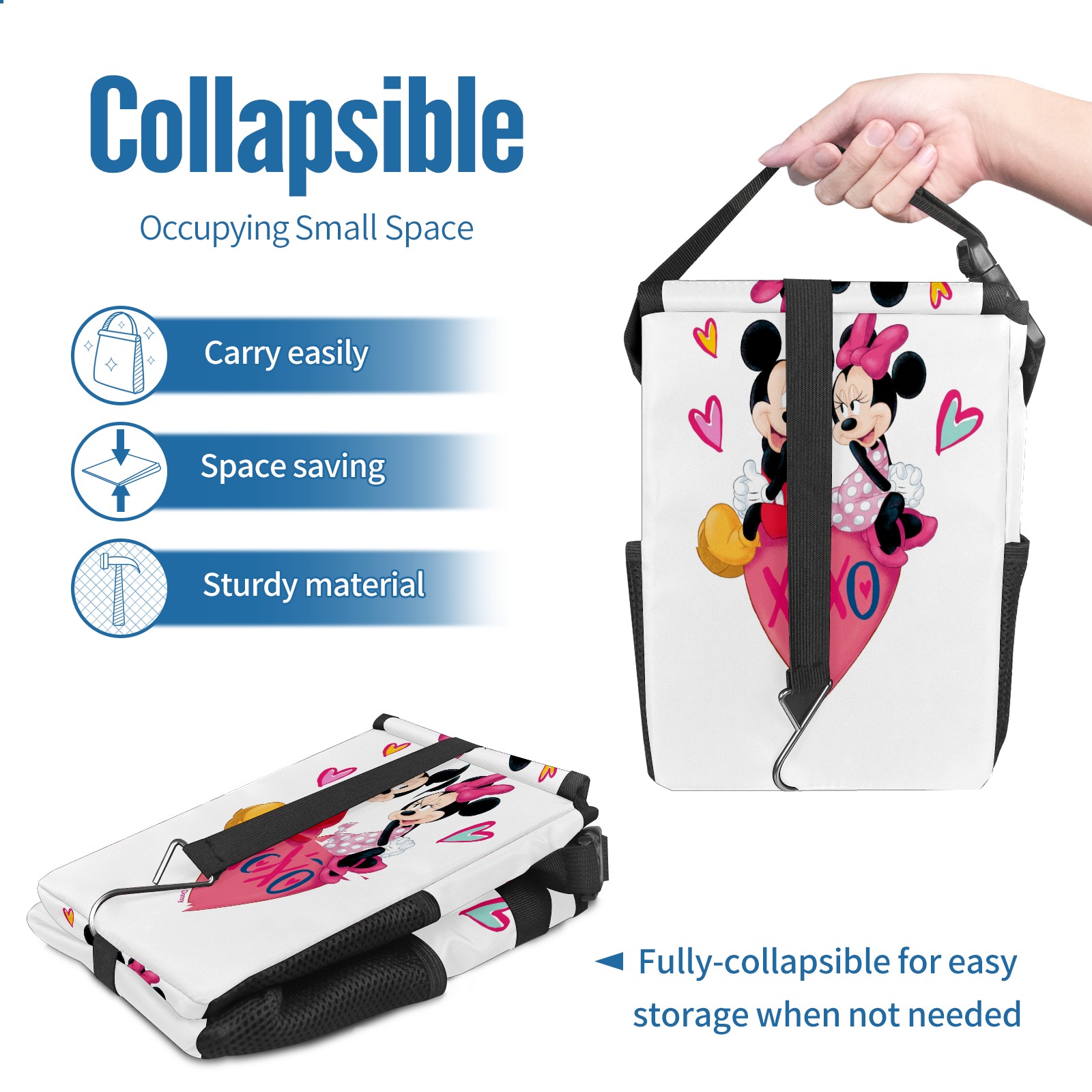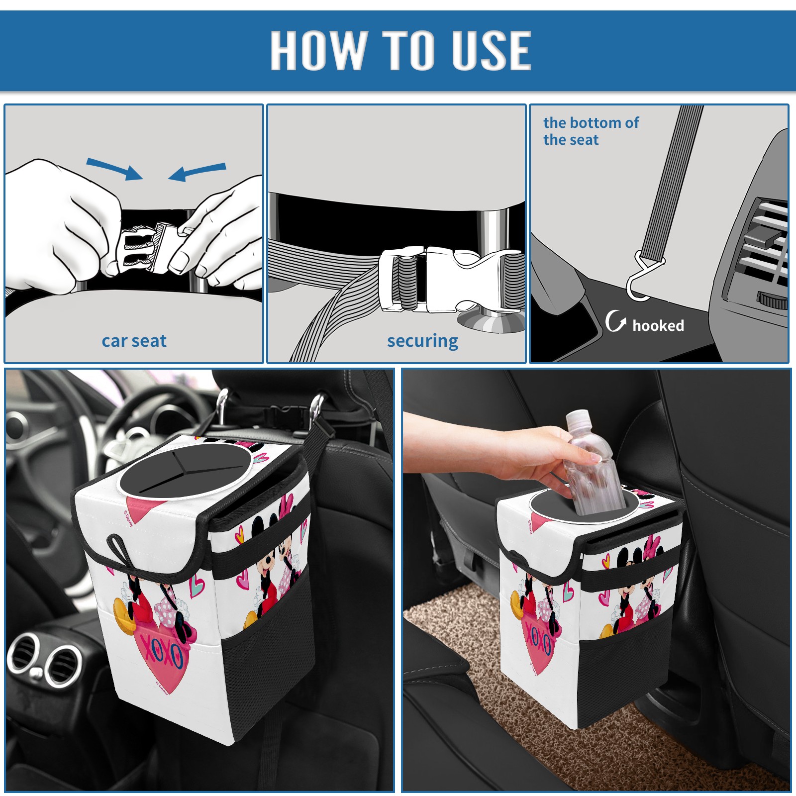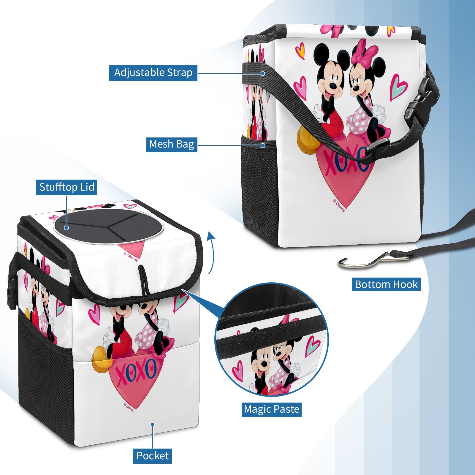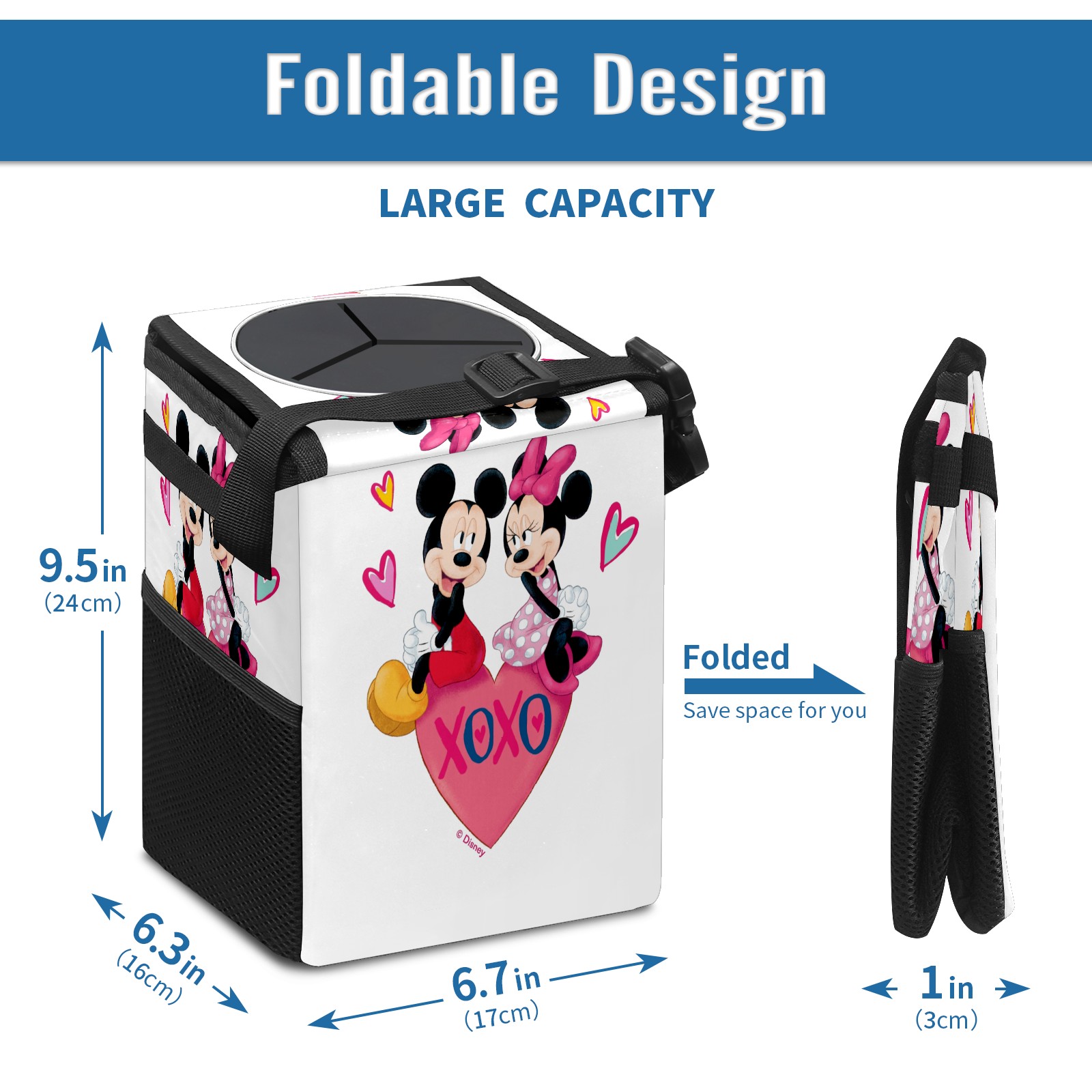 Car Trash Can with Lid, Small Portable Hanging Automotive Garbage Bin for Vehicles, Leakproof Waste Bag Container for SUV Truck Van Interior Auto Travel Road Trips(Mickey Minnie Valentine's Day)