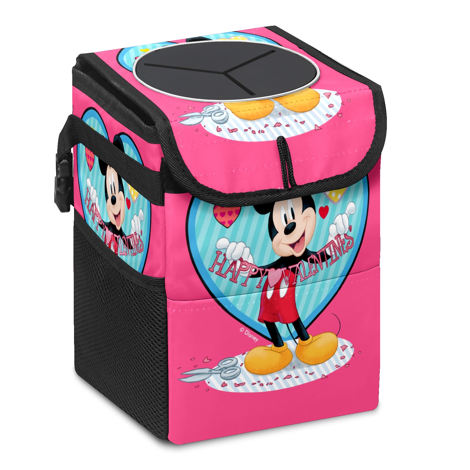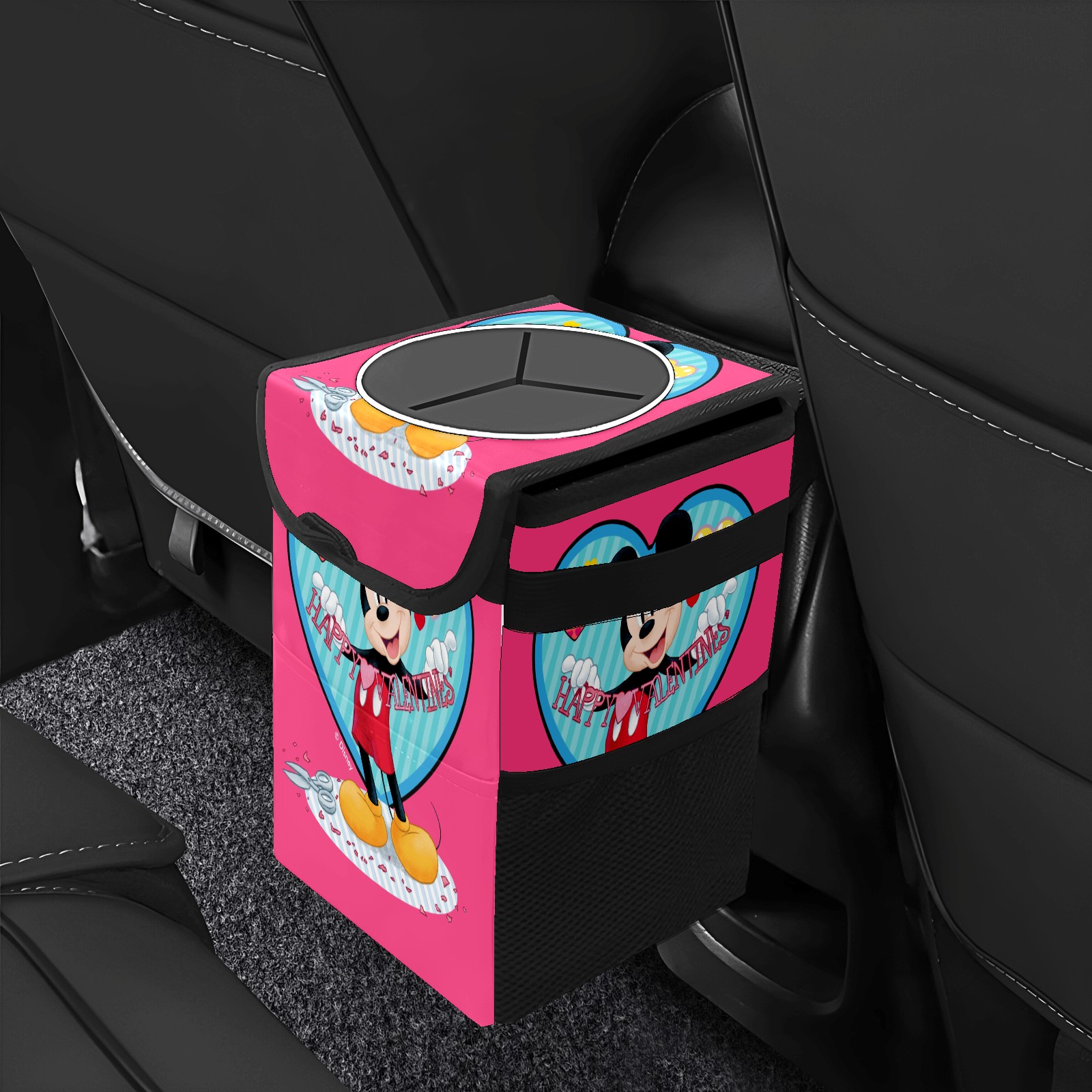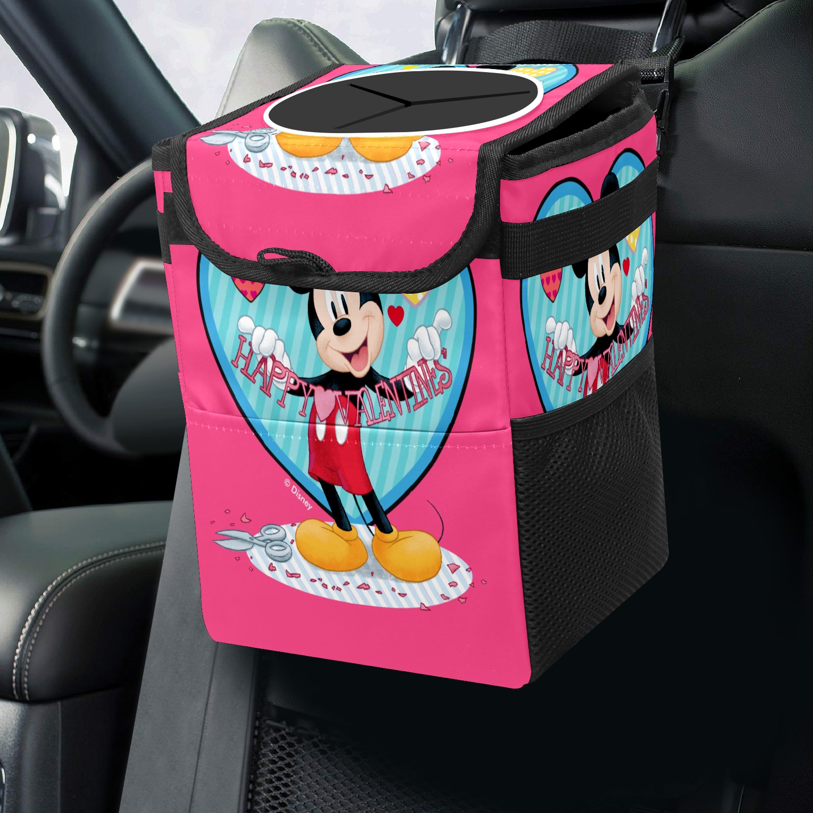 Car Trash Can with Lid, Small Portable Hanging Automotive Garbage Bin for Vehicles, Leakproof Waste Bag Container for SUV Truck Van Interior Auto Travel Road Trips(Mickey Mouse Happy Valentines Day Pink)