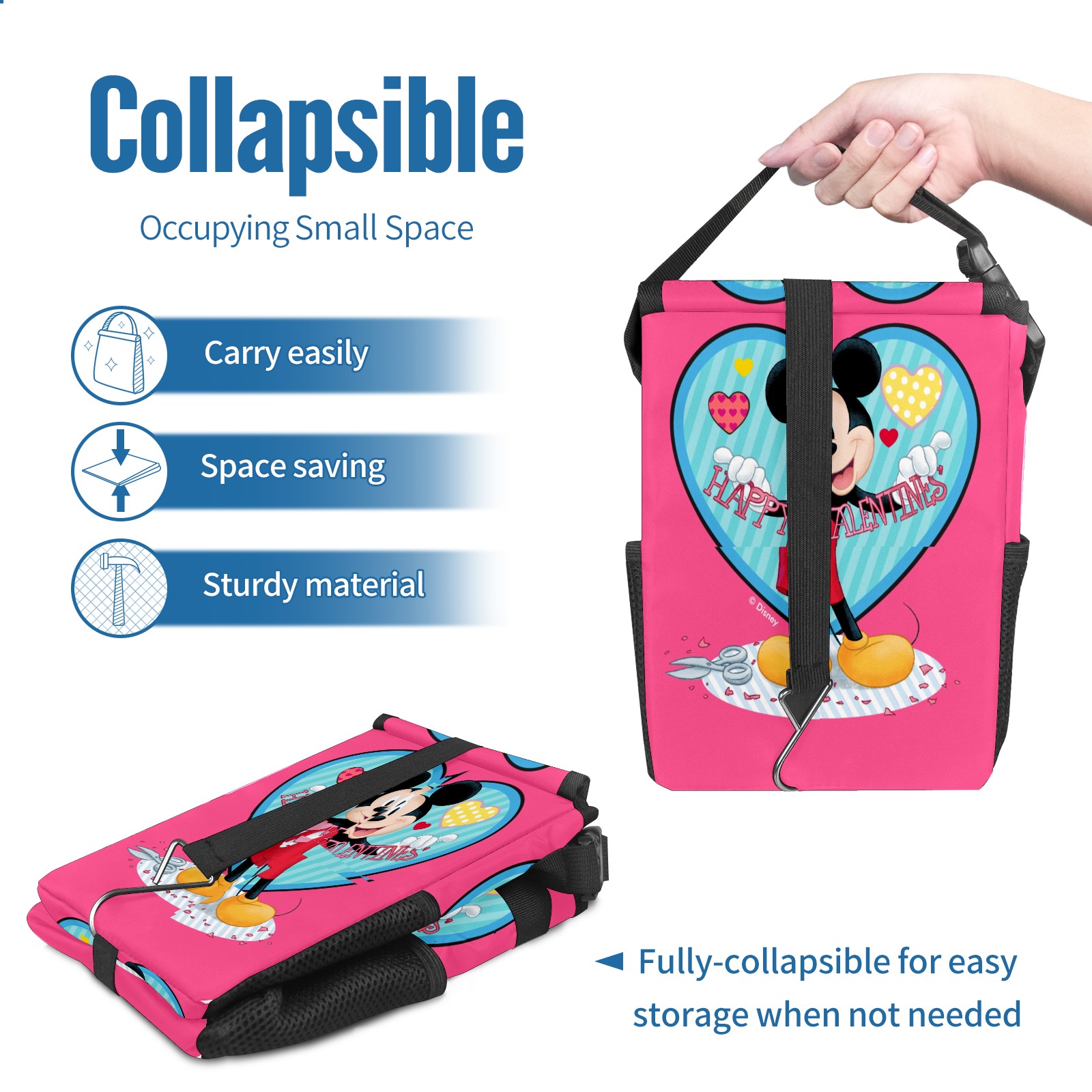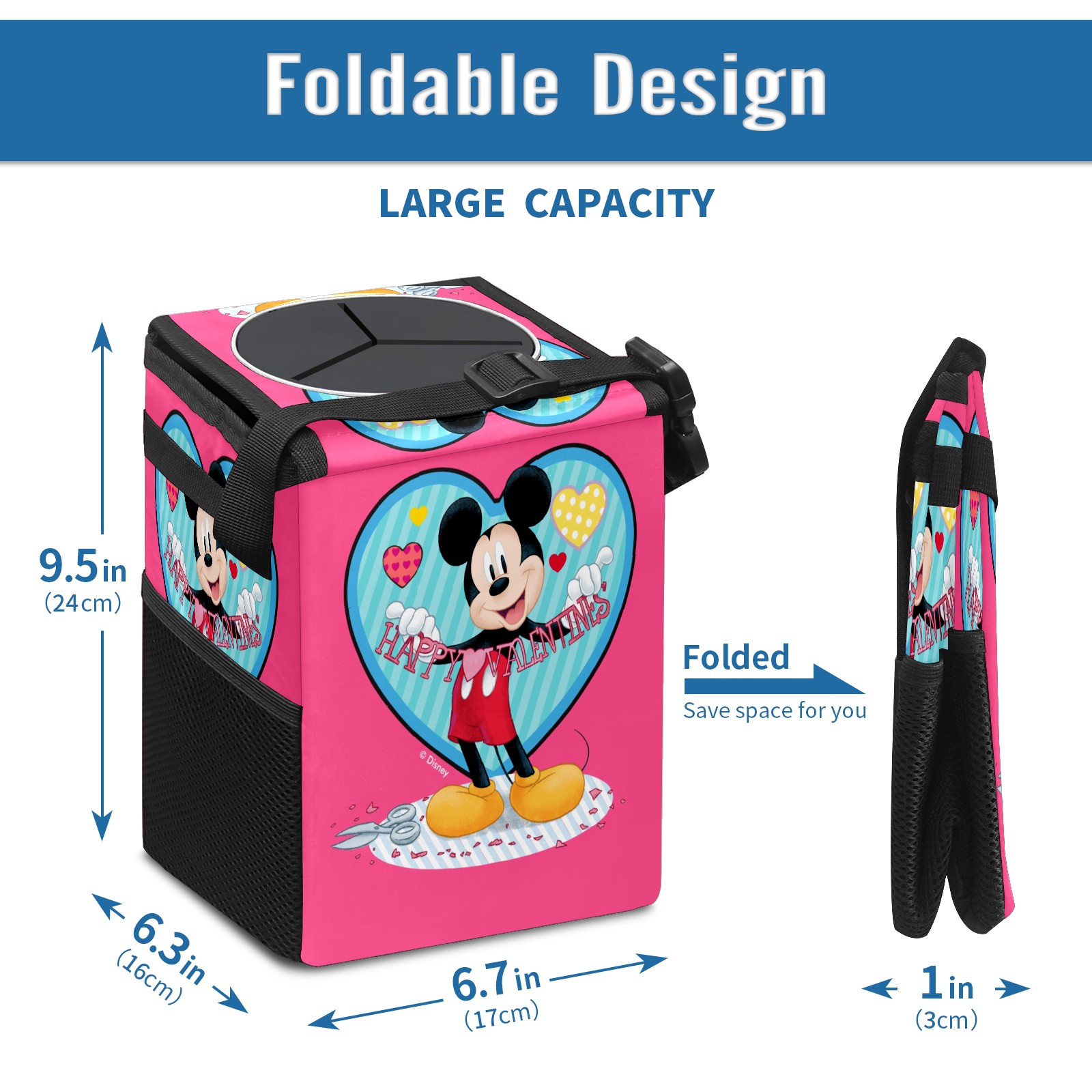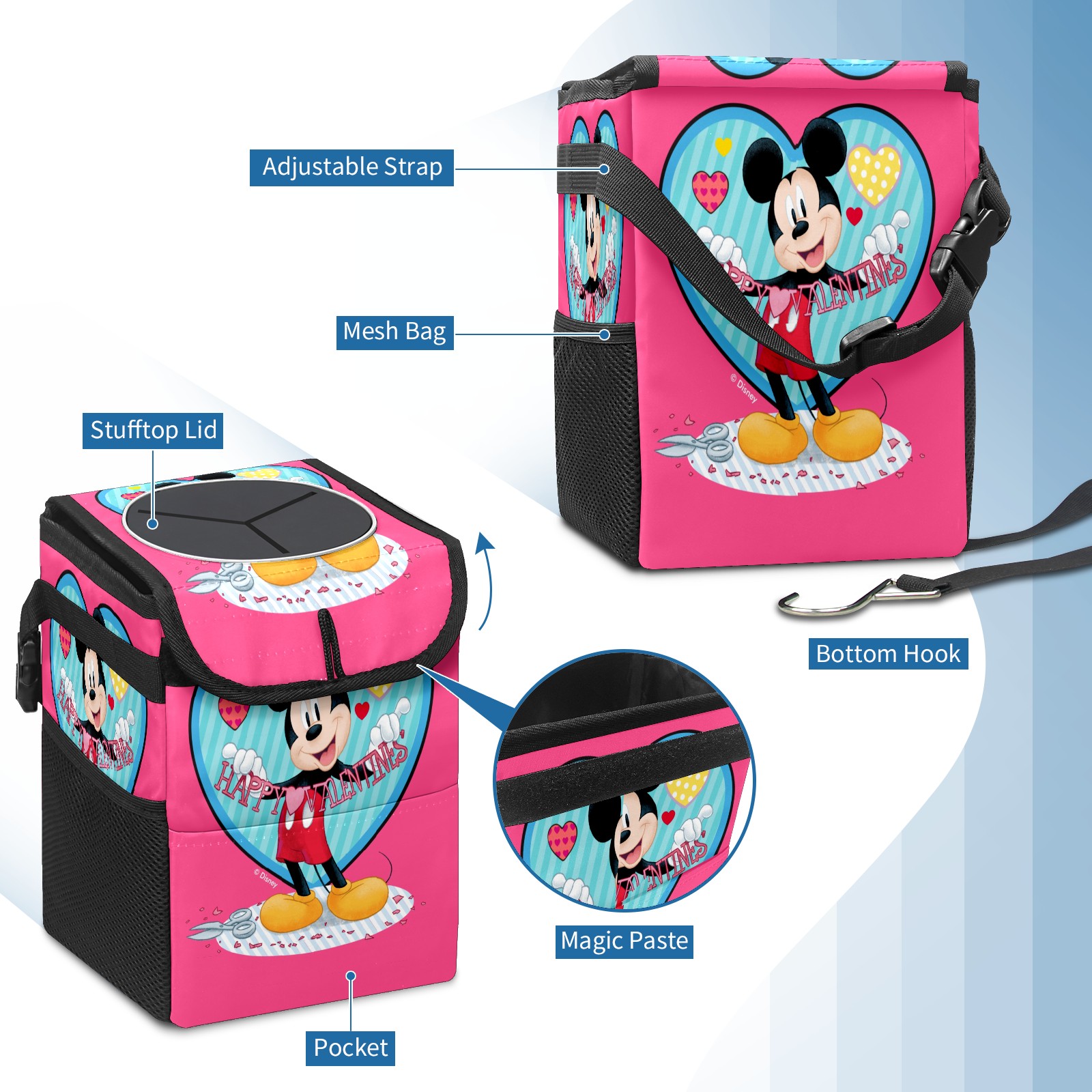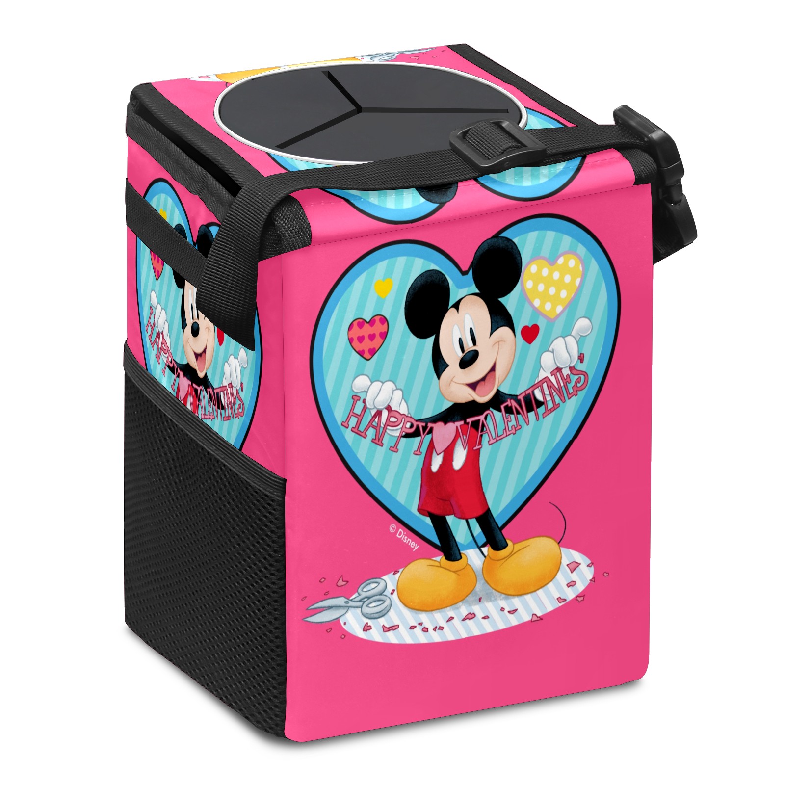 Car Trash Can with Lid, Small Portable Hanging Automotive Garbage Bin for Vehicles, Leakproof Waste Bag Container for SUV Truck Van Interior Auto Travel Road Trips(Mickey Mouse Happy Valentines Day Pink)