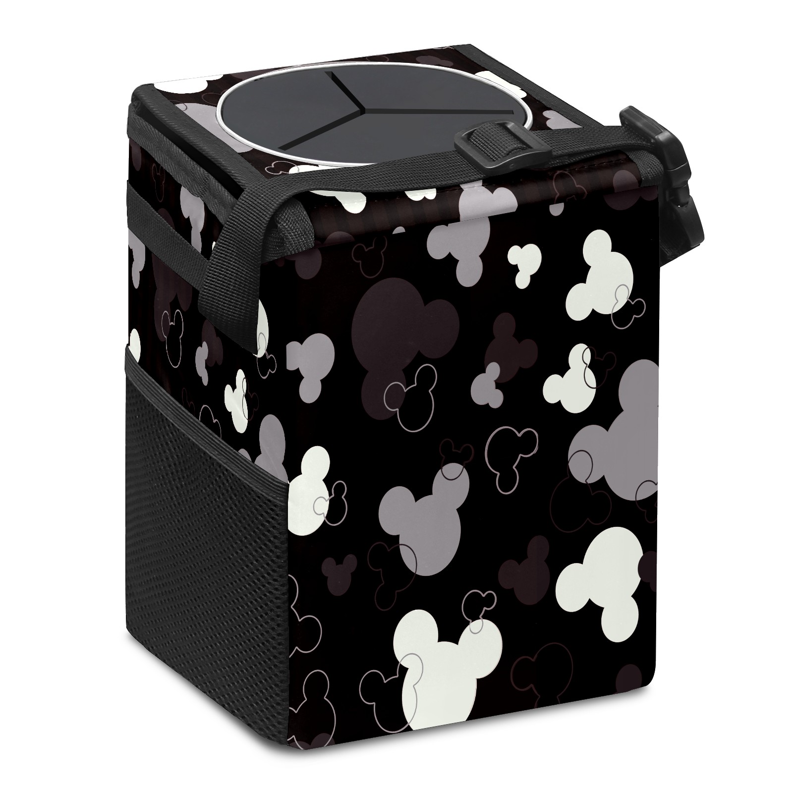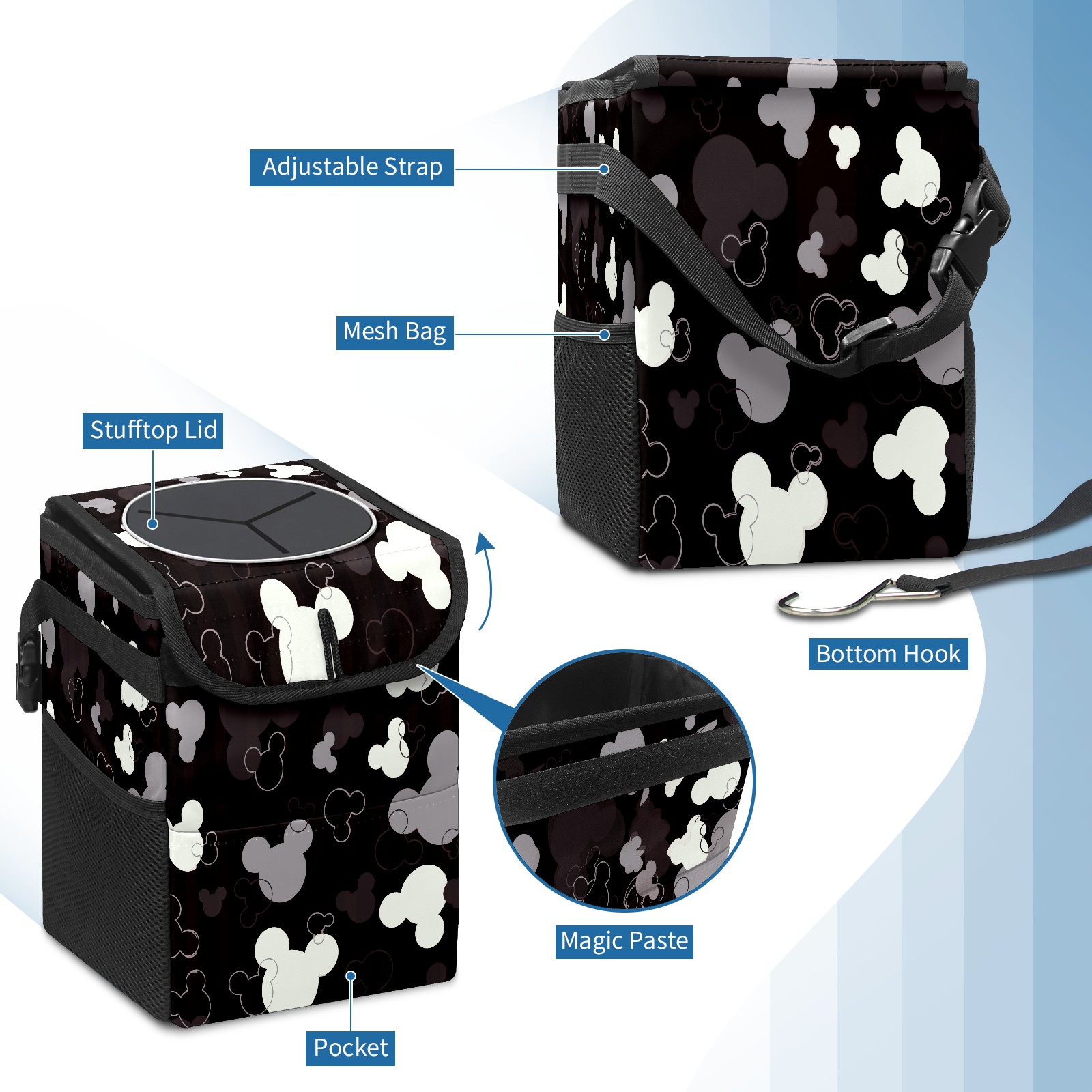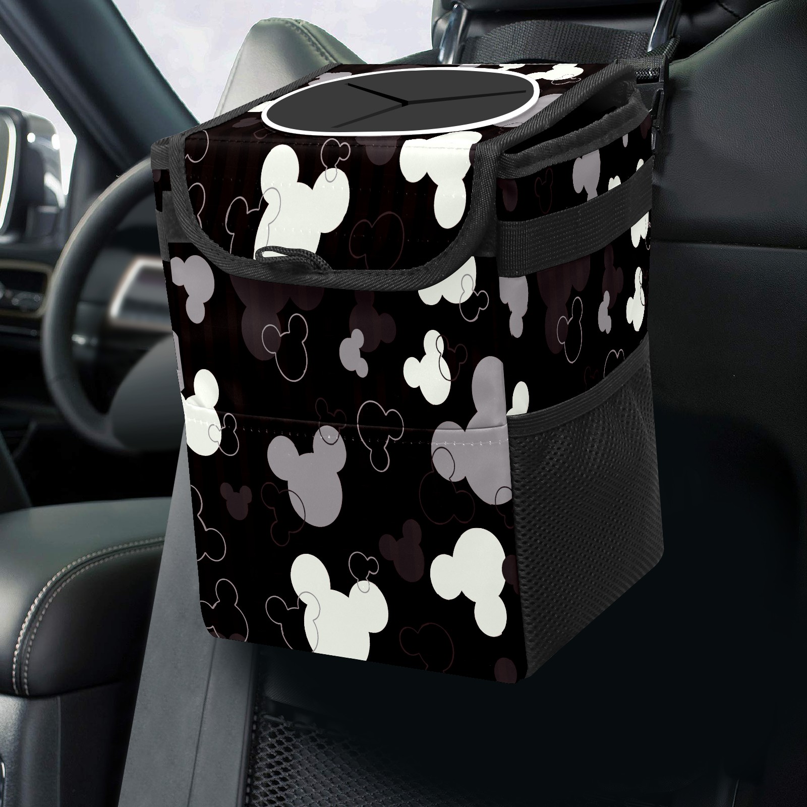 Car Trash Can with Lid, Small Portable Hanging Automotive Garbage Bin for Vehicles, Leakproof Waste Bag Container for SUV Truck Van Interior Auto Travel Road Trips(Grey White Mickey Mouse)