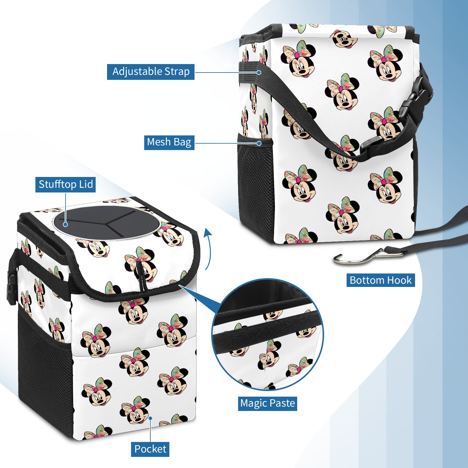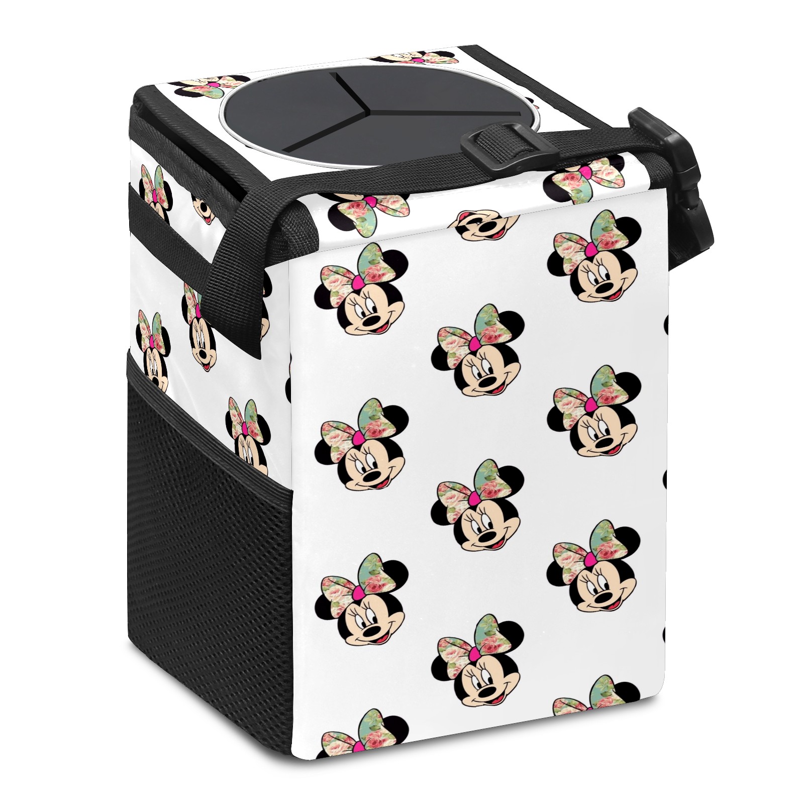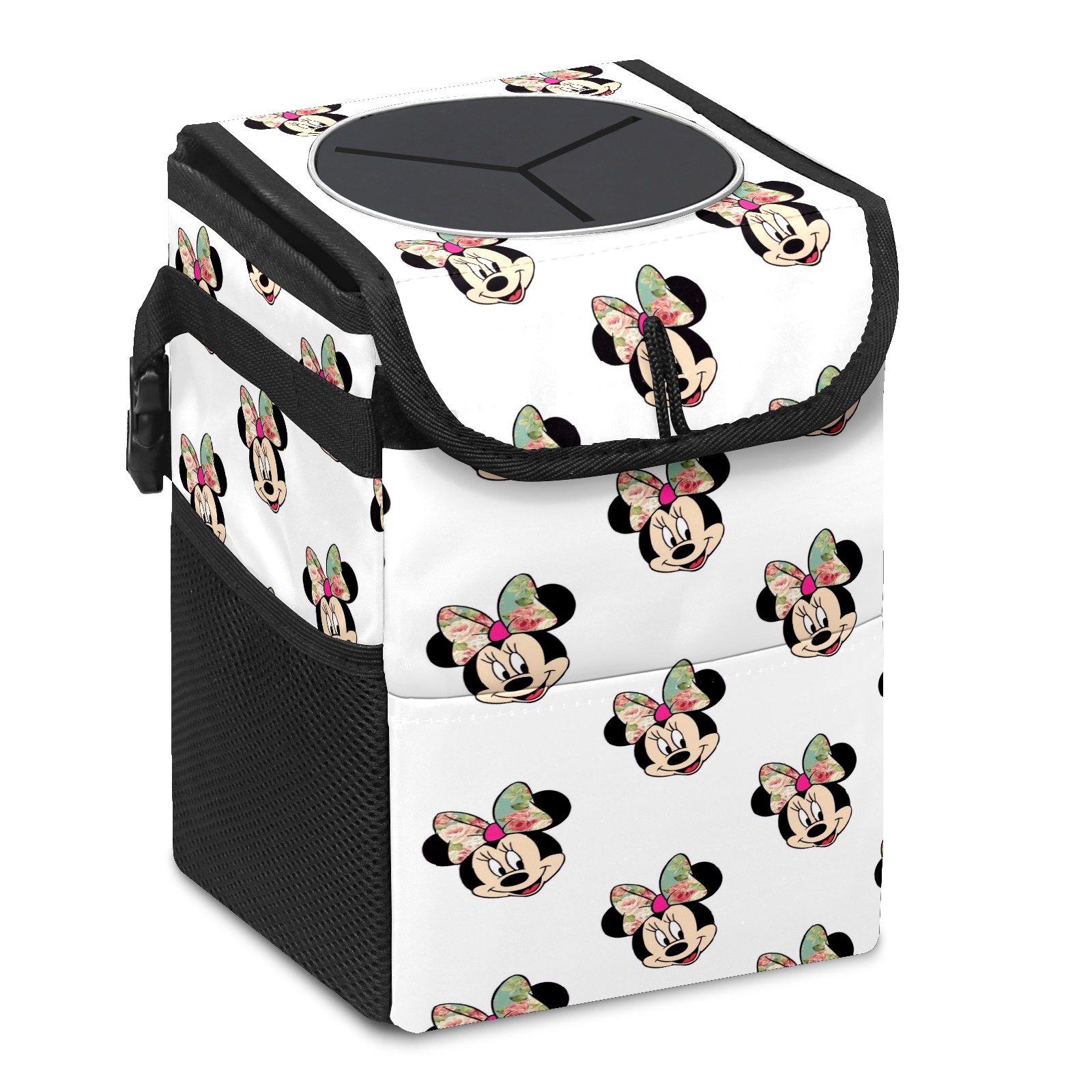 Car Trash Can with Lid, Small Portable Hanging Automotive Garbage Bin for Vehicles, Leakproof Waste Bag Container for SUV Truck Van Interior Auto Travel Road Trips(Mickey Mouse Minnie With Bow (1))
