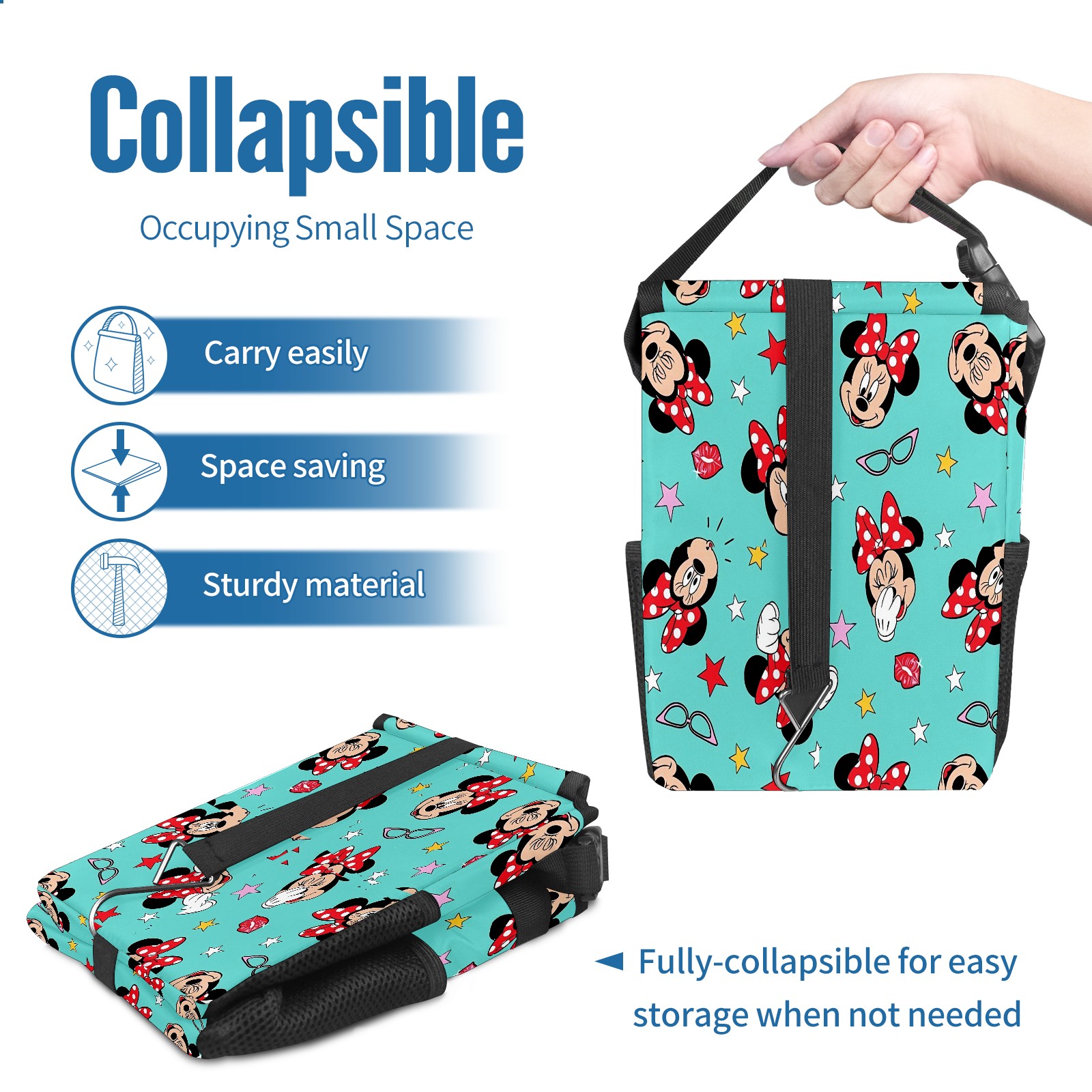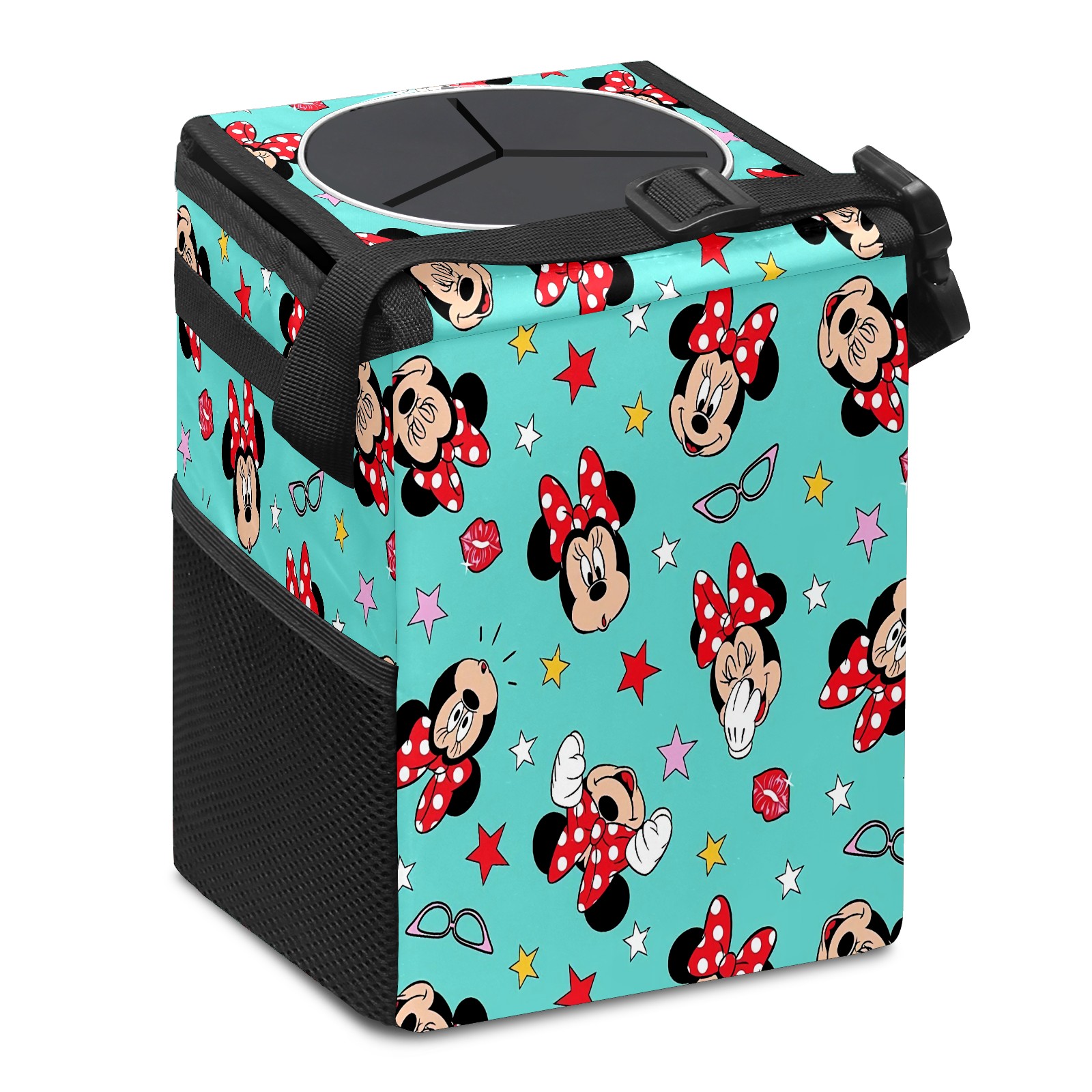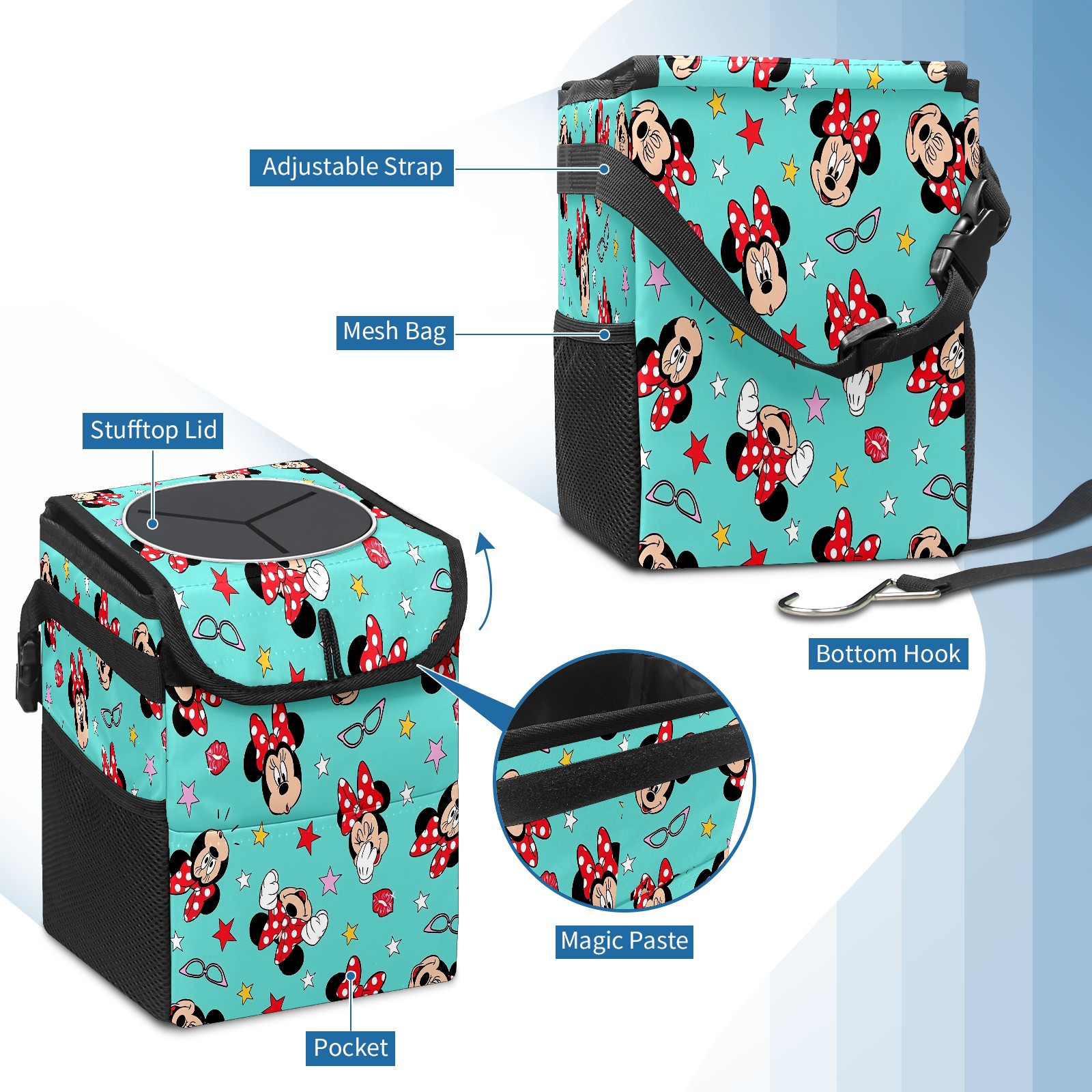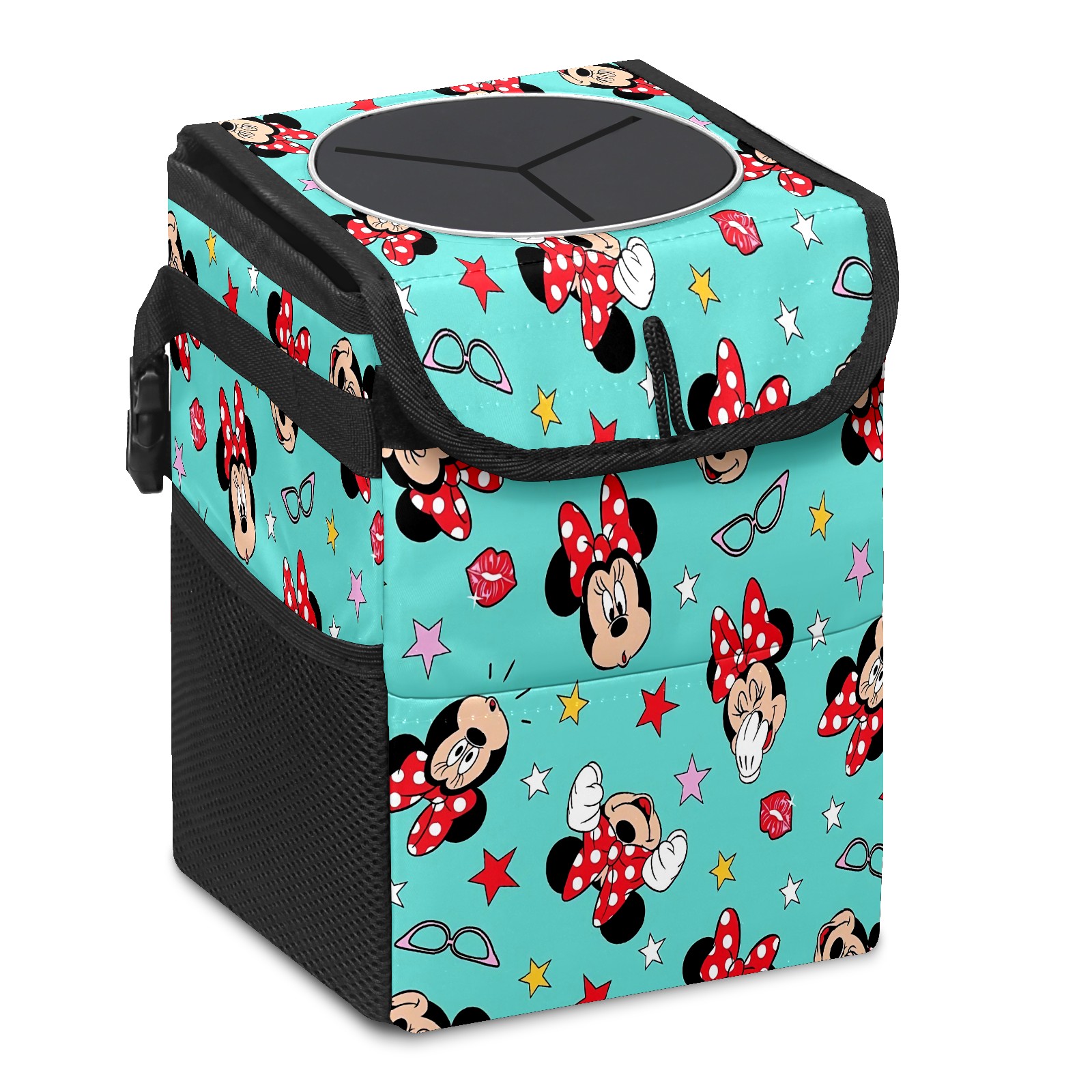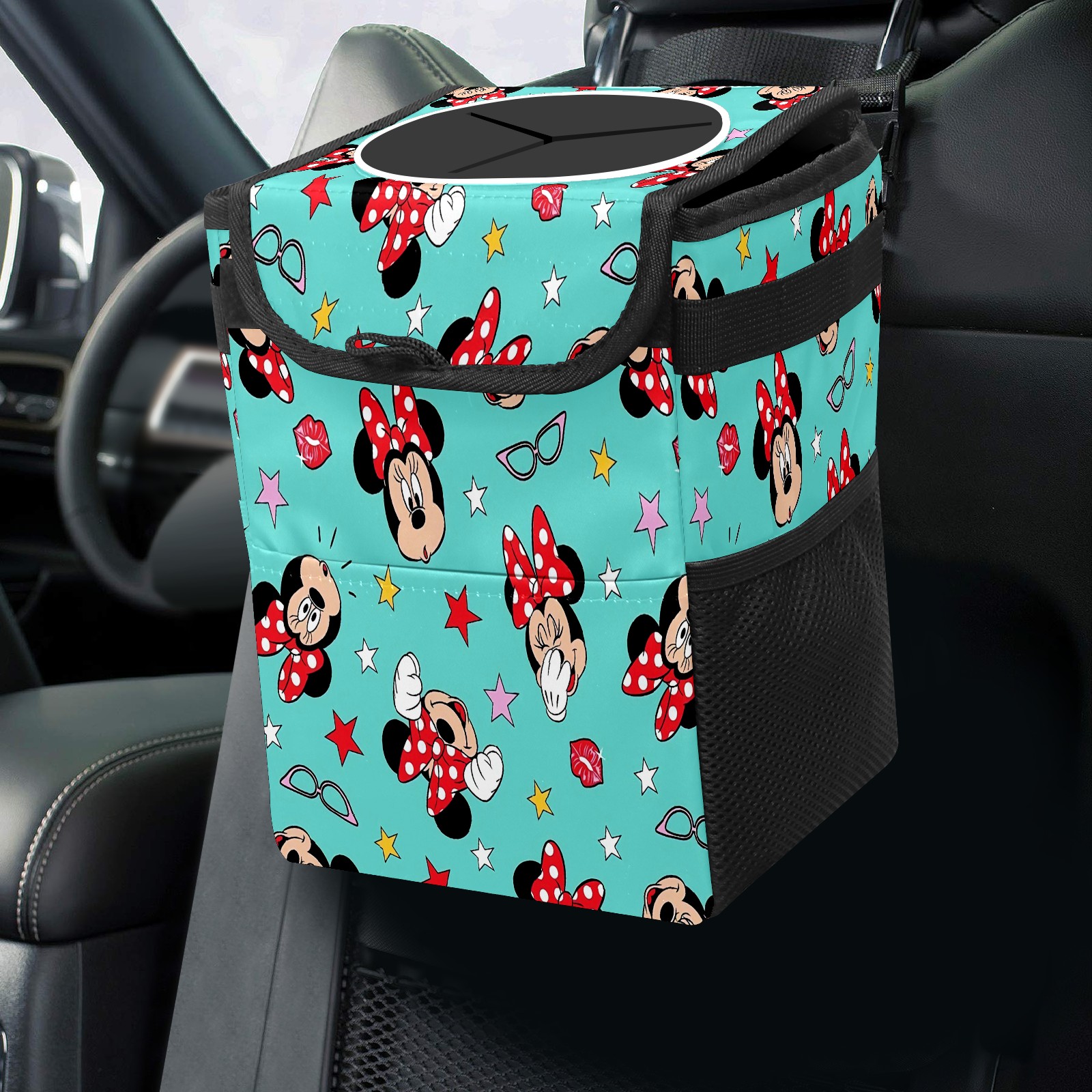 Car Trash Can with Lid, Small Portable Hanging Automotive Garbage Bin for Vehicles, Leakproof Waste Bag Container for SUV Truck Van Interior Auto Travel Road Trips(Mickey Mouse Minnie (1))