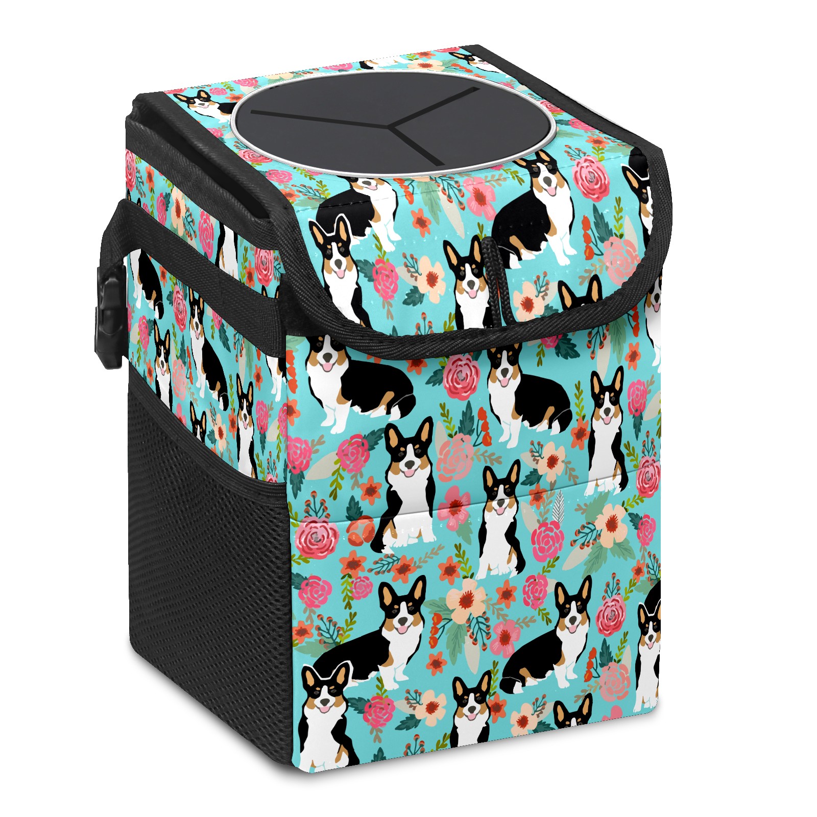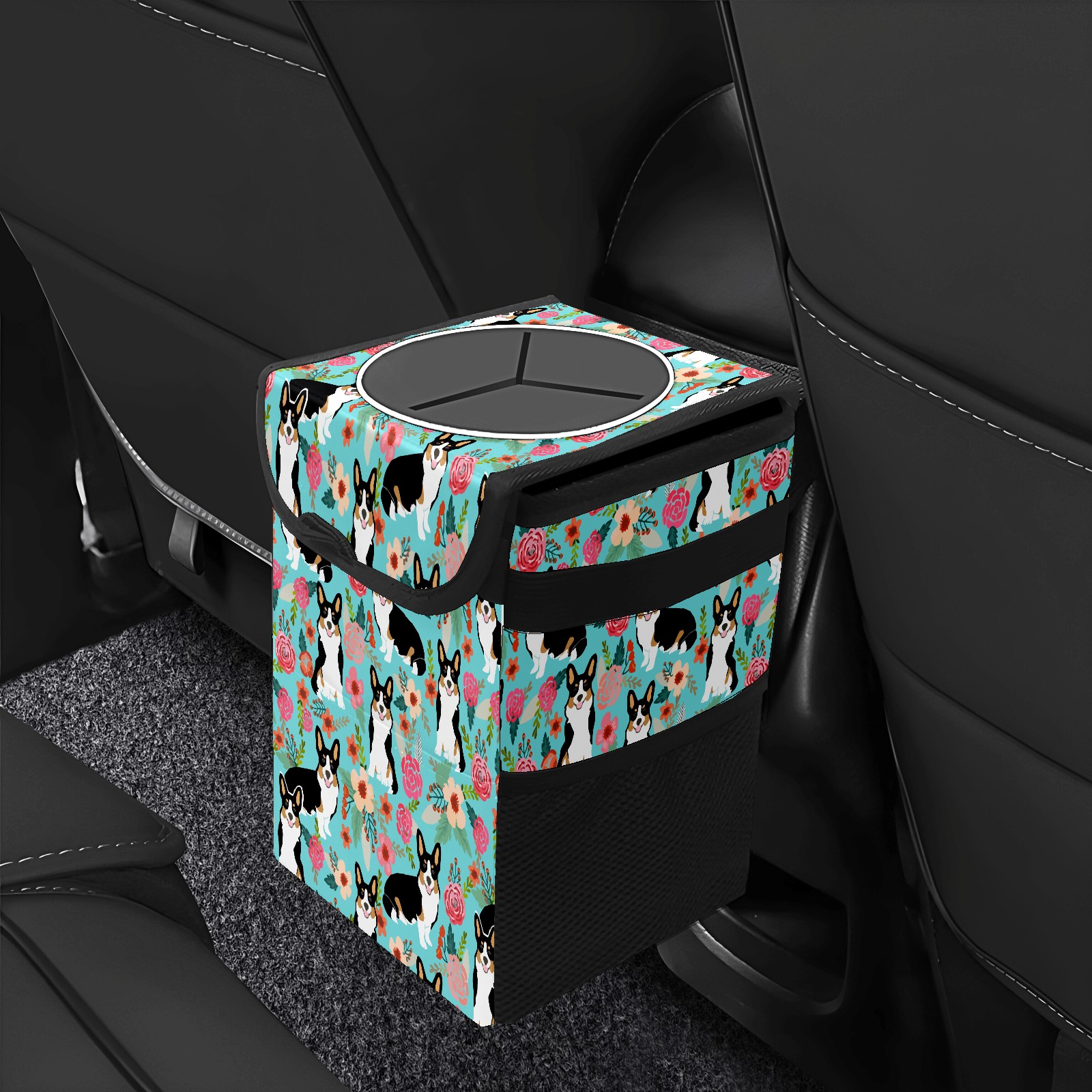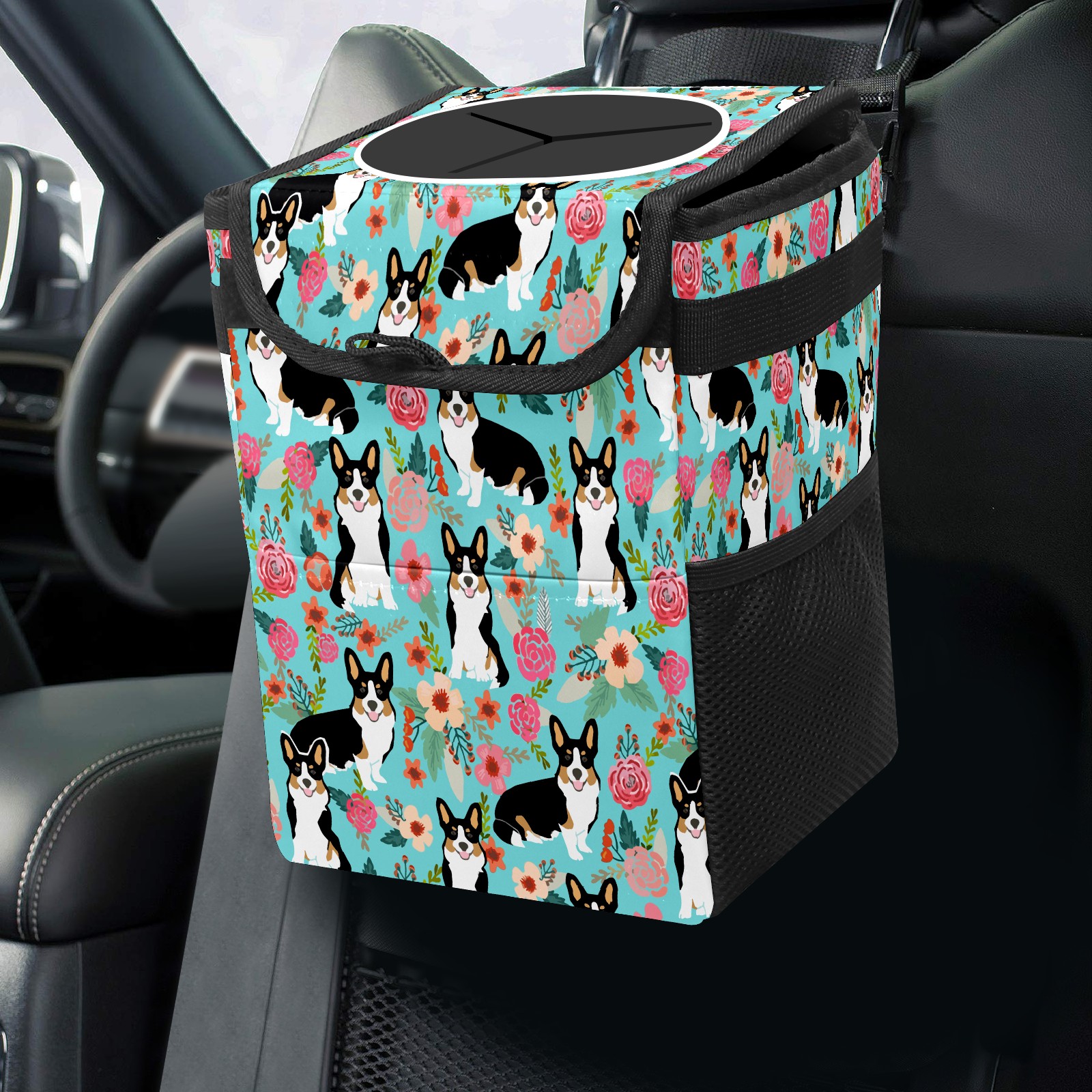 Car Garbage Can — Multi-functional, Lightweight Portable, Reusable Vehicle Trash Can, Waterproof with Sufficient Storage Capacity Lovely Corgi & Flowers