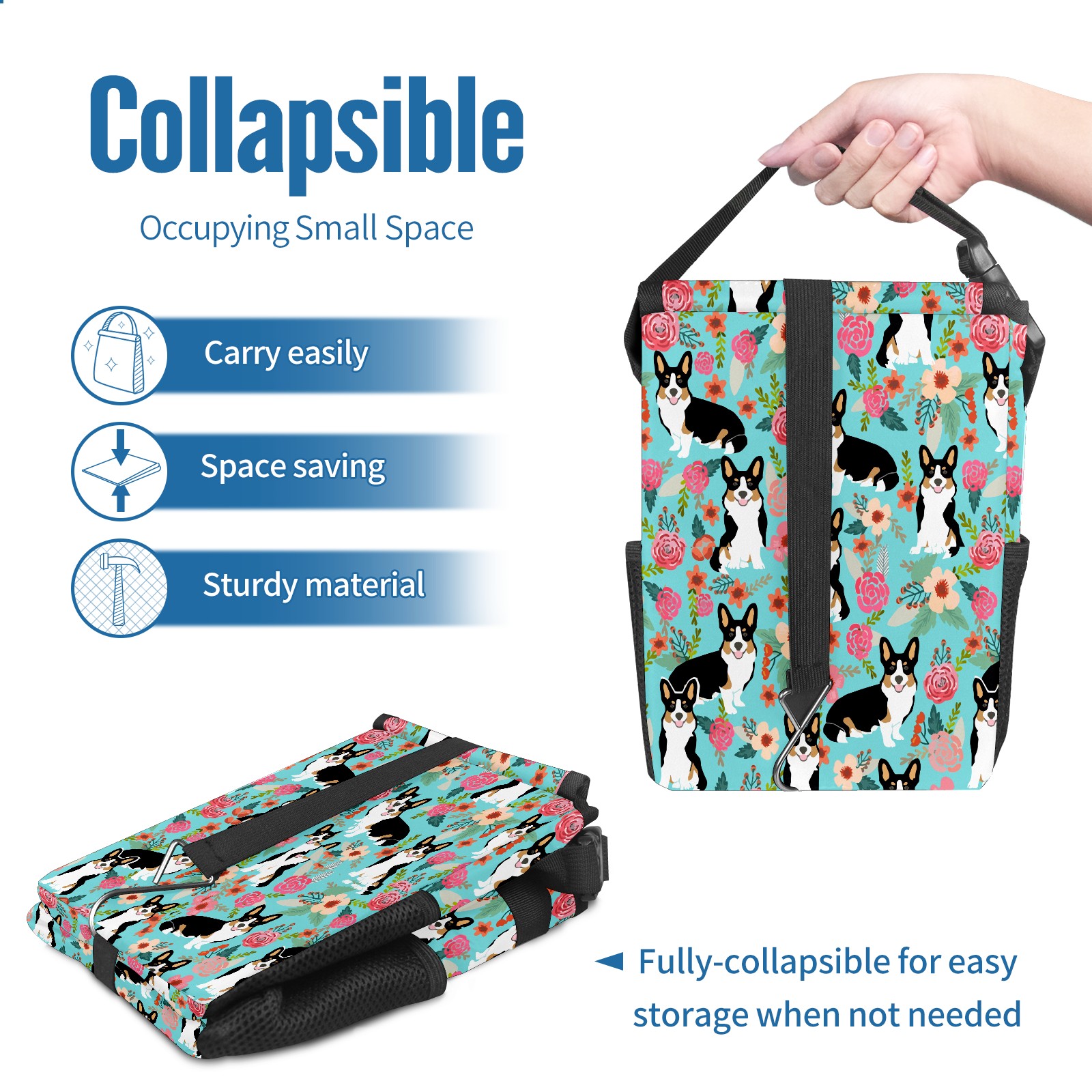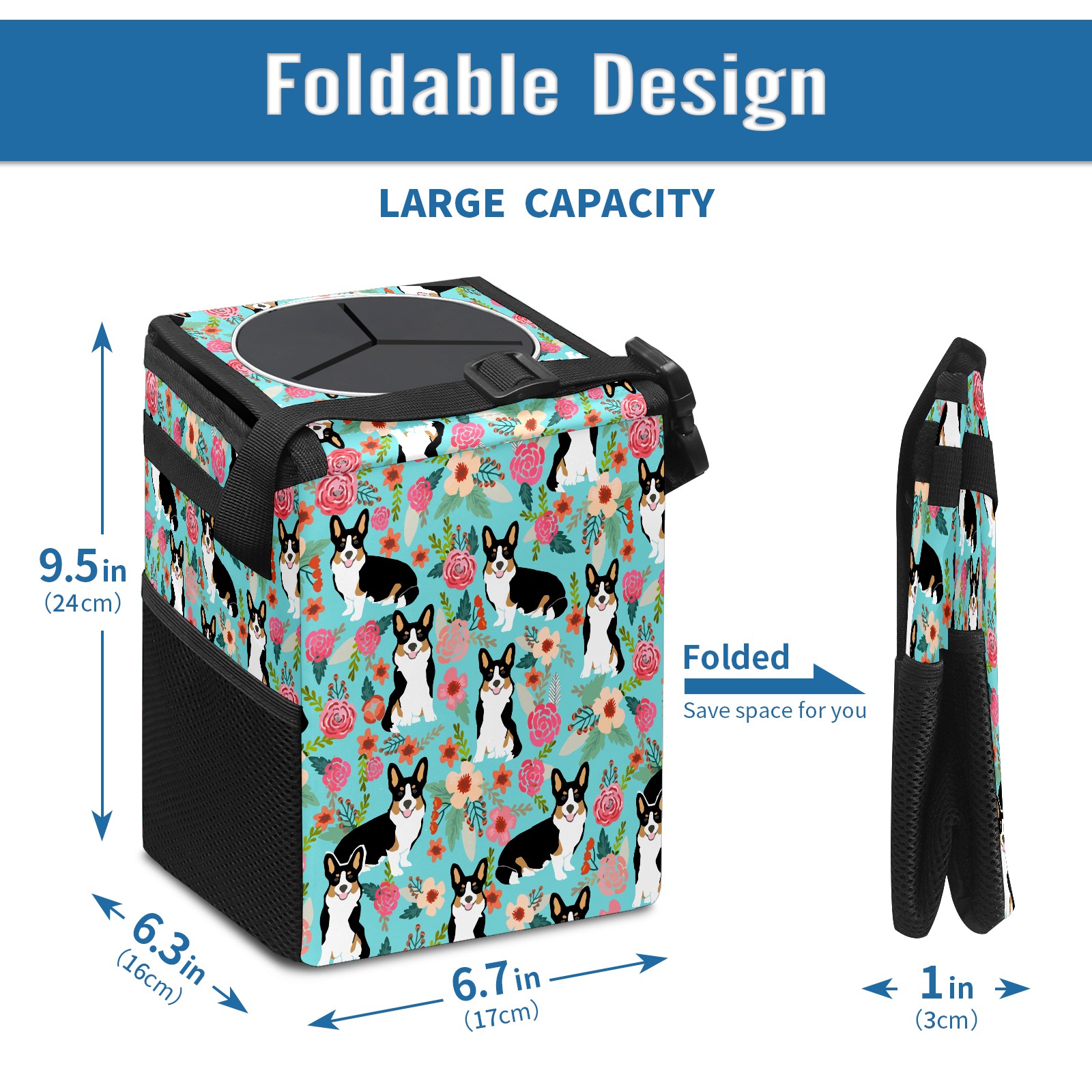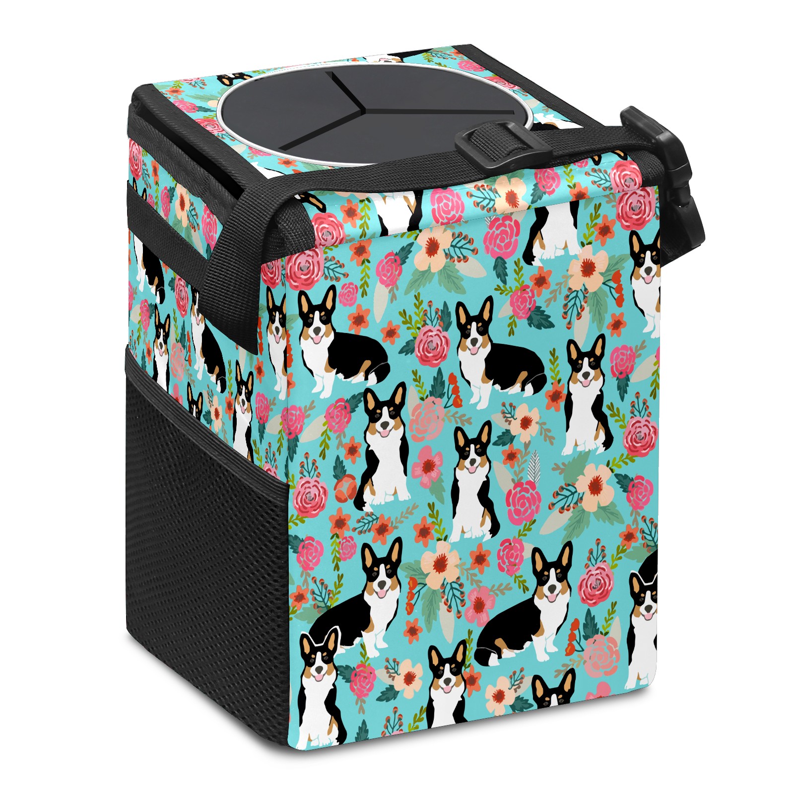 Car Garbage Can — Multi-functional, Lightweight Portable, Reusable Vehicle Trash Can, Waterproof with Sufficient Storage Capacity Lovely Corgi & Flowers